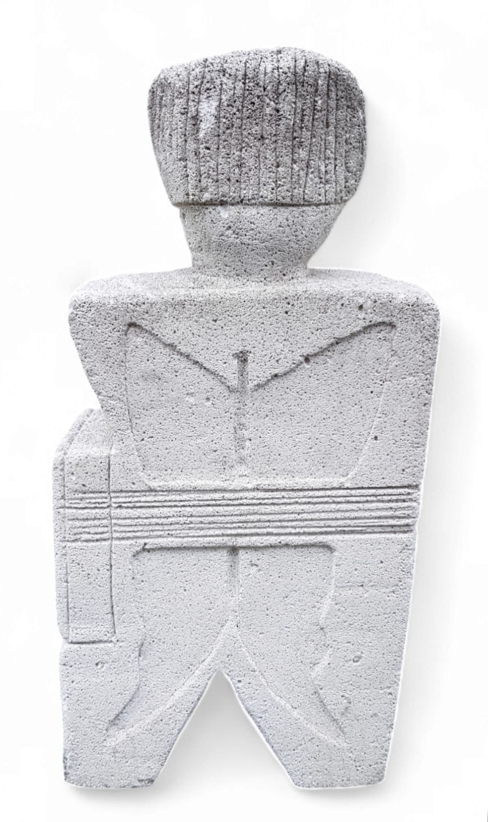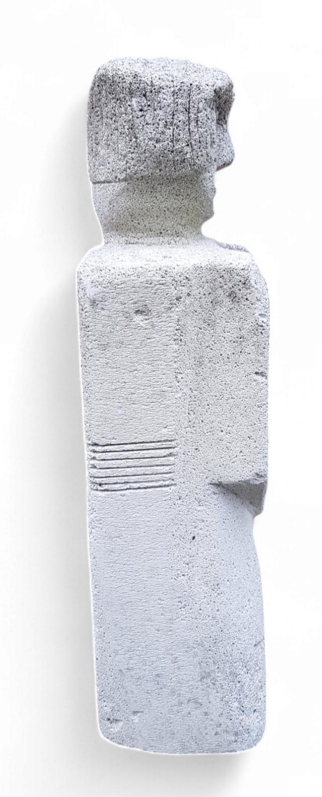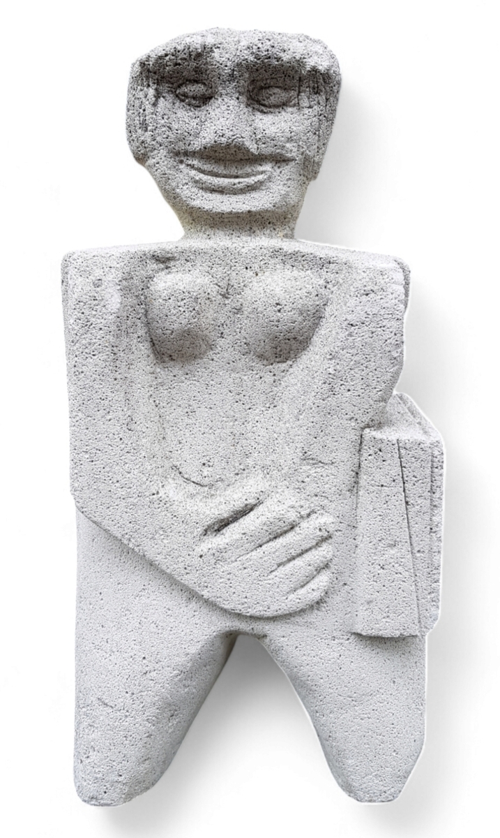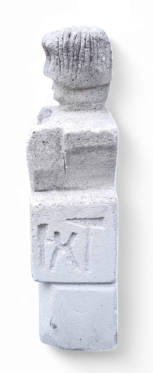 Beeld van een hurkende vrouw in primitieve stijl, gevormd uit een gasbetonblok. Aan de zijkant gemerkt, eind 20e eeuw. |