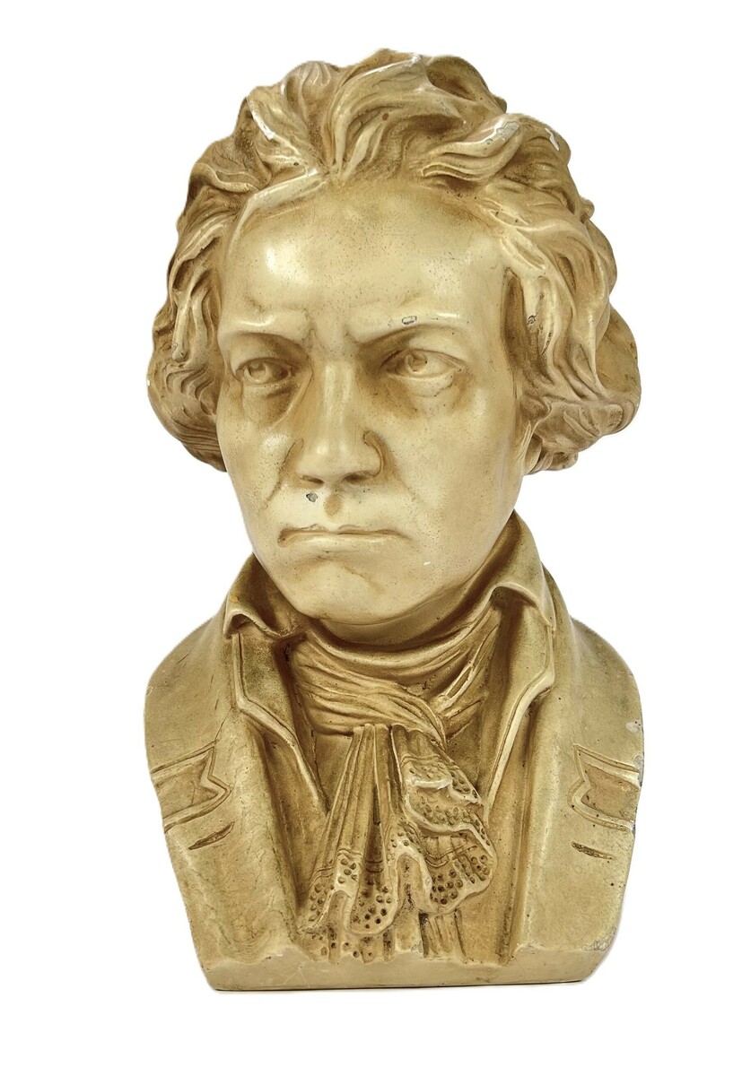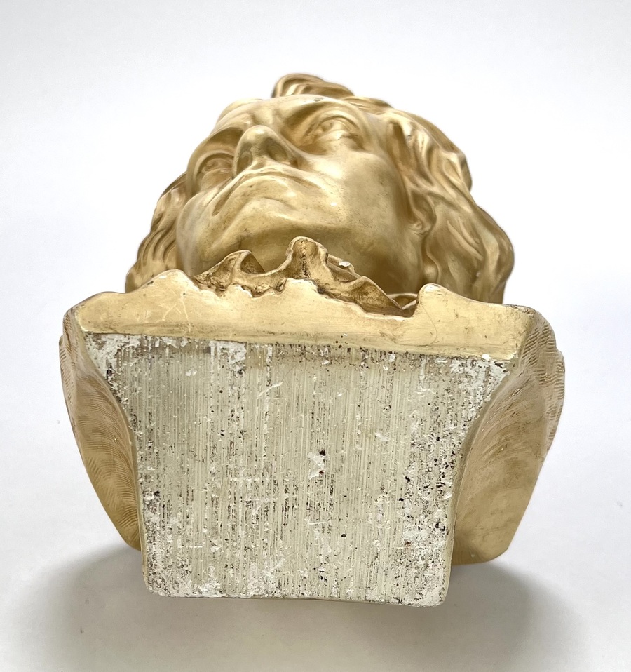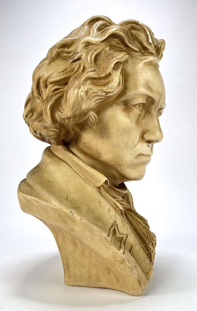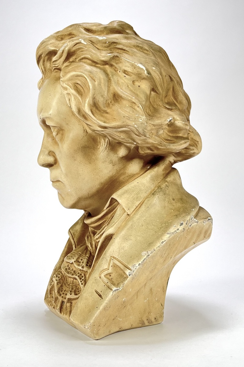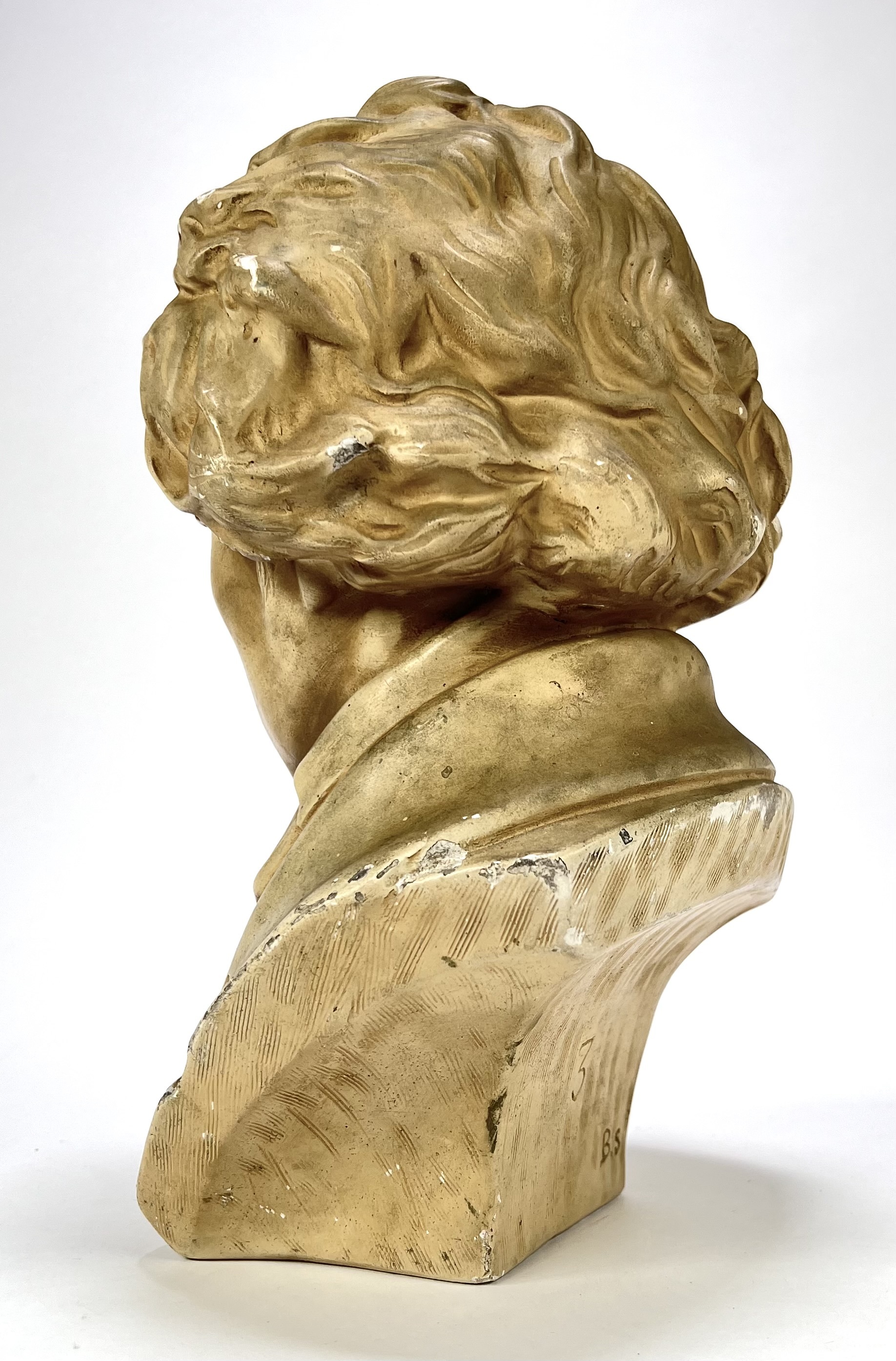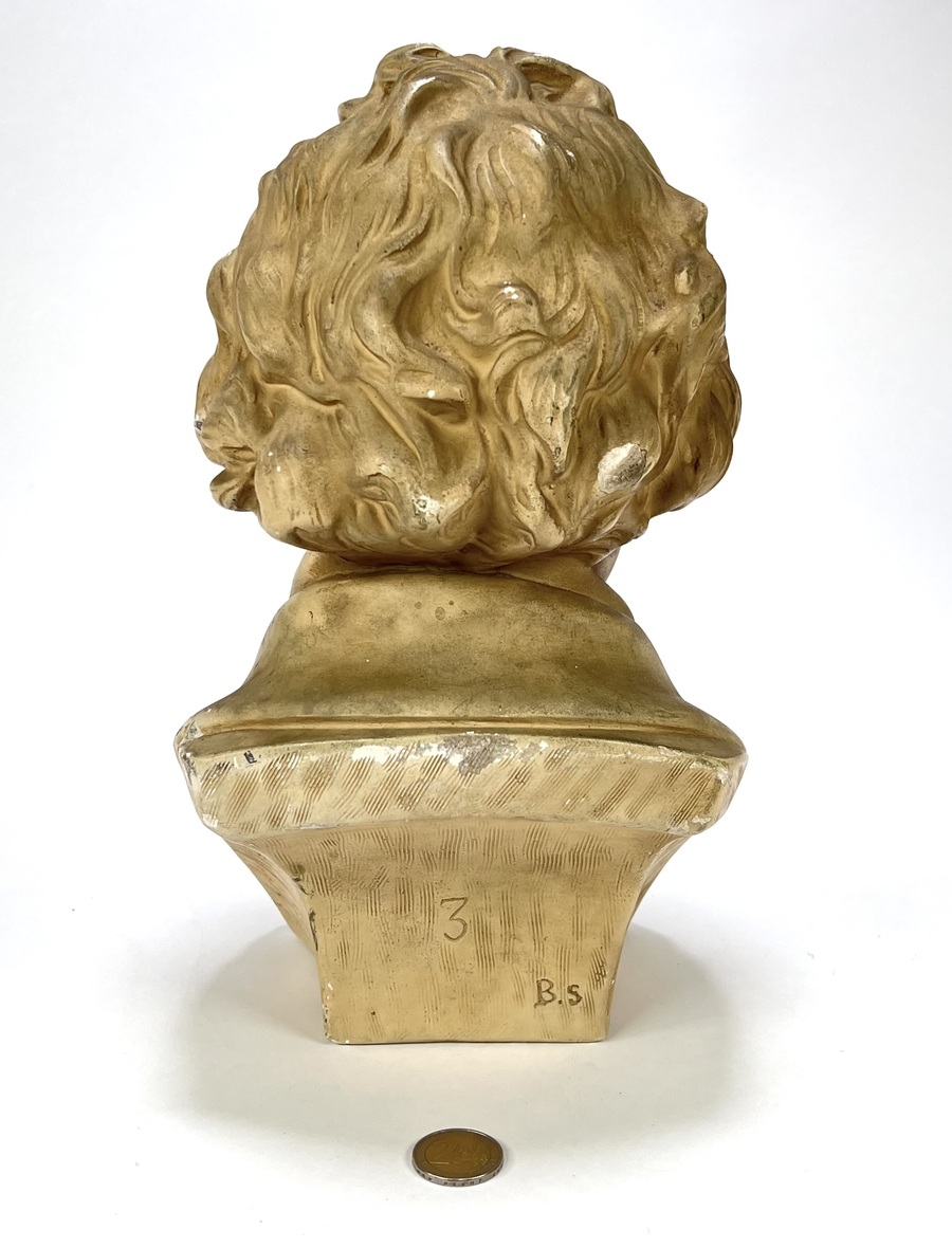 Gipsen beeld van de componist Beethoven. Aan de achterzijde gemonogrammeerd B.S. en genummerd, vierde kwart 20e eeuw. |
