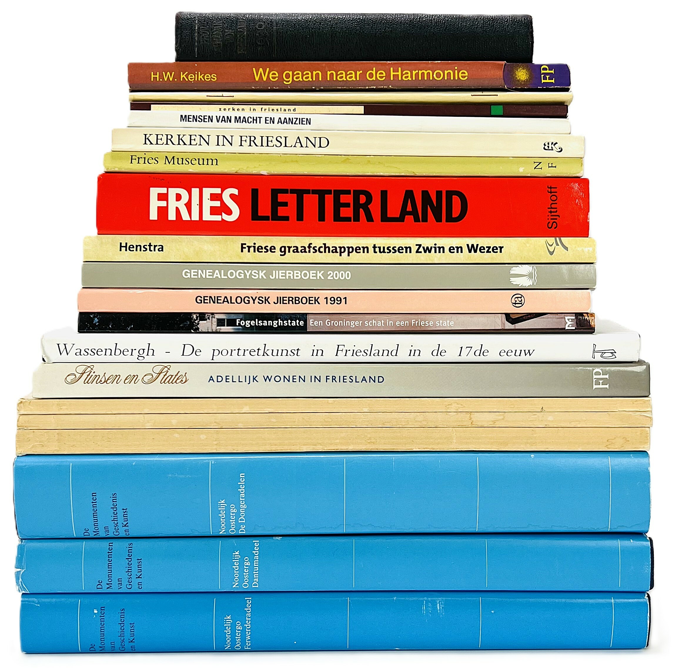 Convoluut van negentien boeken over Friesland waaronder Adelijk wonen in Friesland, De monumenten van Geschiedenis en Kunst, Fries Letterland en Kerken in Friesland. 20e eeuw. |