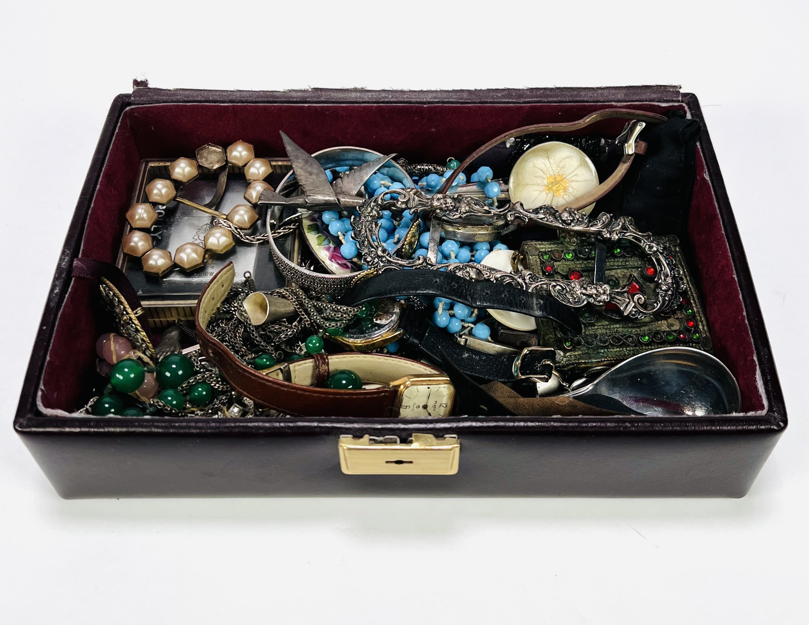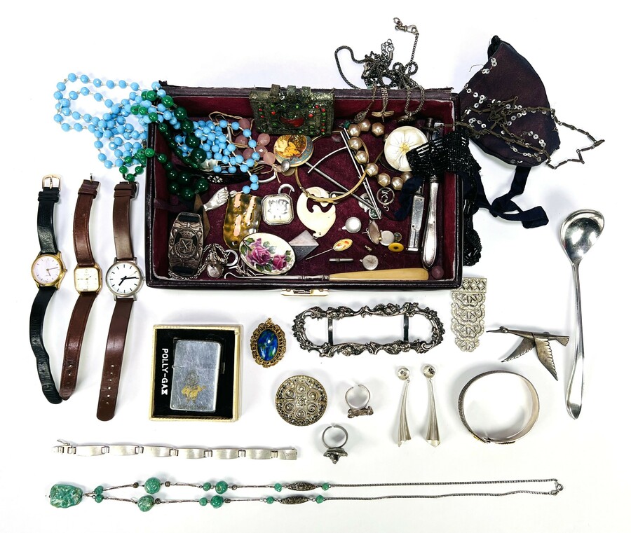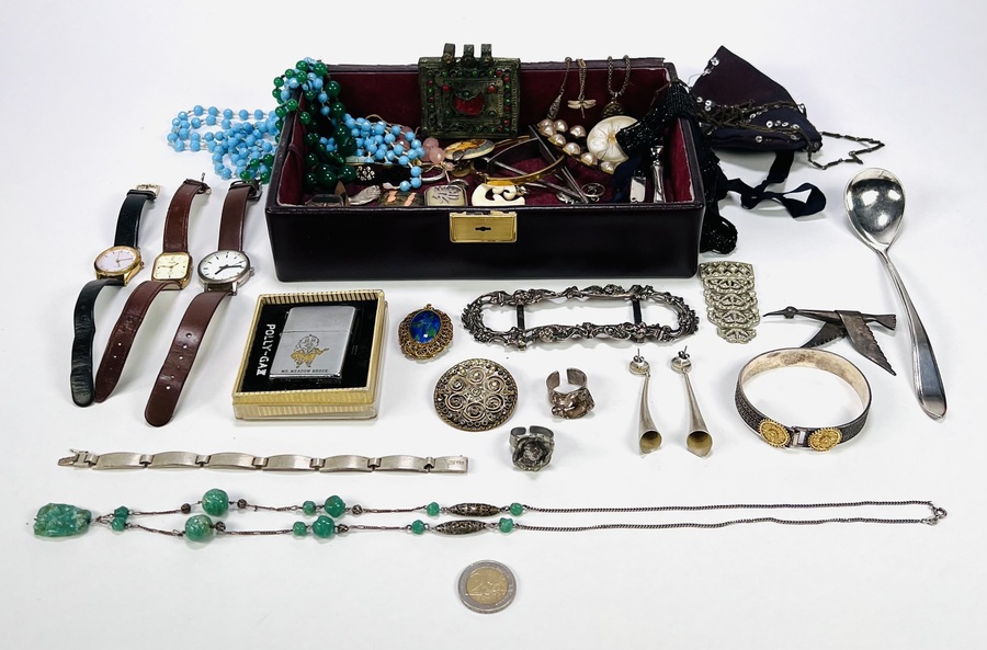 Convoluut sieraden met onder meer broches, halskettingen, ringen, hangers, armbanden, polshorloges, Zippo aansteker en gespen. |