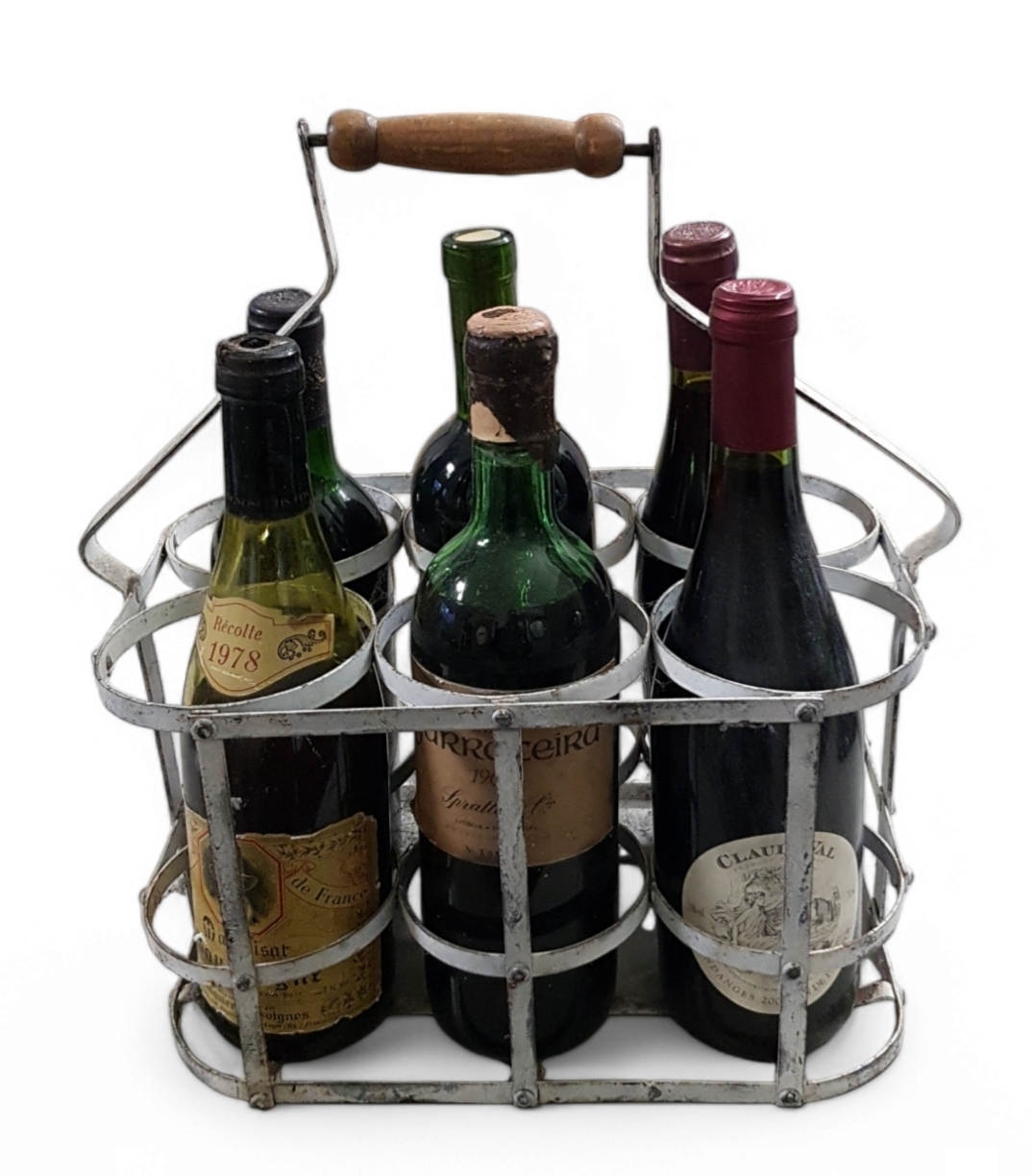 Metalen flessenrek met zes flessen rode wijn, 20e eeuw. |