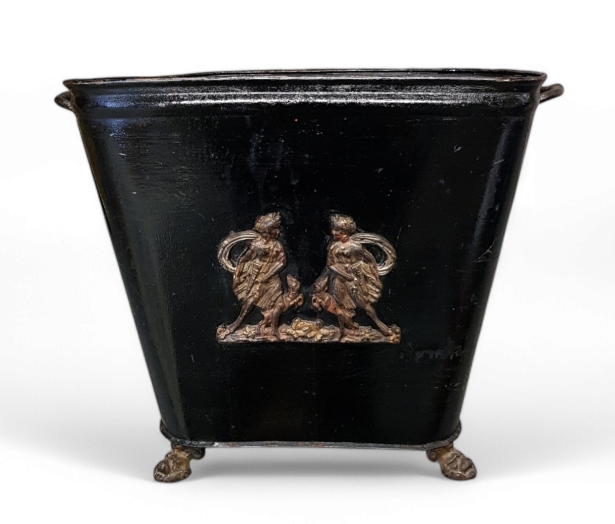 Zwarte ijzeren hout/turfbak met goudkleurig gepatineerde gietijzeren applicaties. Eerste helft 20e eeuw. |
