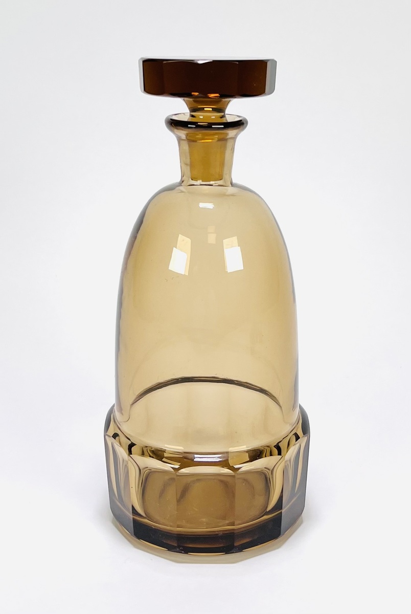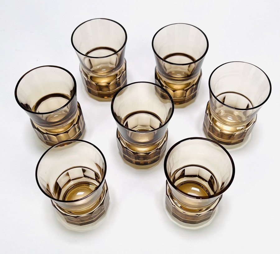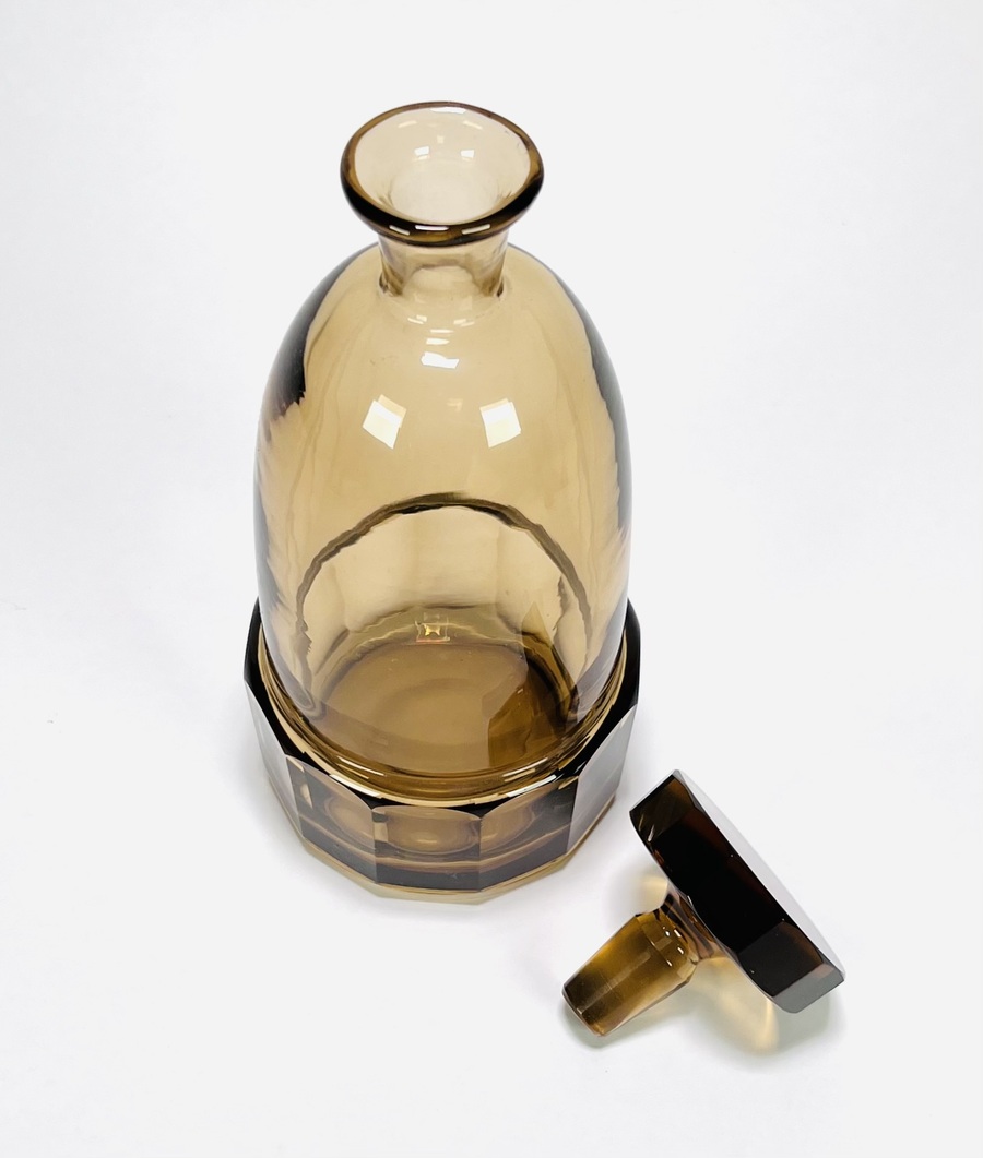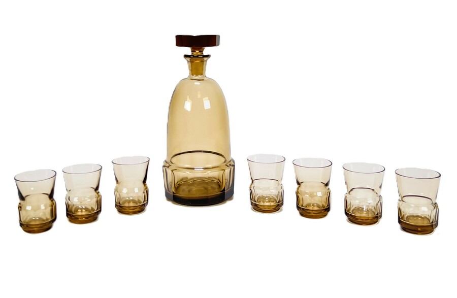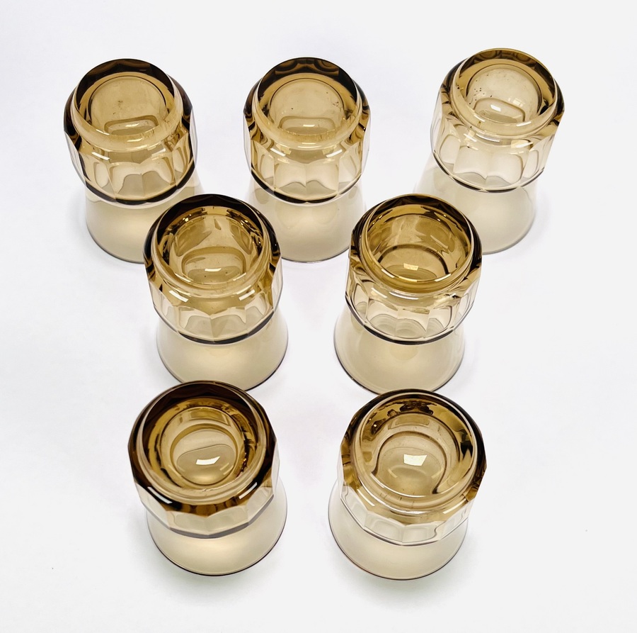 Art Deco glazen rookkleurige likeurstel bestaande uit karaf en zeven glaasje. Glaasjes aan de onderzijde gemerkt Tchecoslovaquie. Bohemen, jaren 30. |