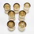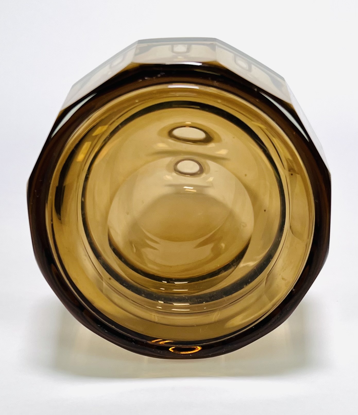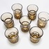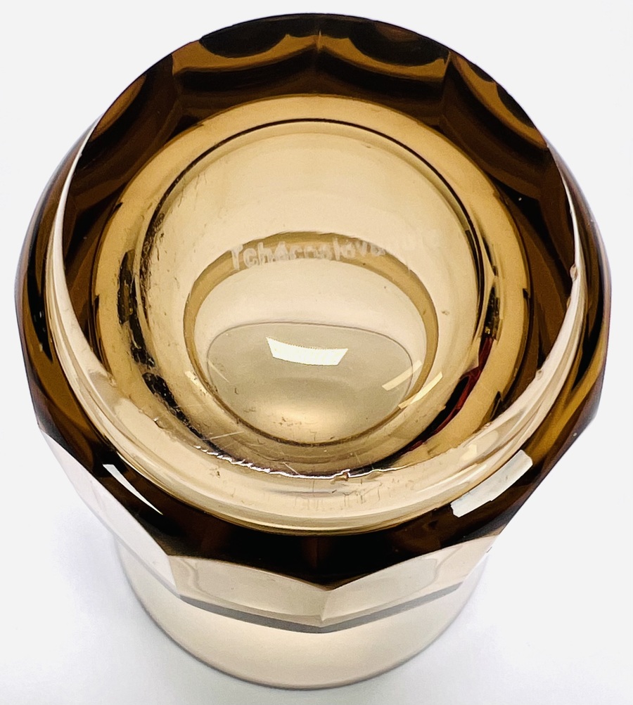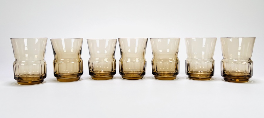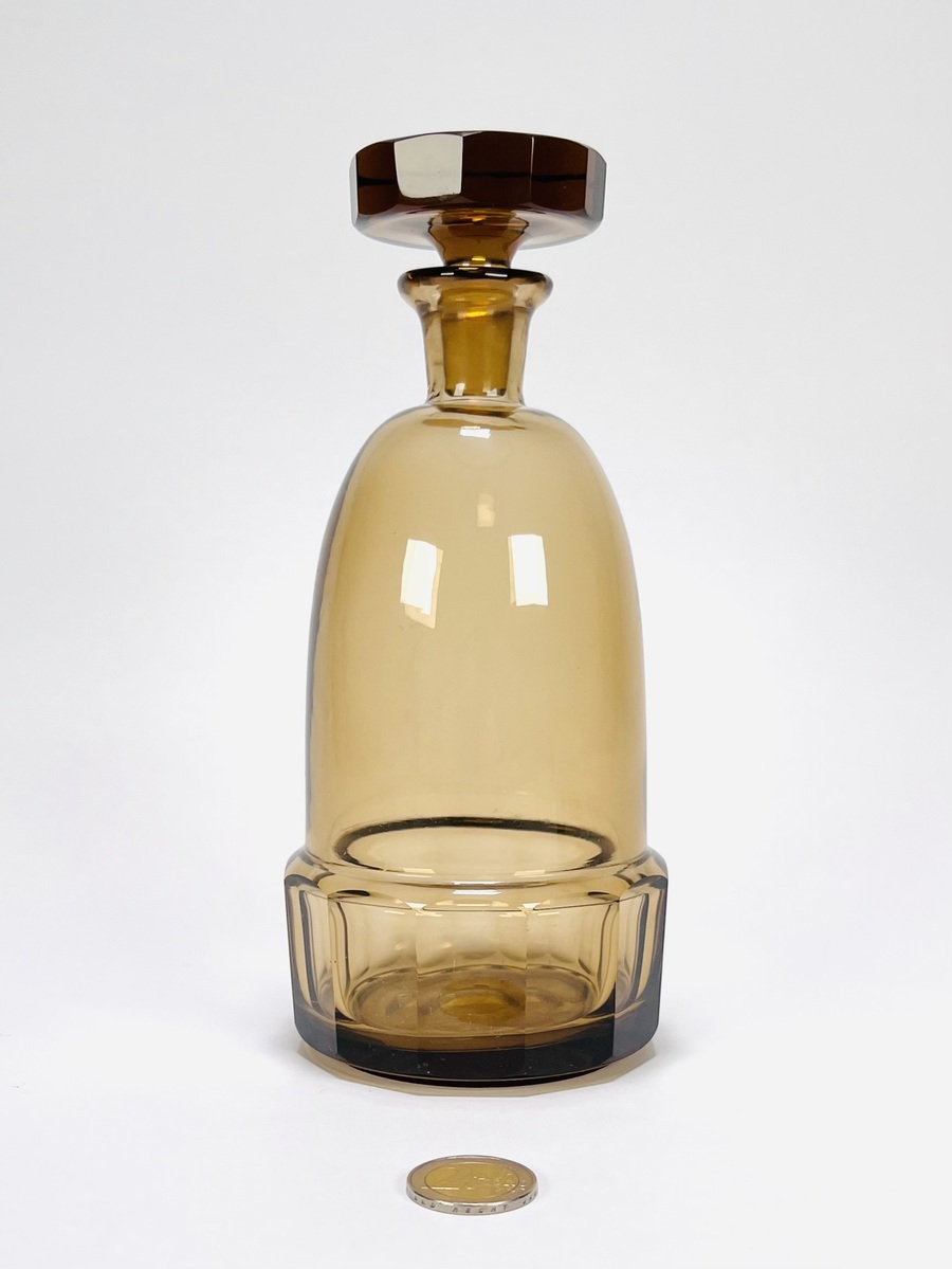 Art Deco glazen rookkleurige likeurstel bestaande uit karaf en zeven glaasje. Glaasjes aan de onderzijde gemerkt Tchecoslovaquie. Bohemen, jaren 30. |