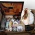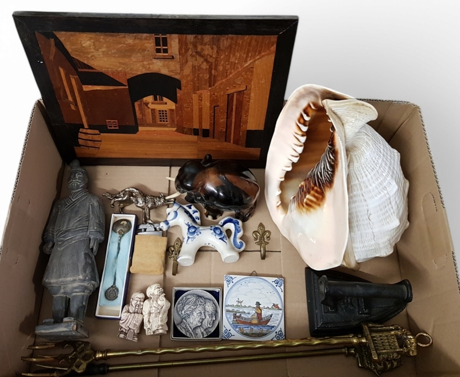 Convoluut curiosa met onder meer een beeldje aardewerk China, hardhouten beeldje olifant, schelp, Delfts Blauw paard beeldje, penning gouden huwelijk Juliana en Bernard 1987, gietijzeren strijkbout, messing hardste attributen, Ronson aansteker, wolf beeldje Rochefort en zilveren suikerlepel gemaakt van muntstukken Wilhelmina. 20e eeuw. |
