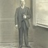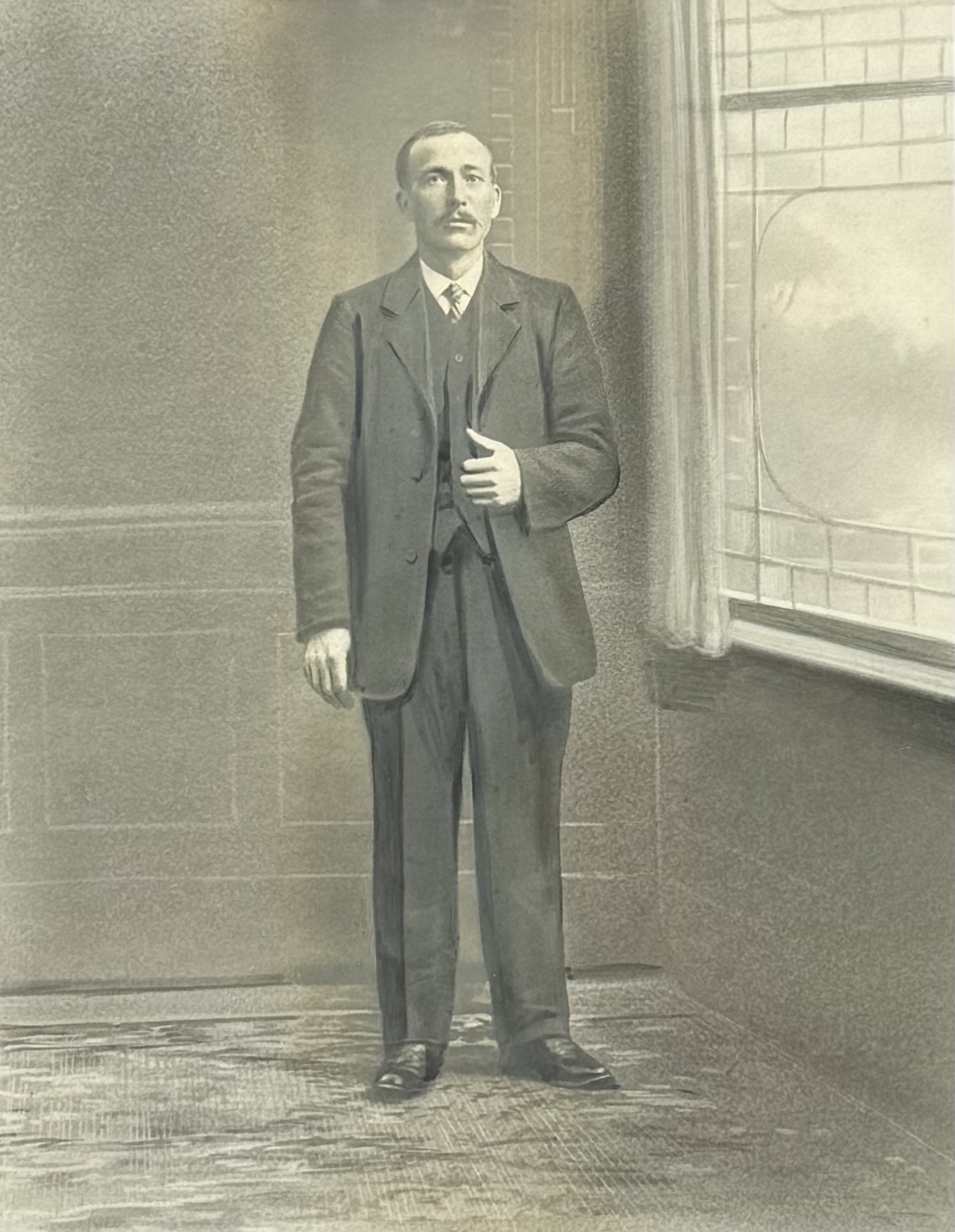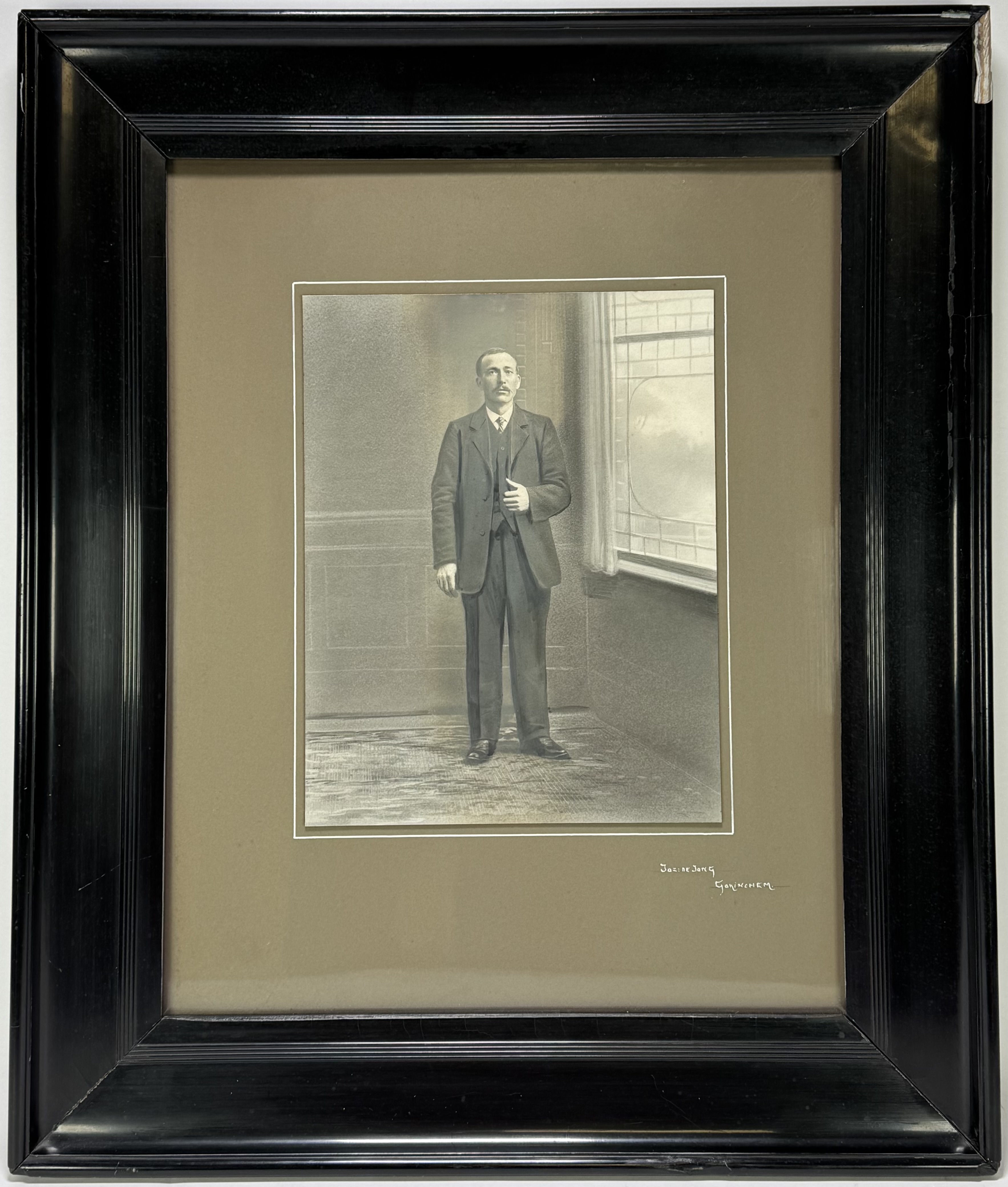 Foto van man in pak staand bij venster, deels geretoucheerd. Begin 1900. |