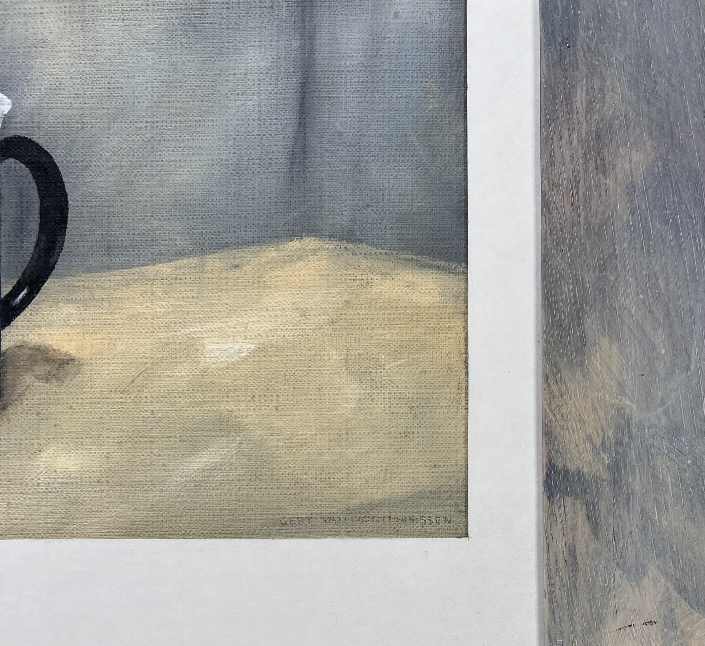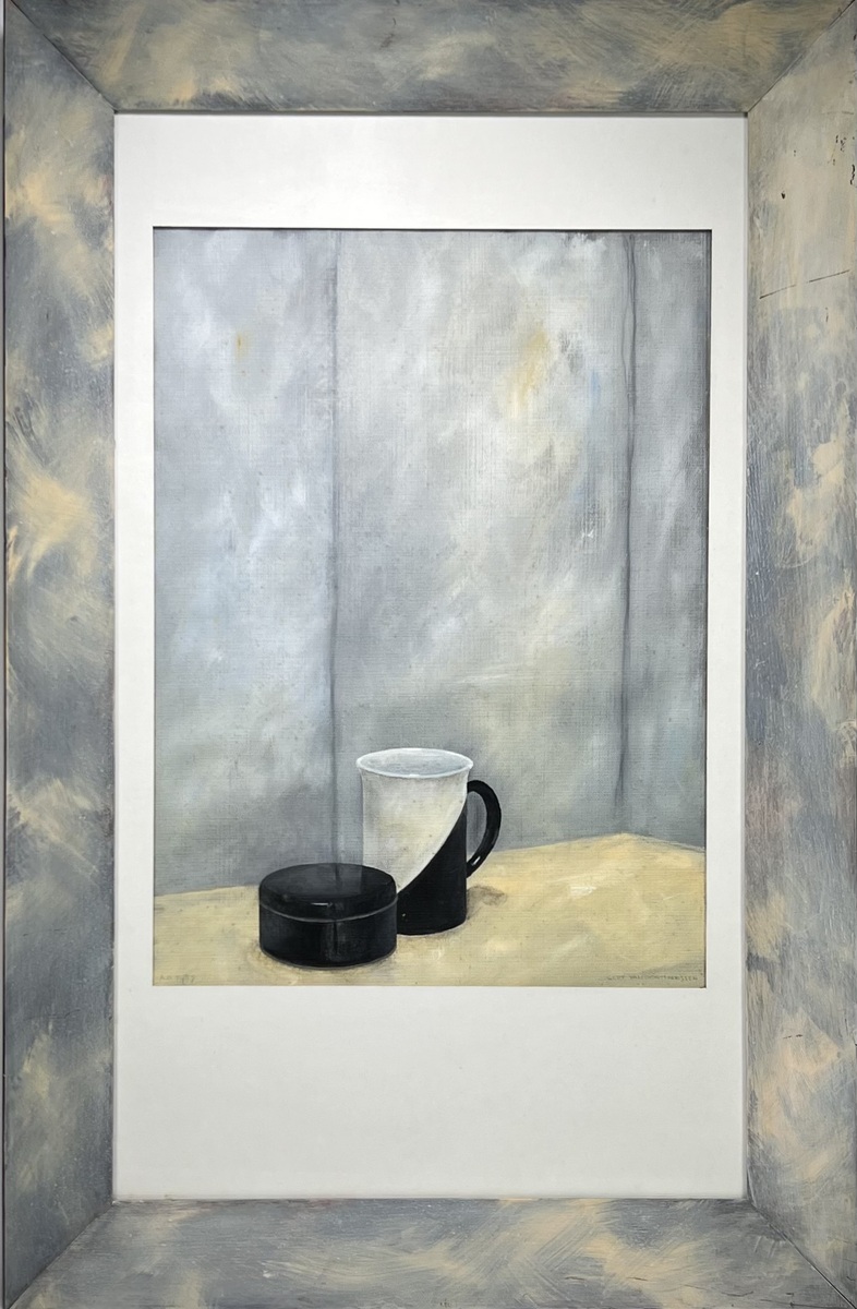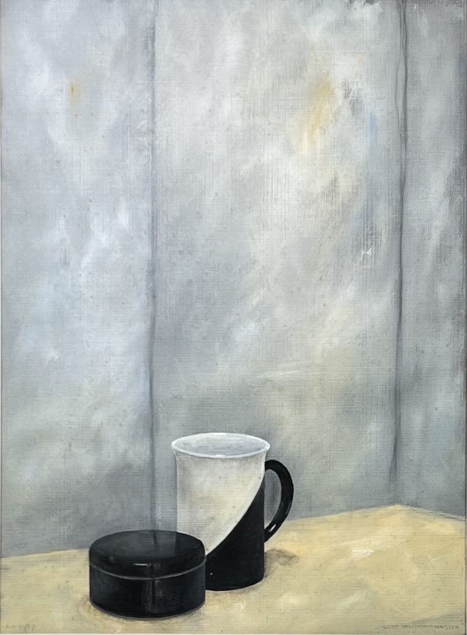 Schilderij van een stilleven met mok en dekseldoos door Gert van Oortmerssen (1963). Acrylverf op schilderslinnen, rechtsonder voluit met potlood gesigneerd. Eind 20e eeuw. |