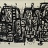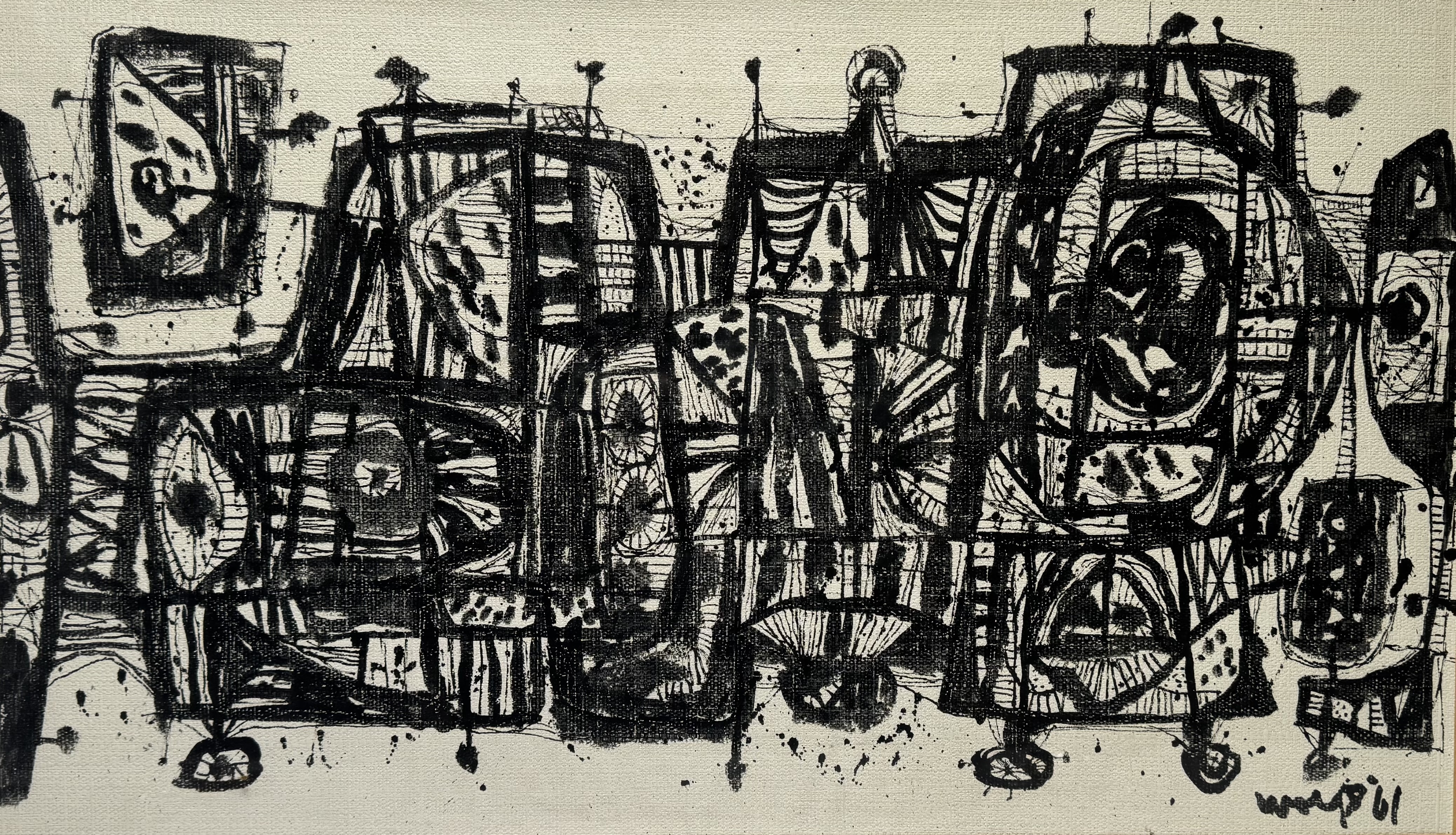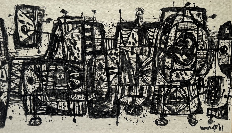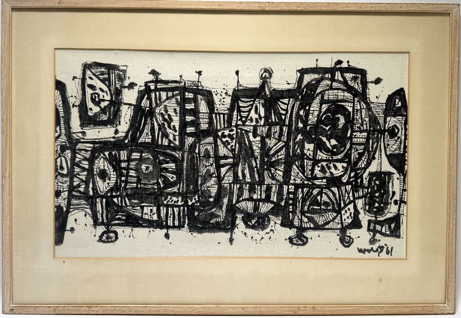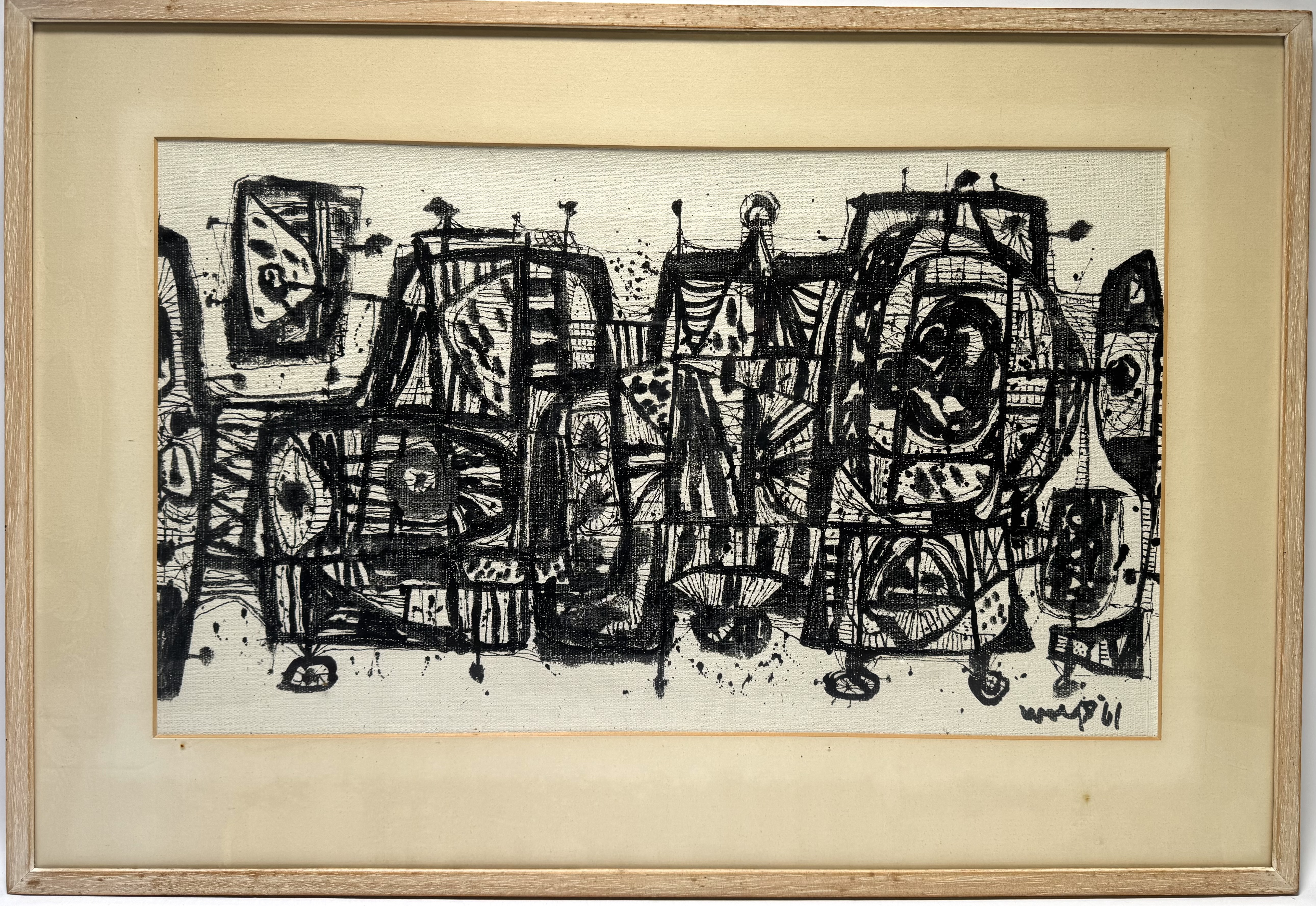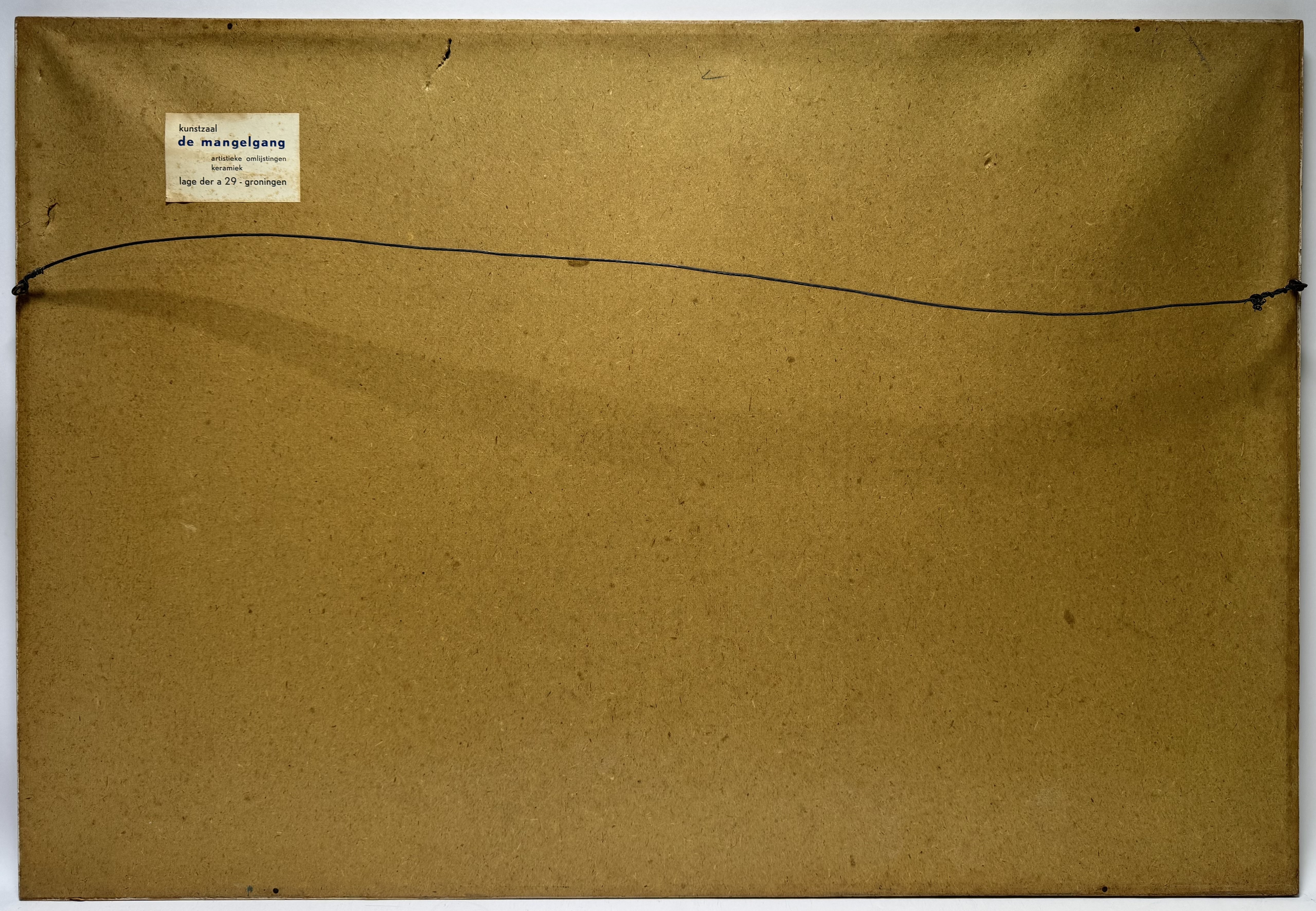 Schilderij met een abstracte voorstelling door Henri de Wolf (1938-1986). Rechtsonder gesigneerd rechtsonder en gedateerd 1961. |