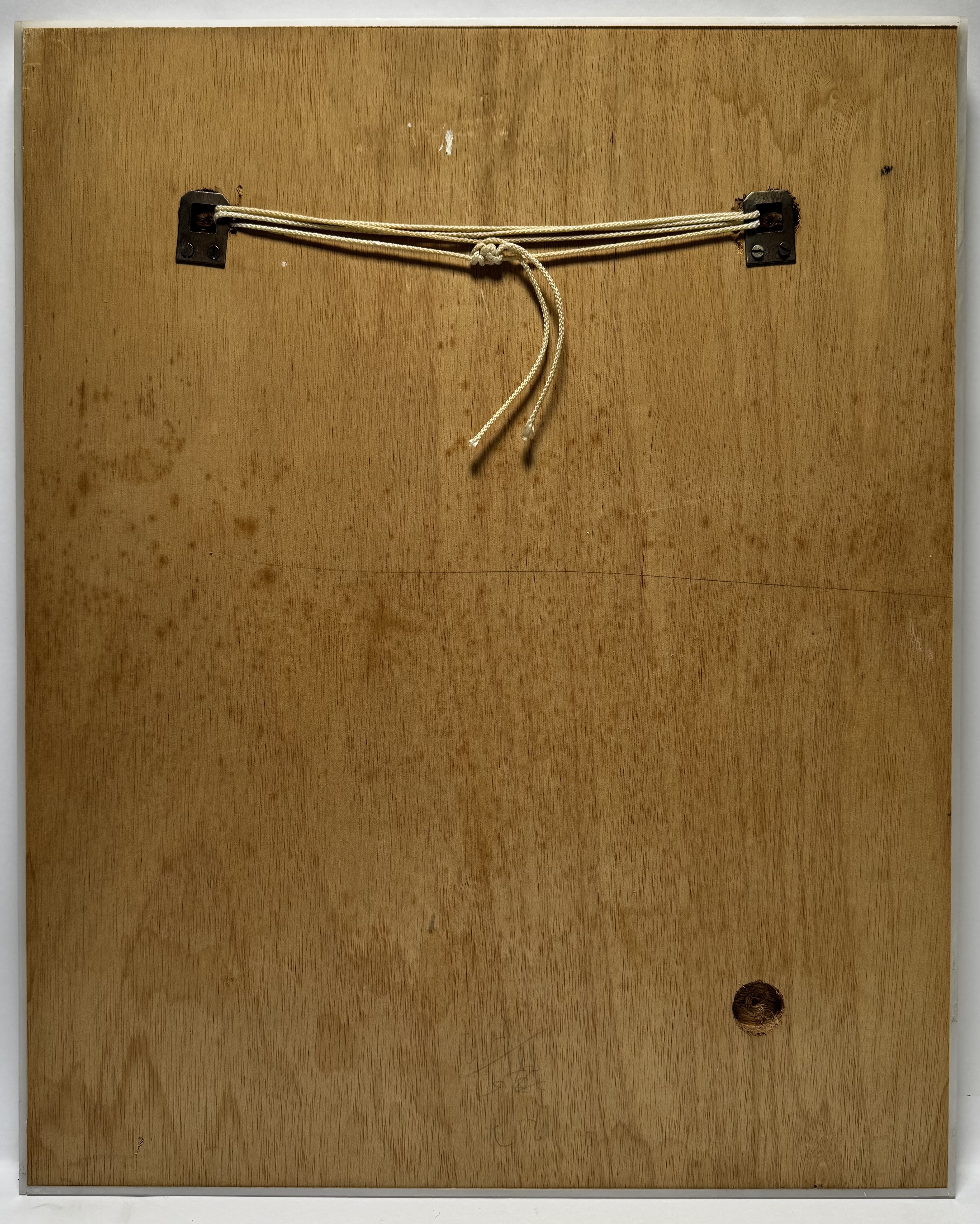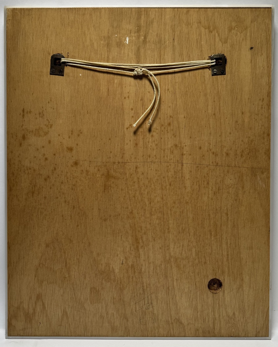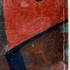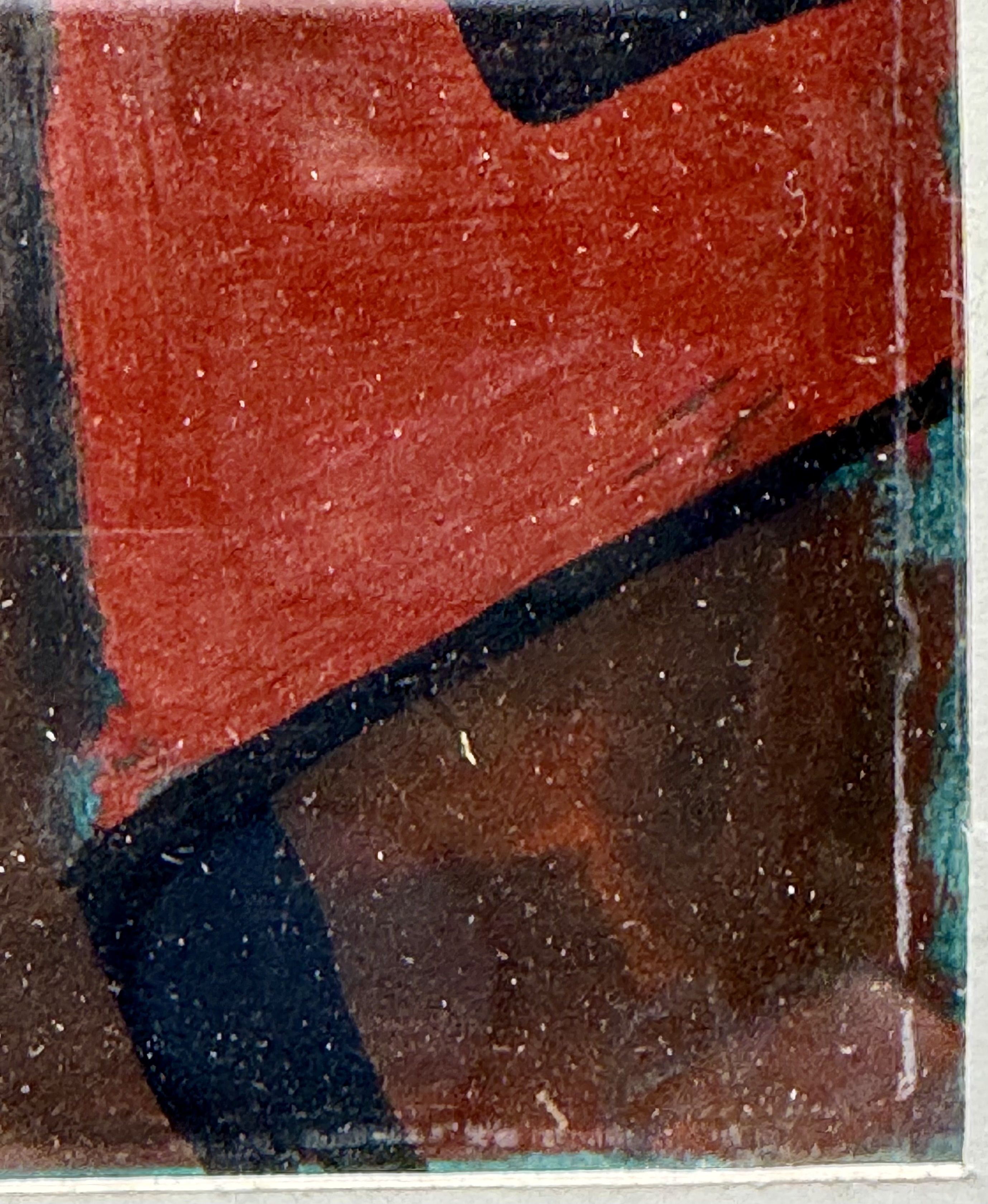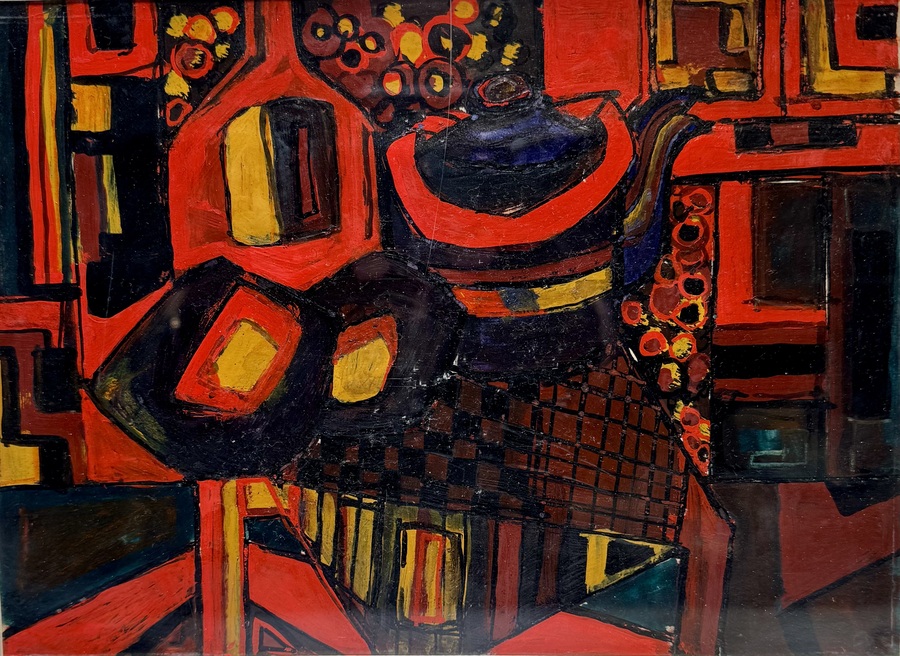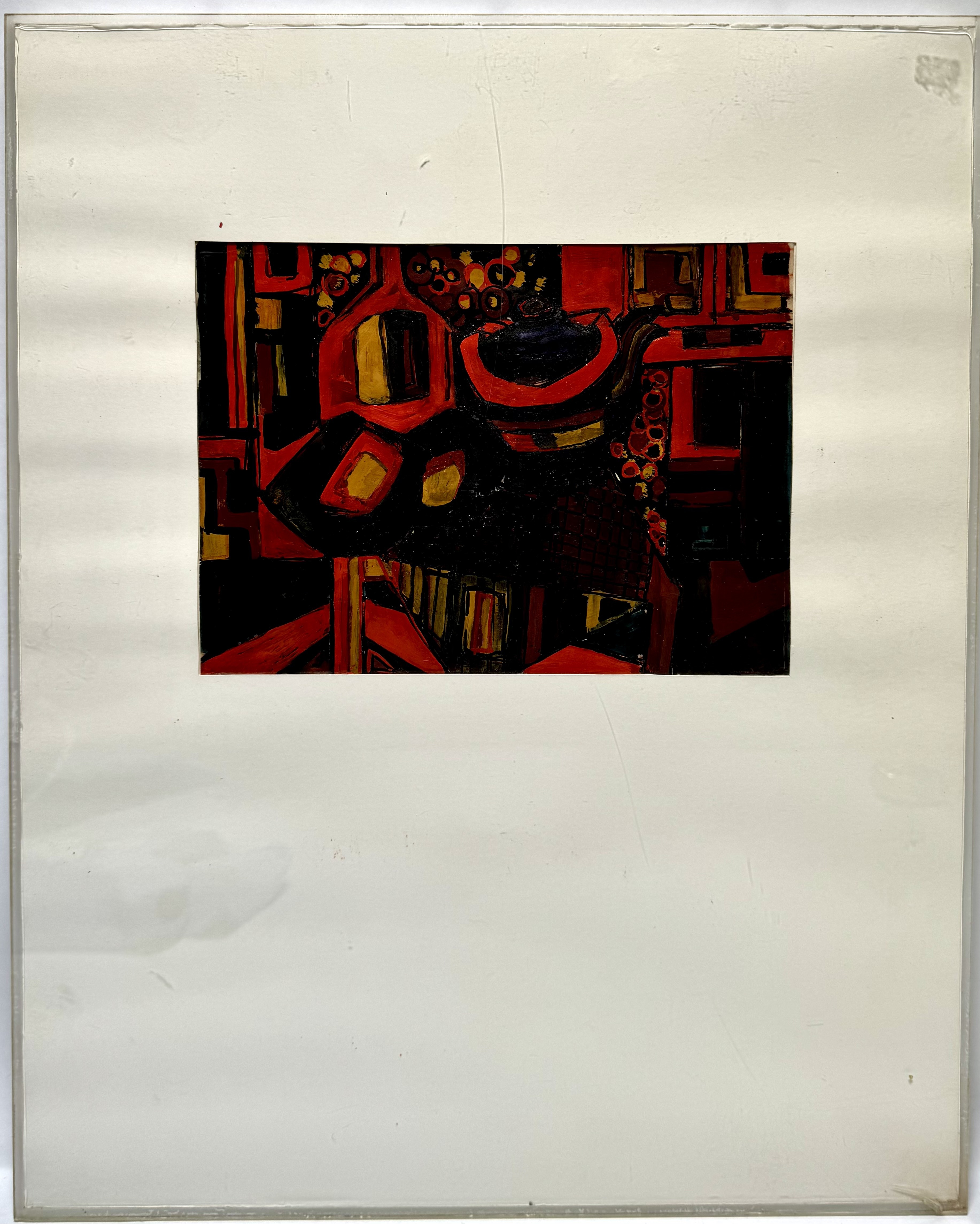 Schilderij met abstracte compositie. Plakaatverf op papier, rechtsonder gemonogrammeerd EV. 20e eeuw. |