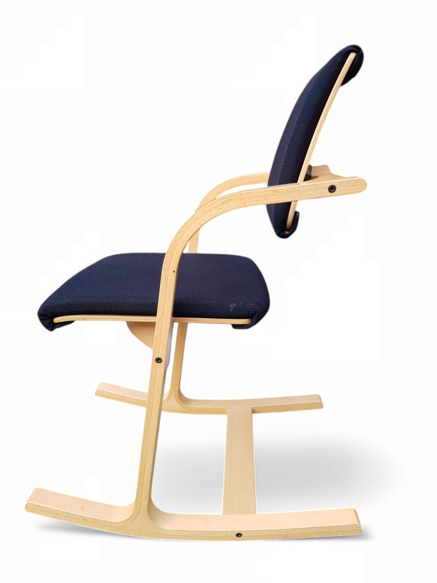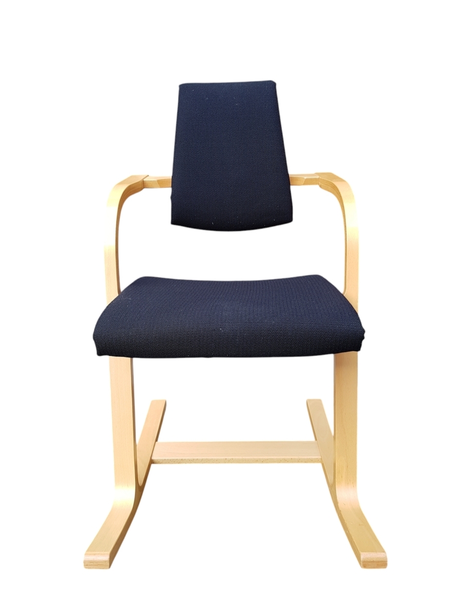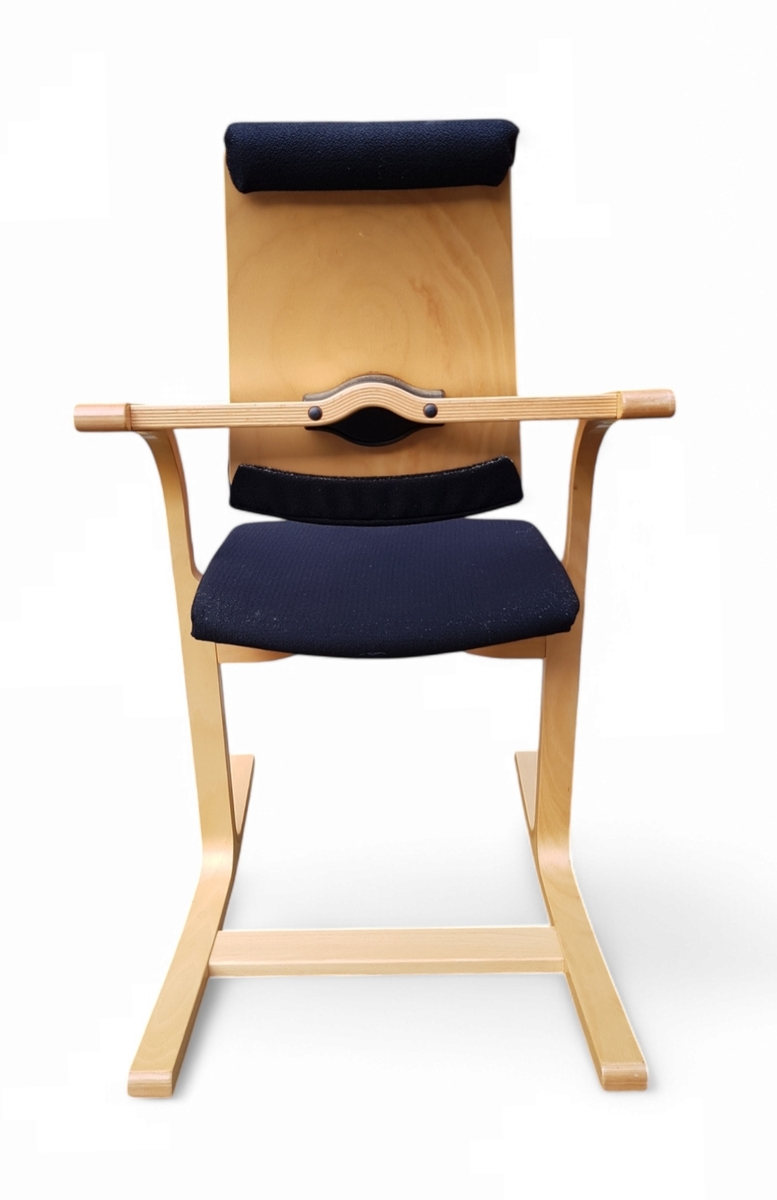 Houten stoel met zwarte stoffen bekleding door Stokke (Varier), balansstoel met modelnaam Actulum 102. Gefabriceerd in 2005. |