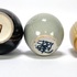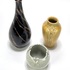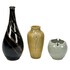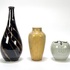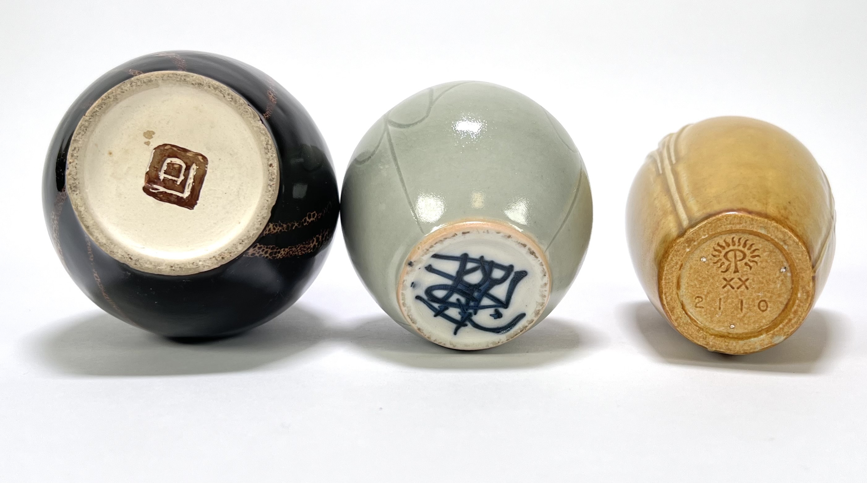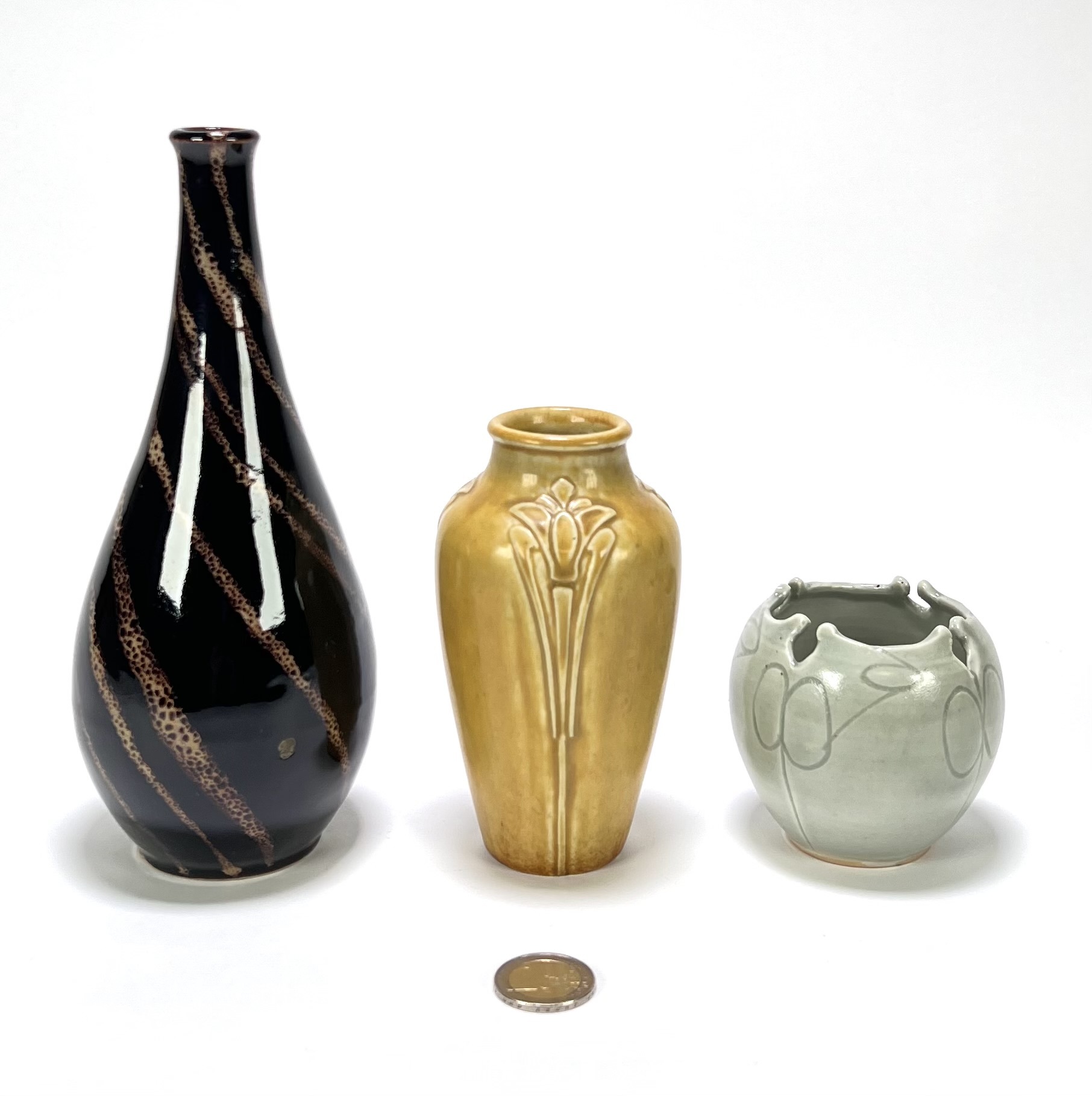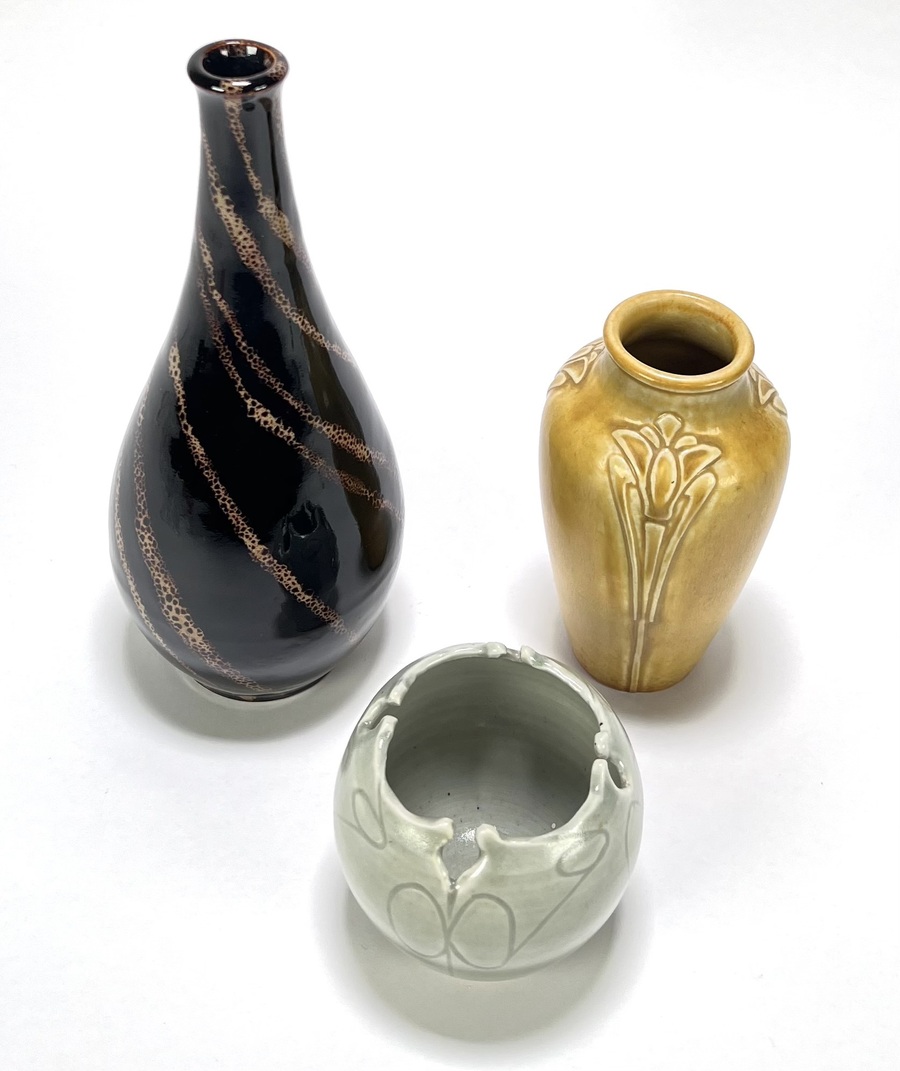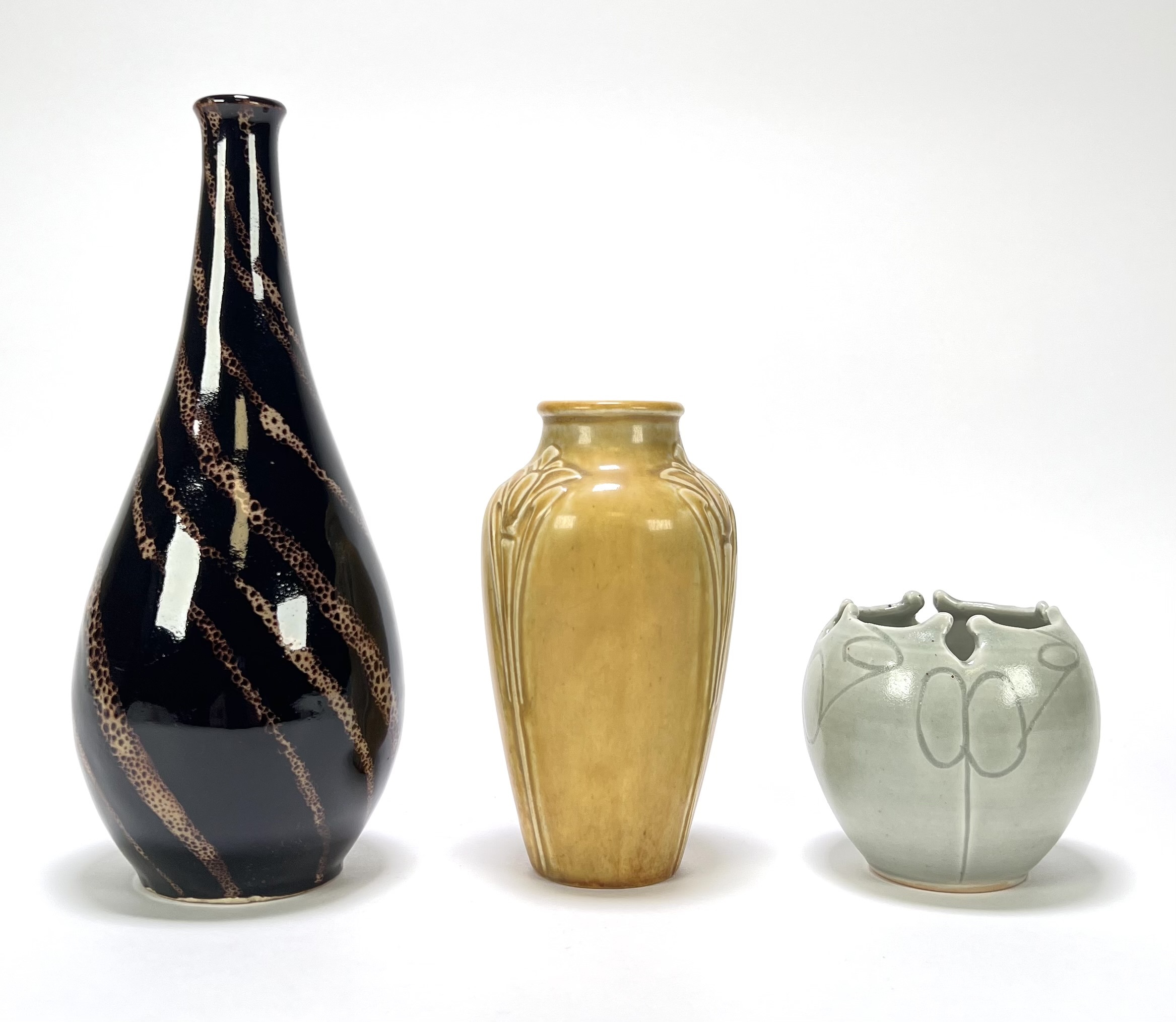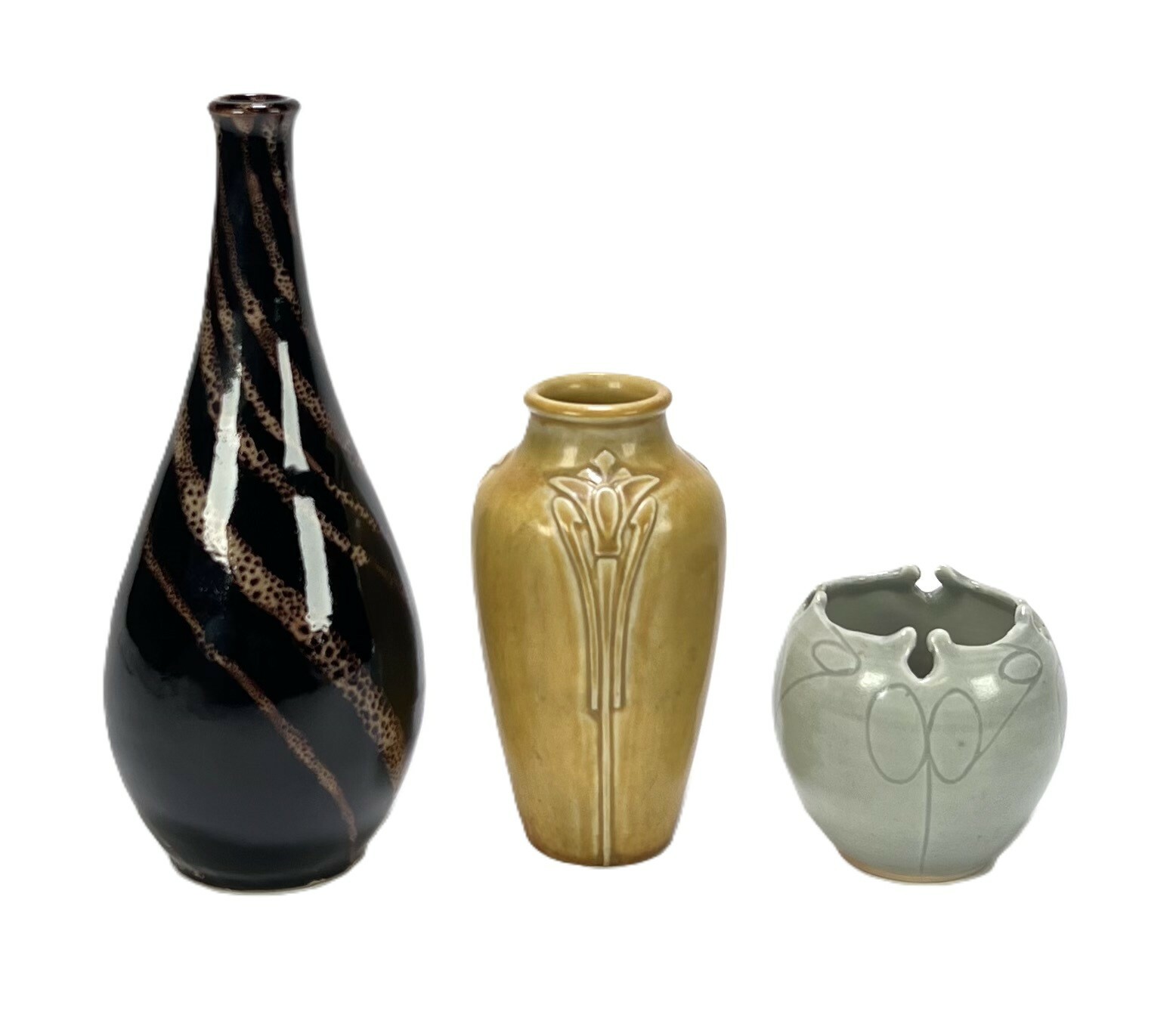 Drie keramieken vazen waaronder een donkere swirl vaas van David Bernard Leach (Engeland 1911-2005), een okerkleurige Amerikaanse Art Nouveau vaas van Rookwood Pottery omstreeks 1910 en een lichtgrijze Amerikaanse Art Nouveau vaas, gesigneerd onderzijde, begin 1900. |