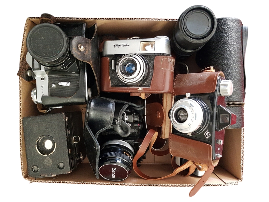 Lot camera's bestaande uit de volgende fotocamera's: Zenit-E, Voigtländer, Agfa, Canon, Zeiss Ikon en een videocamera Canon autozoom 318M. 20e eeuw. |