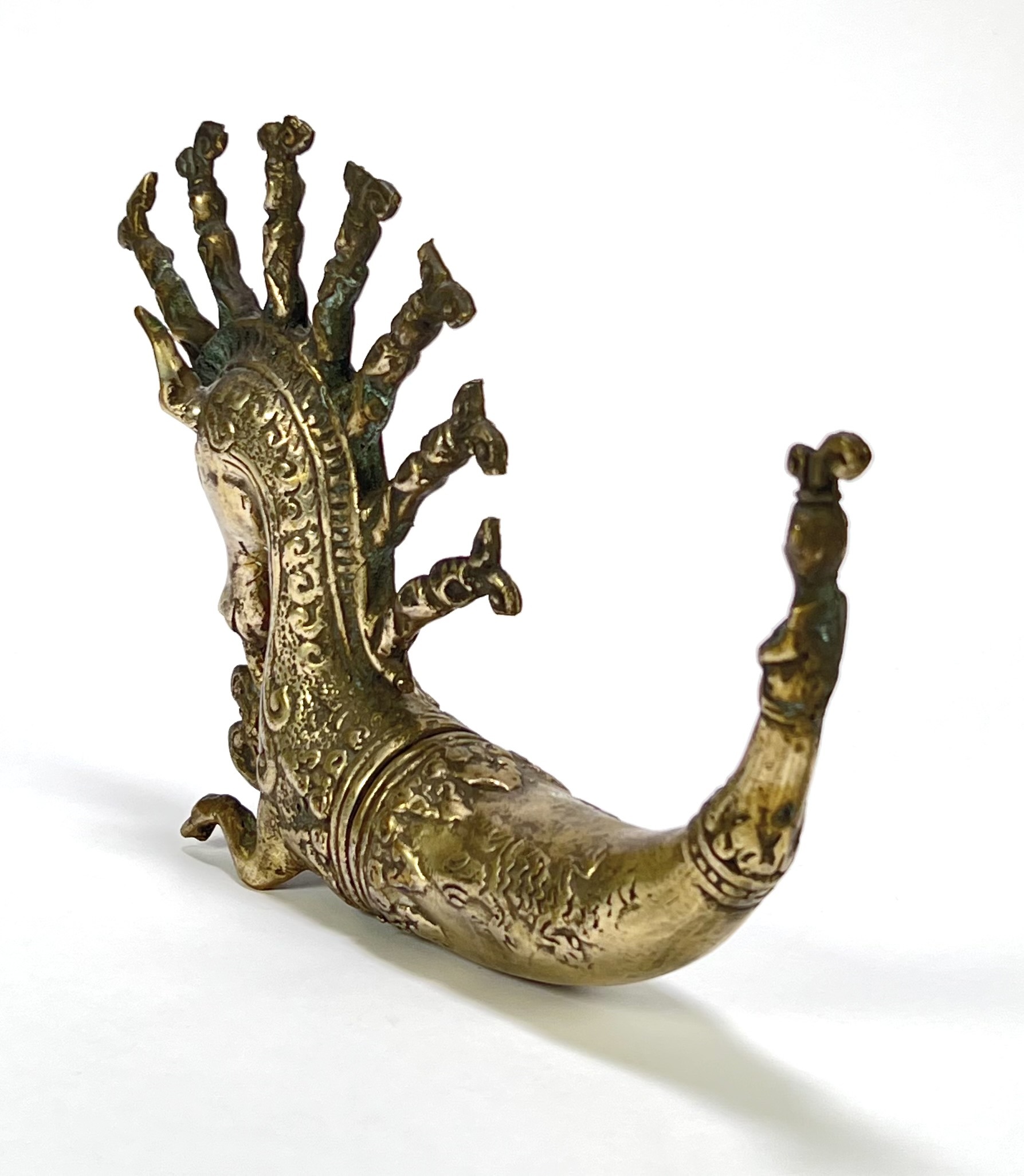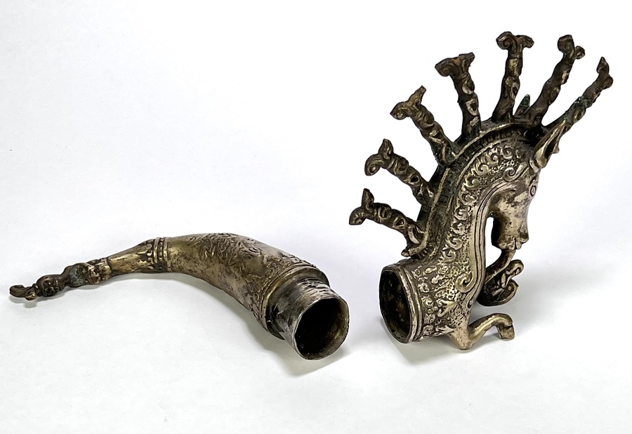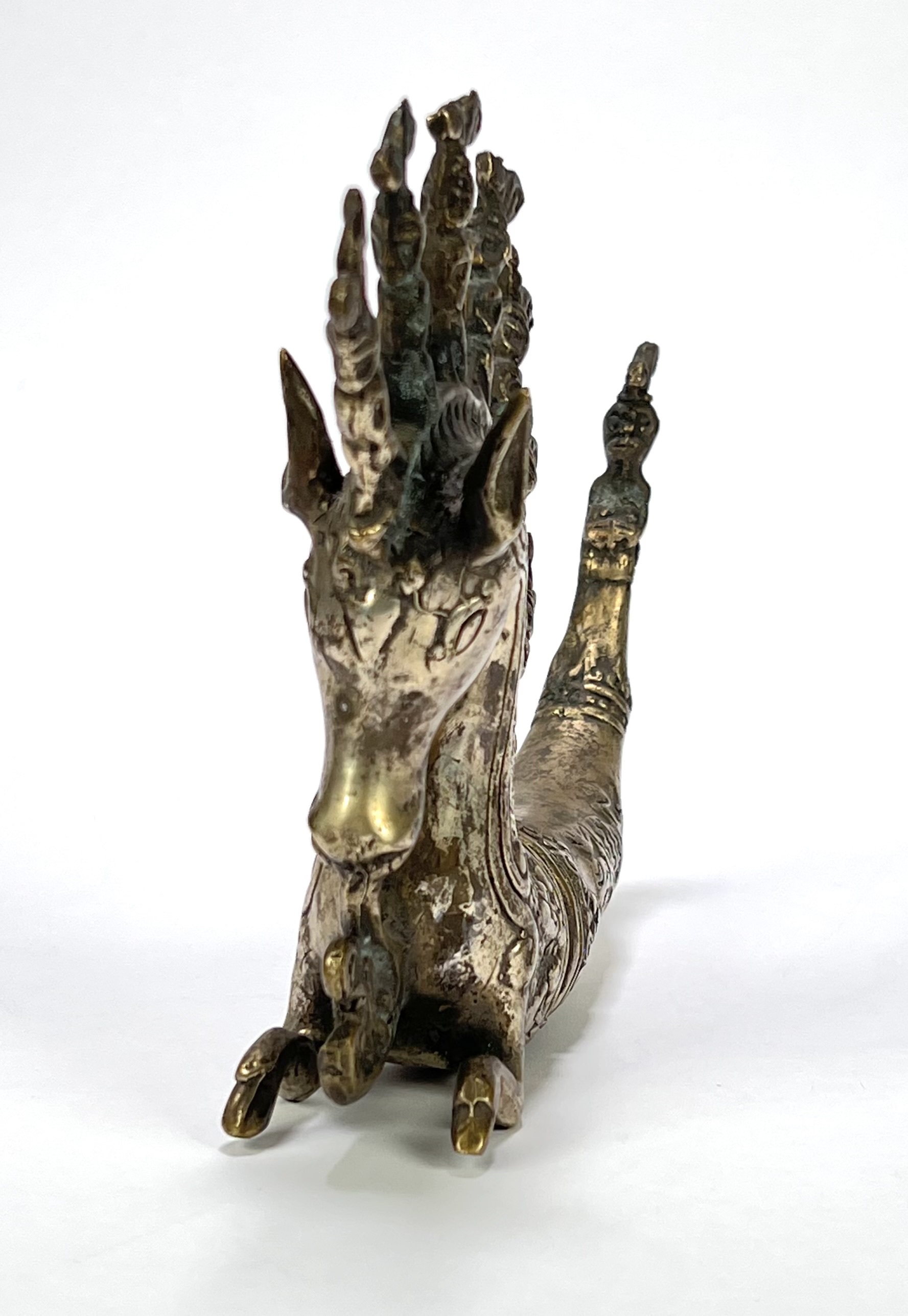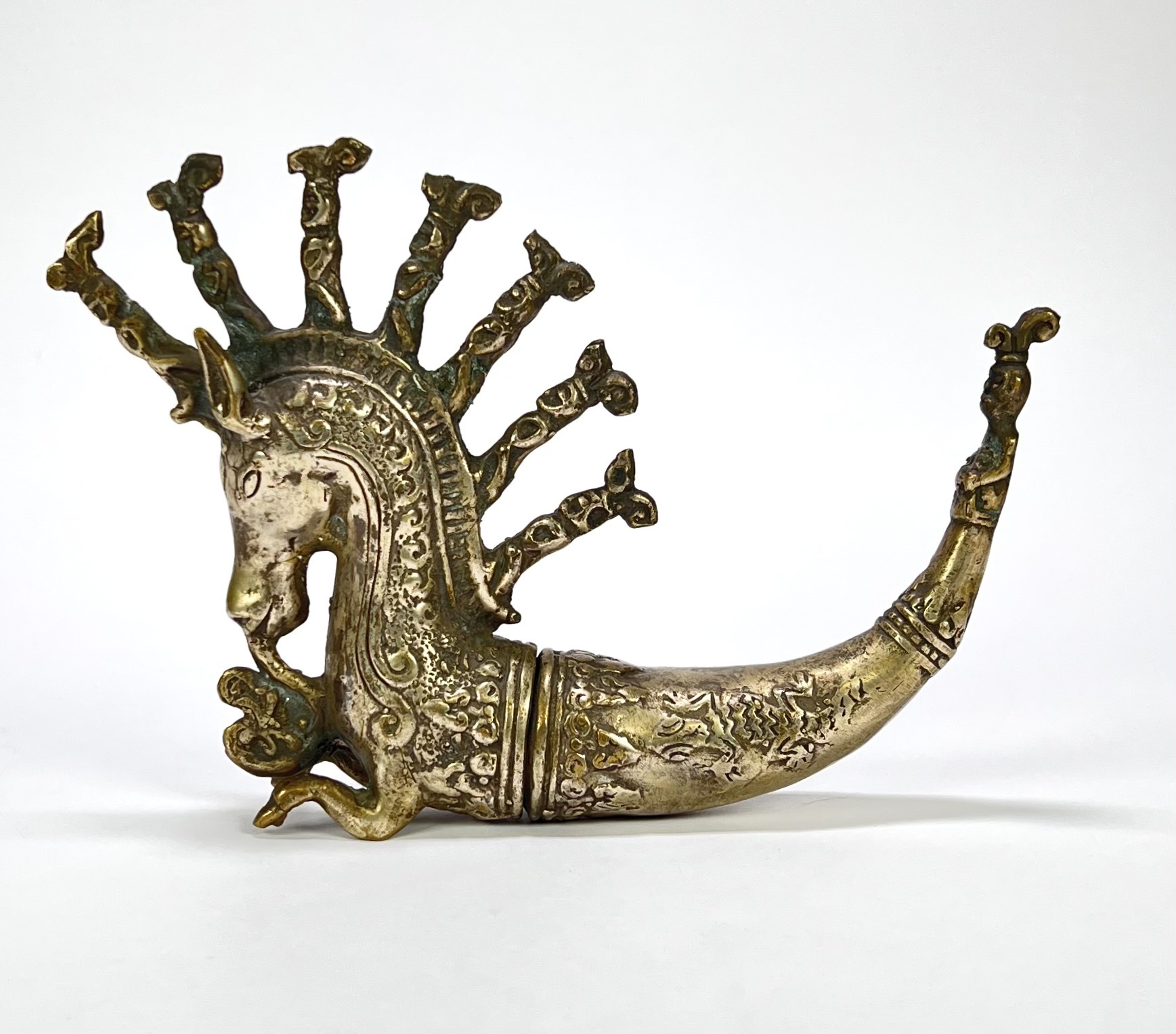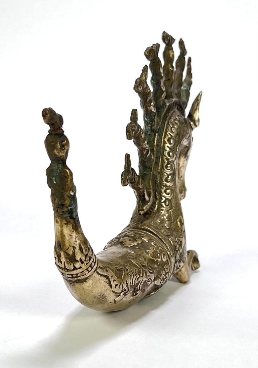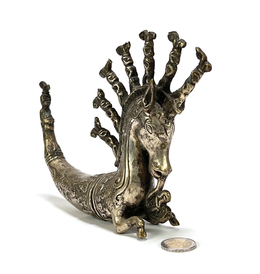 Batak metalen medicijnhouder, Naga Morsarang in paard vorm. Sumatra. Indonesië, eind 20e eeuw. |
