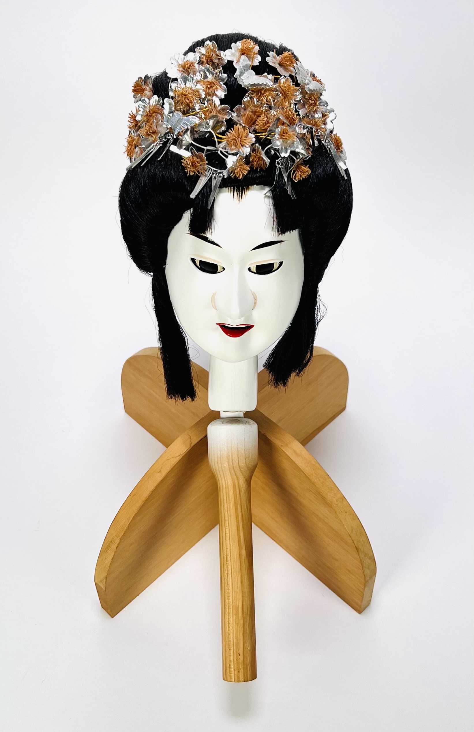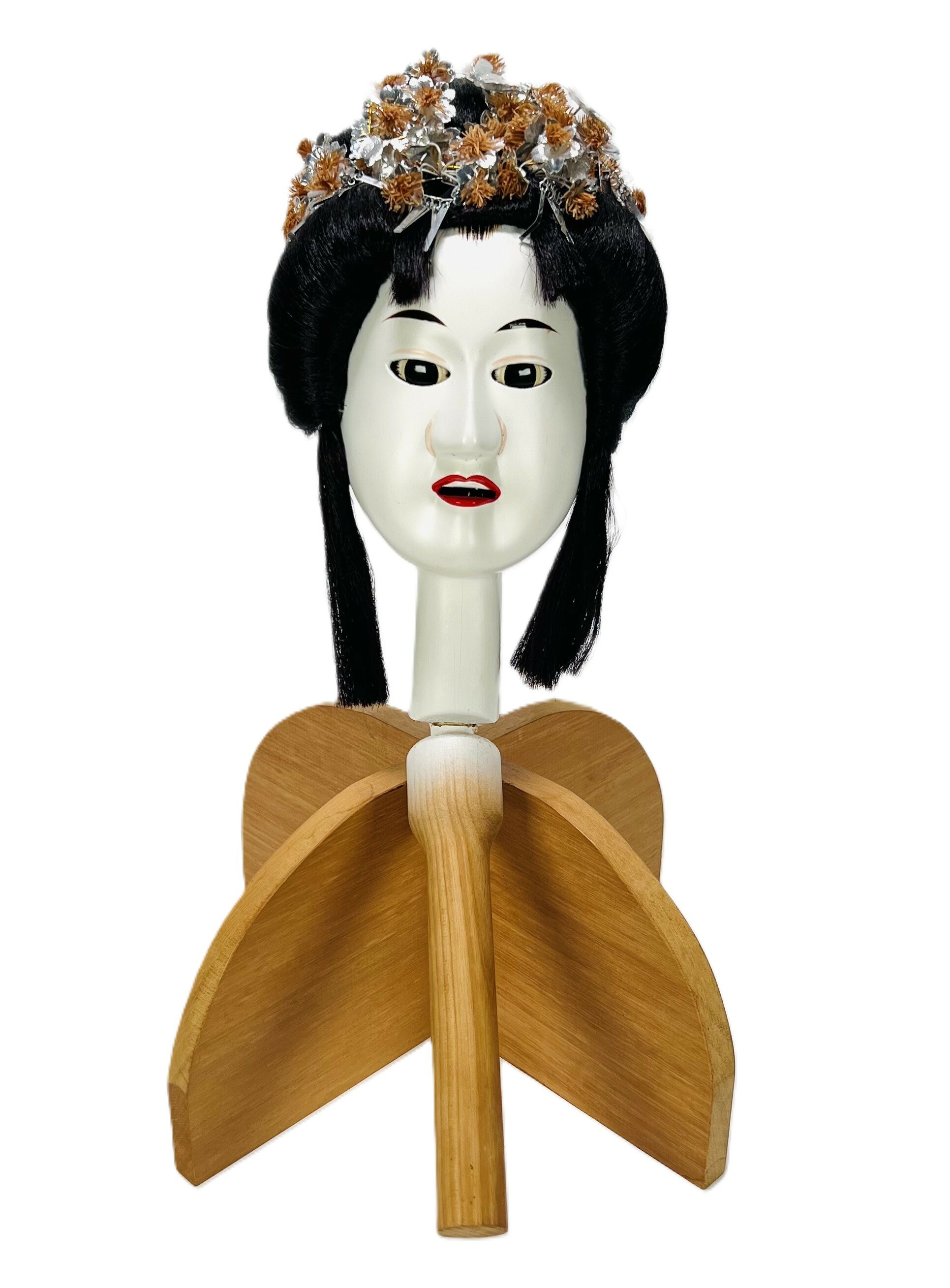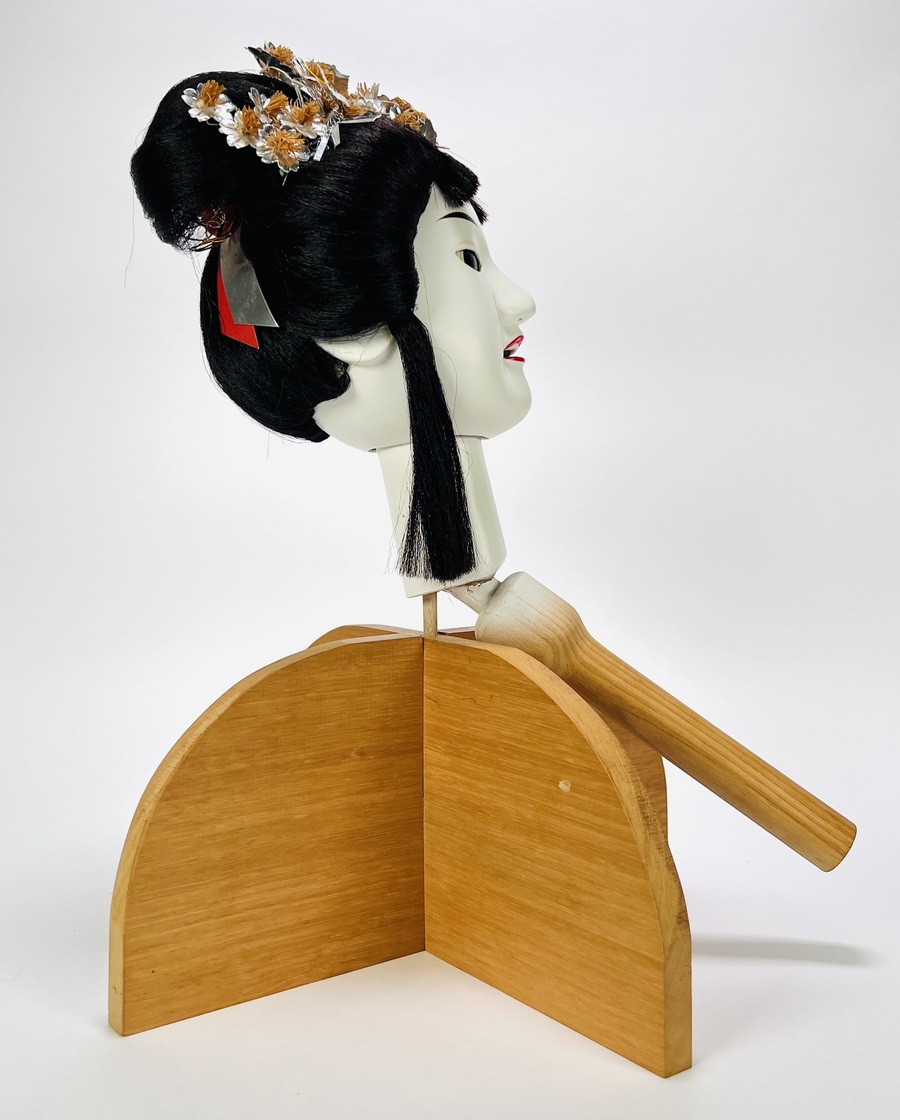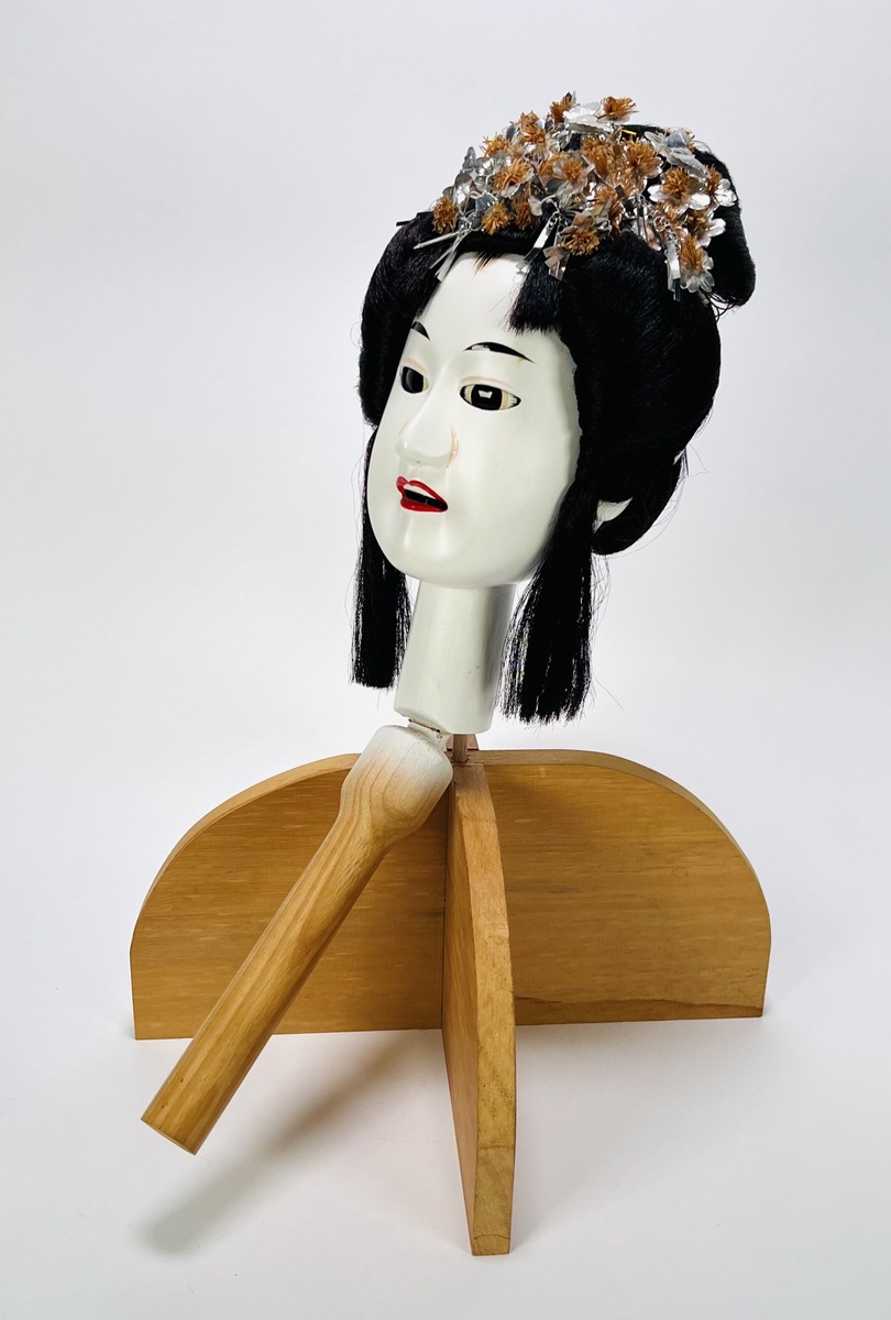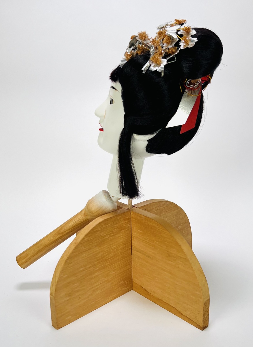 Houten hoofd van een geisha met bijbehorende standaard; toepassing voor Japans theaterspel. Japan, 20e eeuw. |