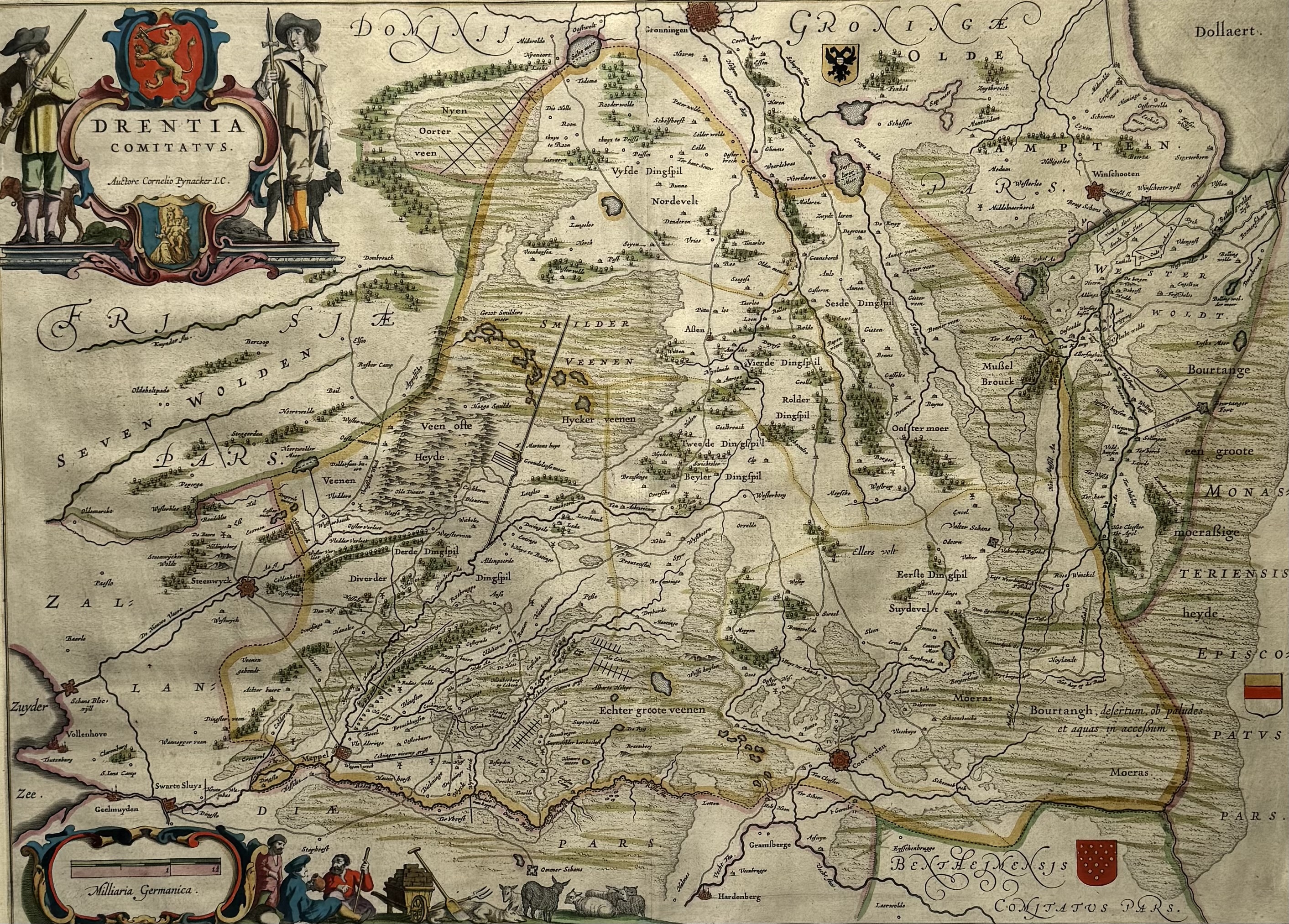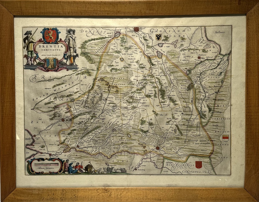 Kopergravure van Drenthe "Drentia Comitatus", met de hand ingekleurd. Kartograaf Cornelio Pijnacker, 17e eeuw. |