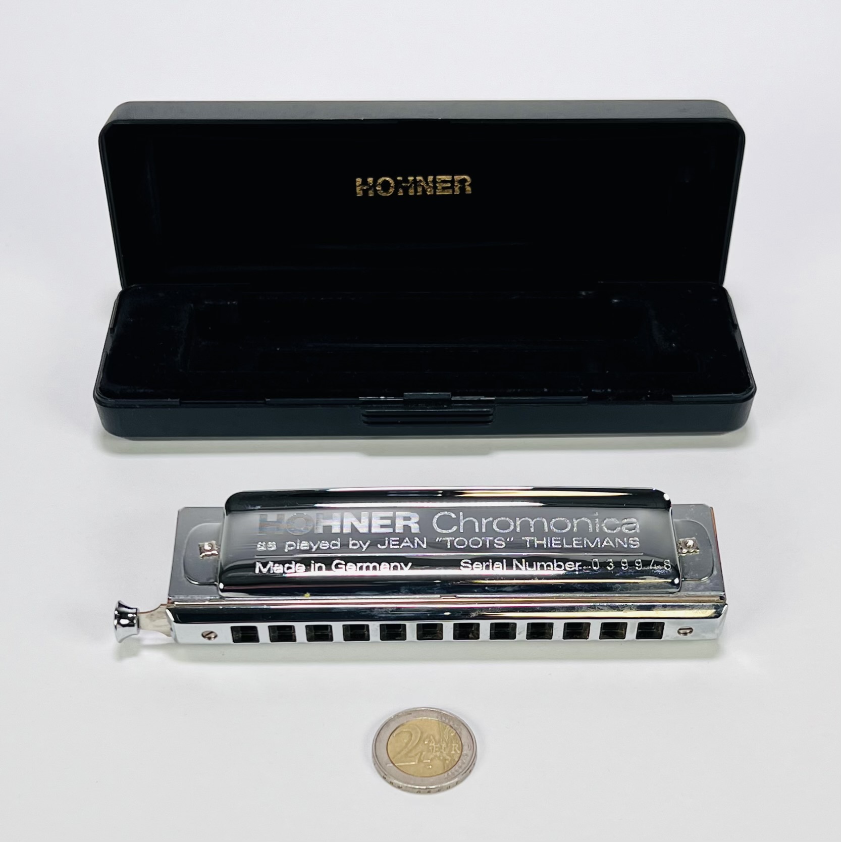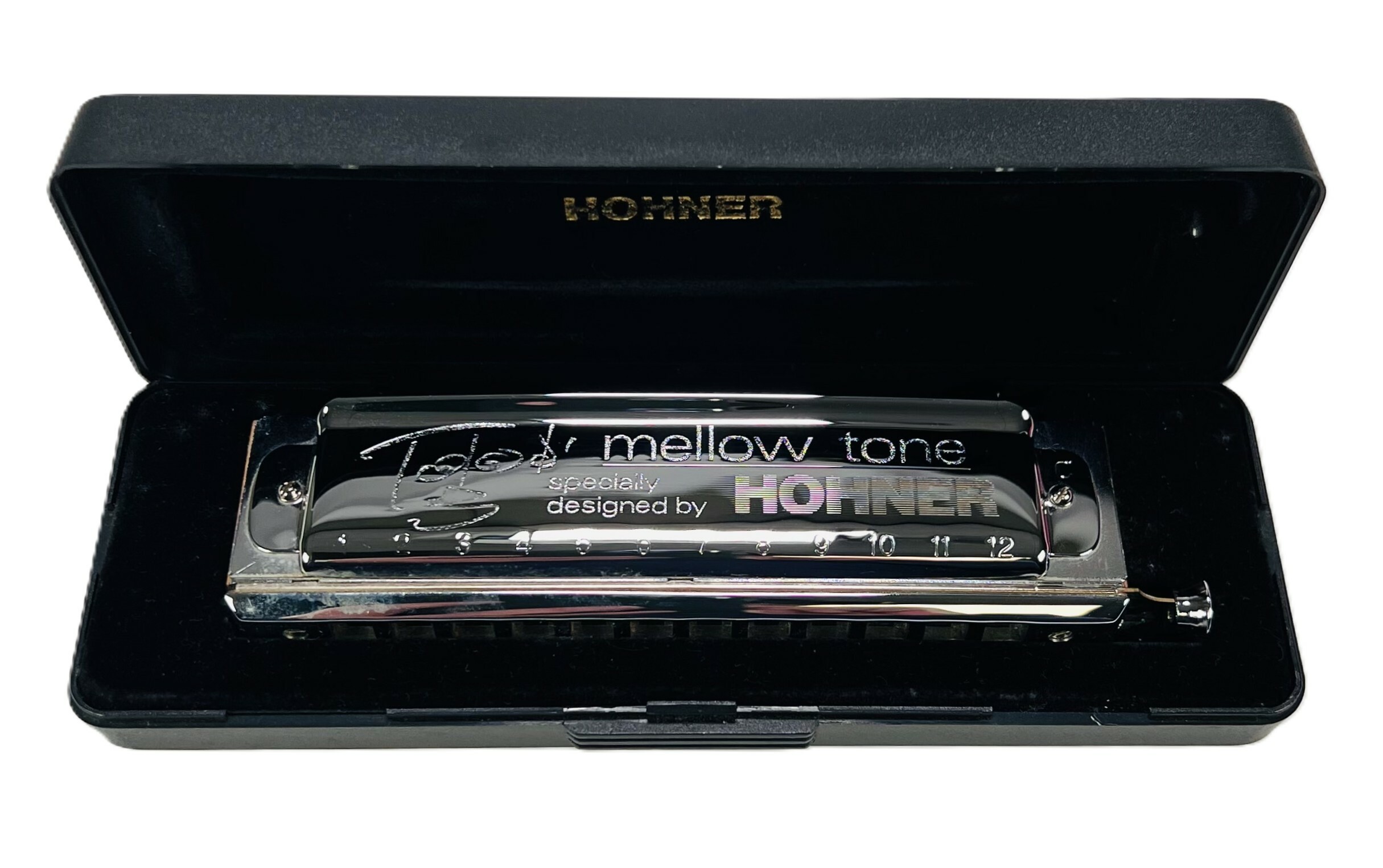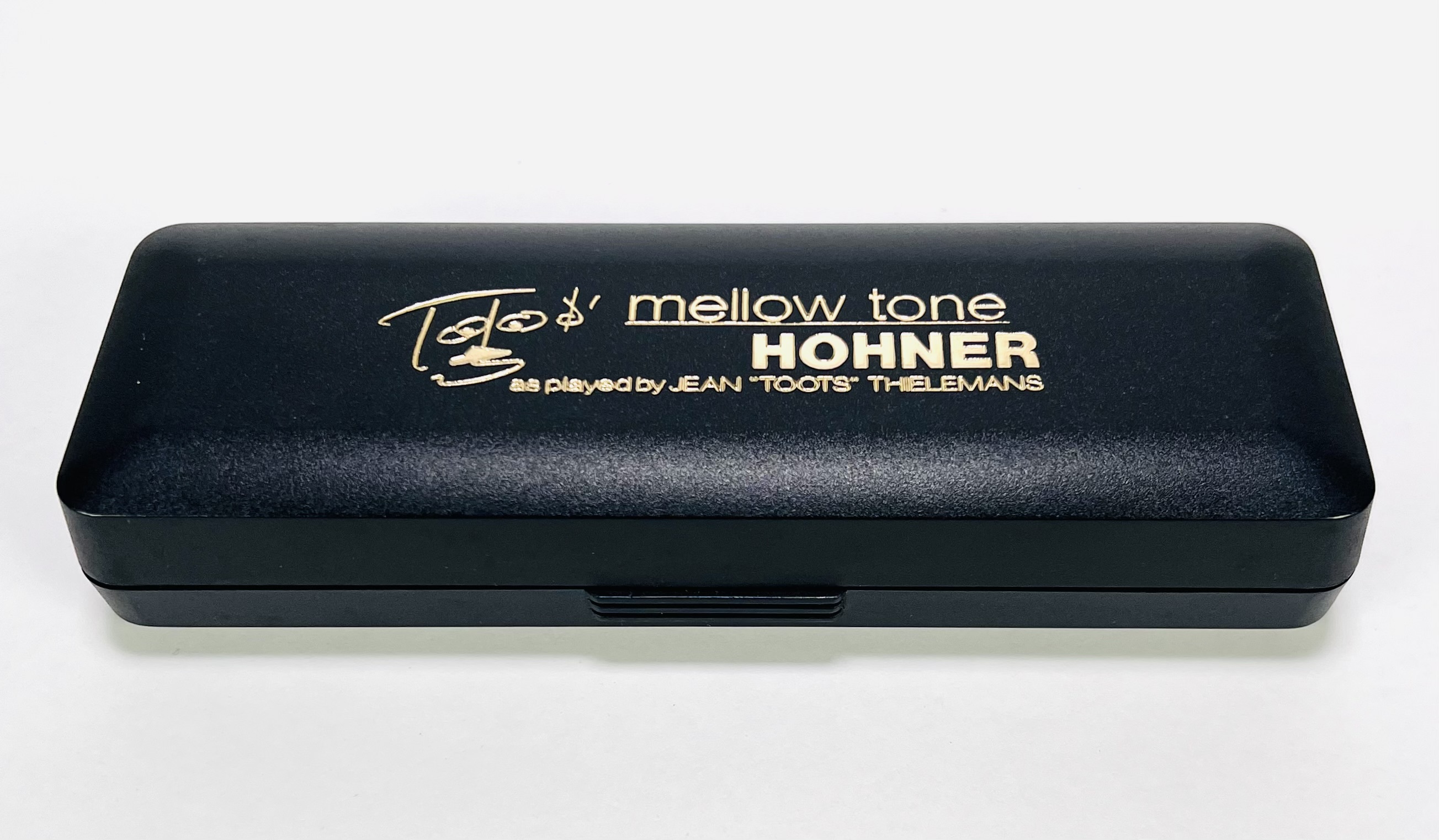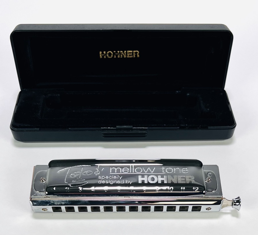 Harmonica Cromatica Hohner Toots Mellow Tone (Nota Do), 48 stemmen met wisseling. Dit model werd volgens de specificaties van Toots Thielemans gebouwd en bevatten alle functies die je voor de typische “Toots”-stijl nodig hebt. Omstreeks 2000. |