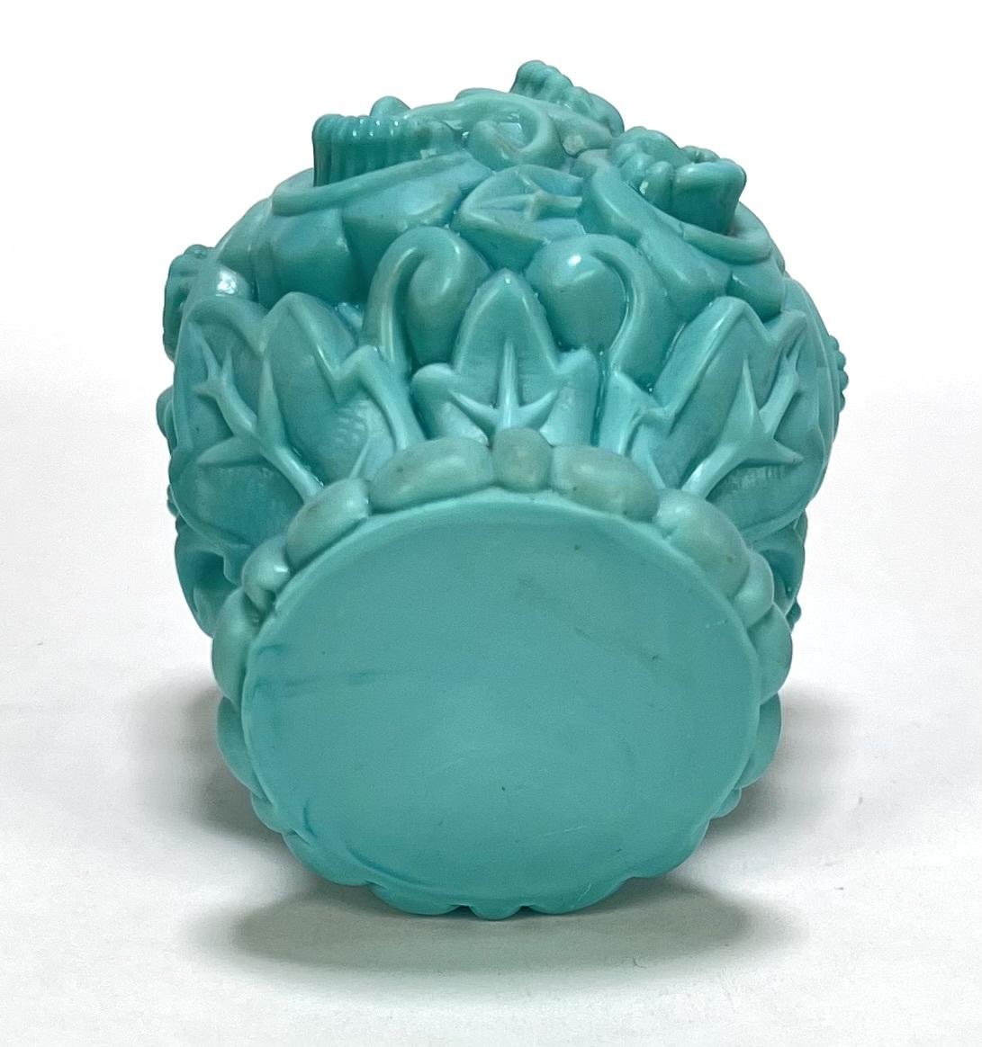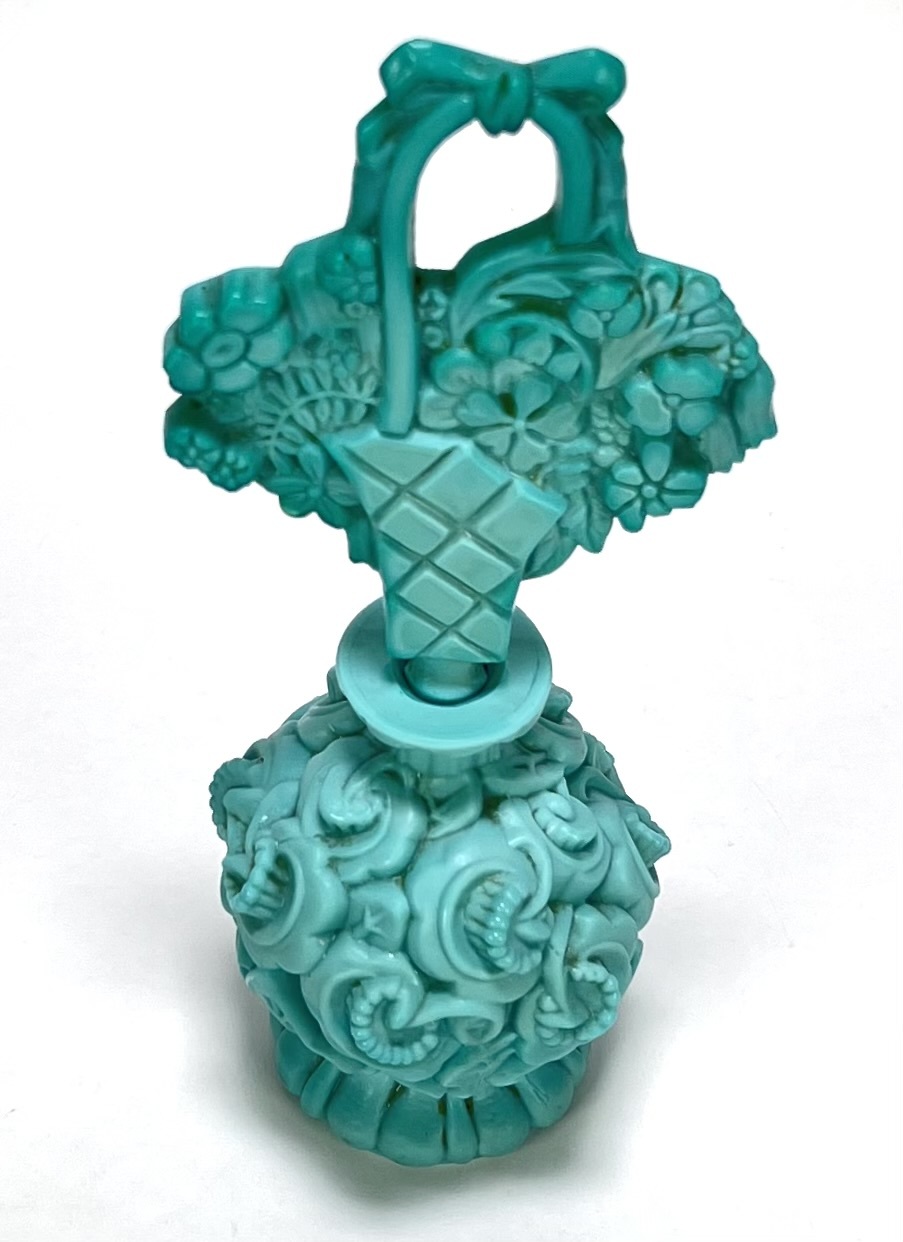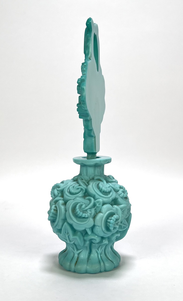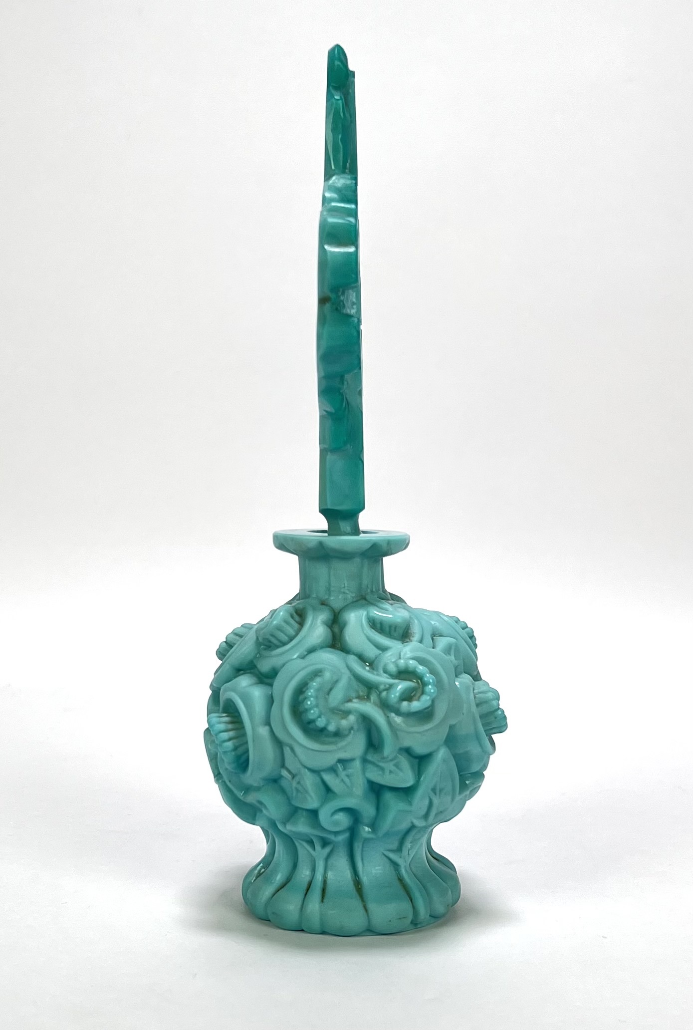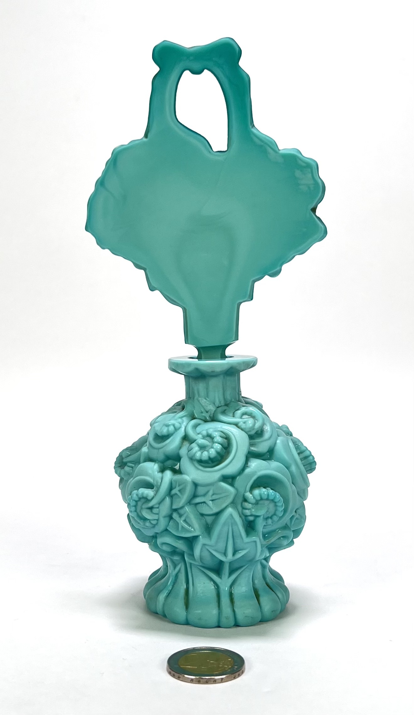 Malachiet glazen Art Deco parfumfles met floraal decor. Aan de onderzijde gemerkt Tchécoslovaquie, jaren 30. |