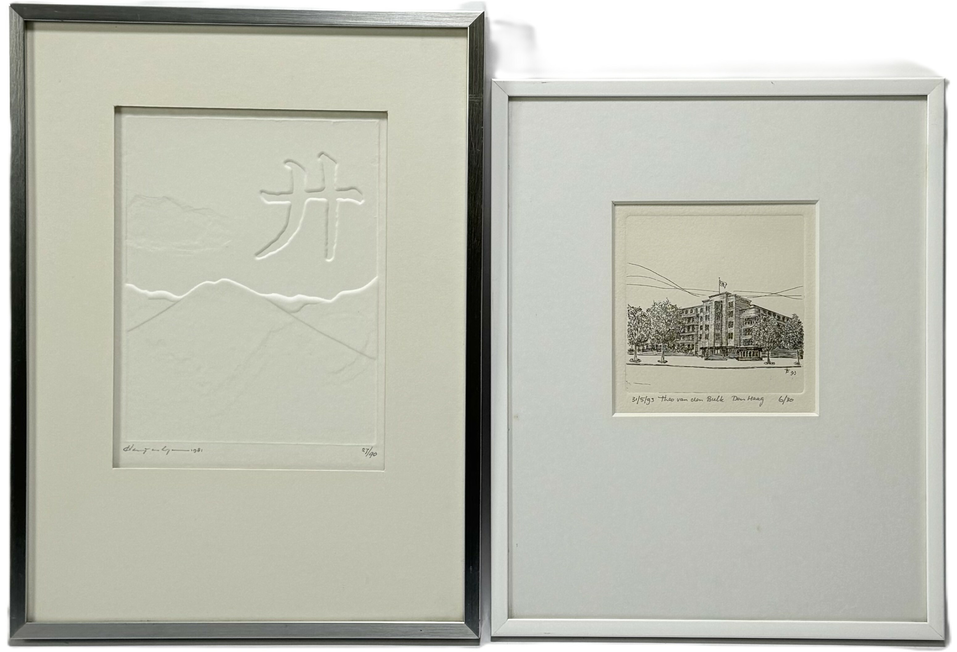 Een ets van Den Haag door Theo van den Bulk (1944-heden), met potlood gesigneerd, gedateerd 1993 en oplagenummer 6/30. Alsook een zeefdruk door Harry van Kuyk (1929-2008) met potlood gesigneerd, gedateerd 1981 en oplagenummer 27/90. |