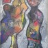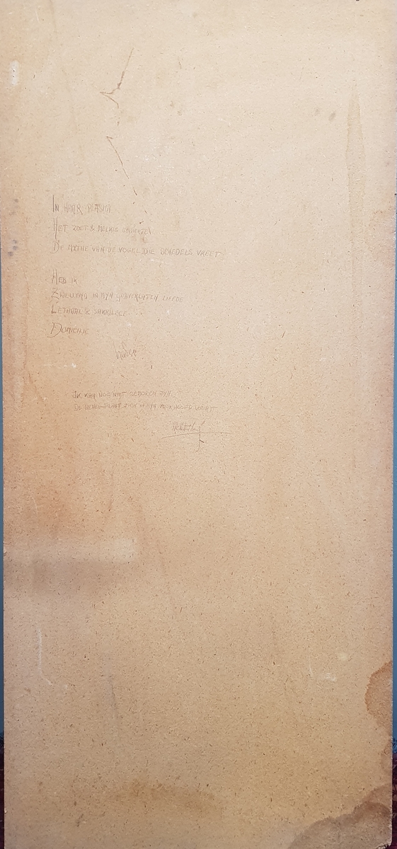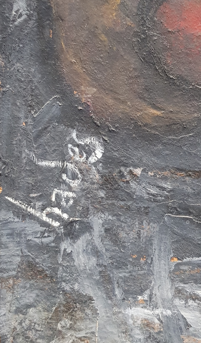Schilderij met een abstracte compositie getiteld “De bevruchting” door Hades. Olieverfschilderij op spaanplaat, linksonder gesigneerd, verso twee gedichten, jaren 60. Betreft een schilderij op groot formaat. |
