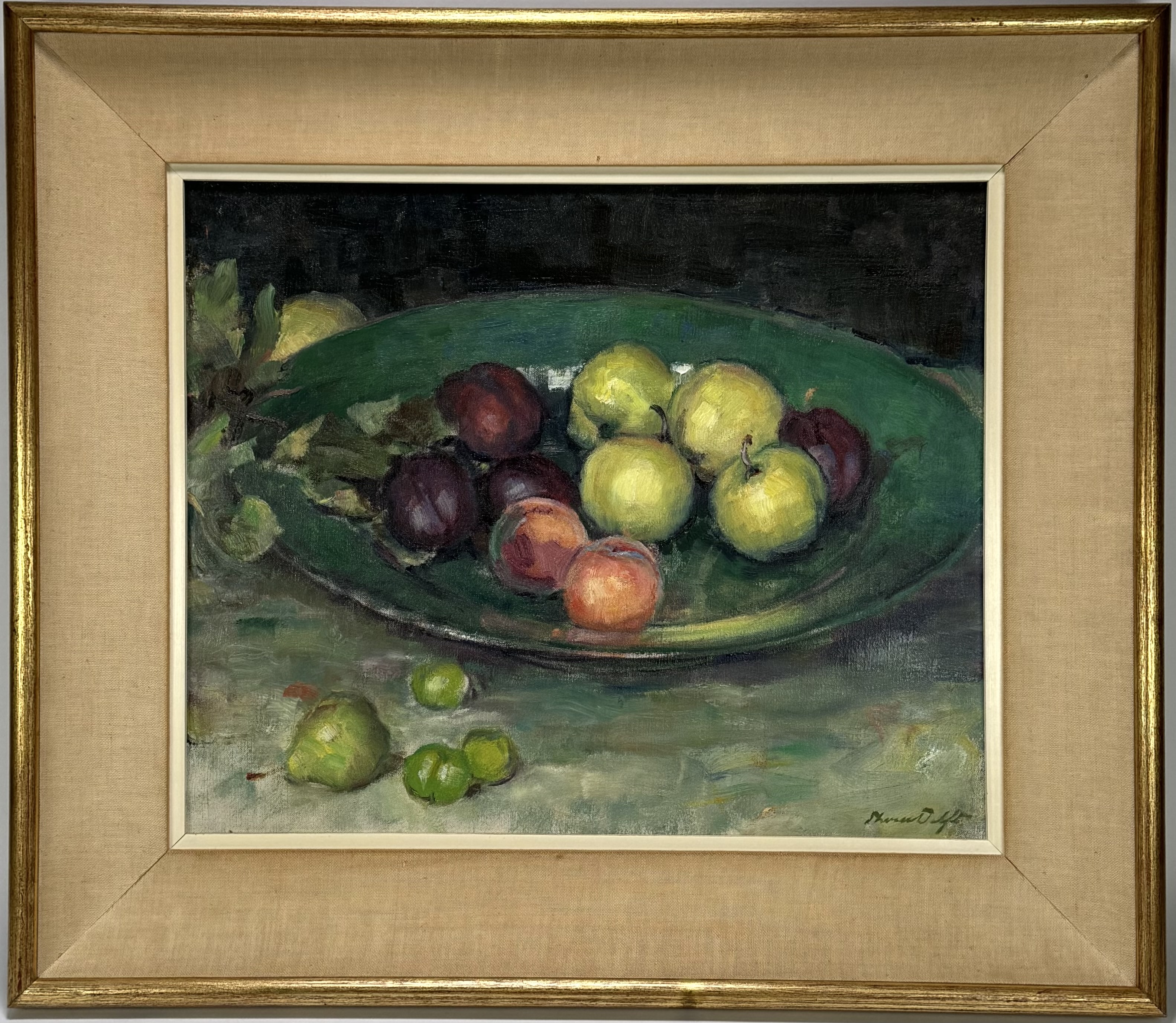 Schilderij van een stilleven met fruit door Theodorus Maria (Theo) van Delft (Waalwijk 1883 – Waalwijk, 1967). Olieverfschilderij op linnen, rechtsonder gesigneerd. Jaren 40/50. |