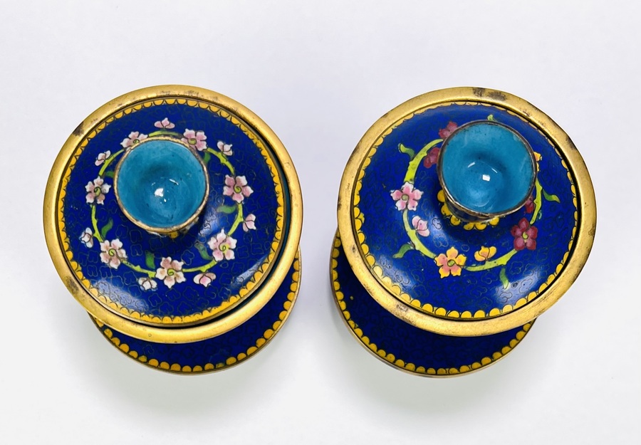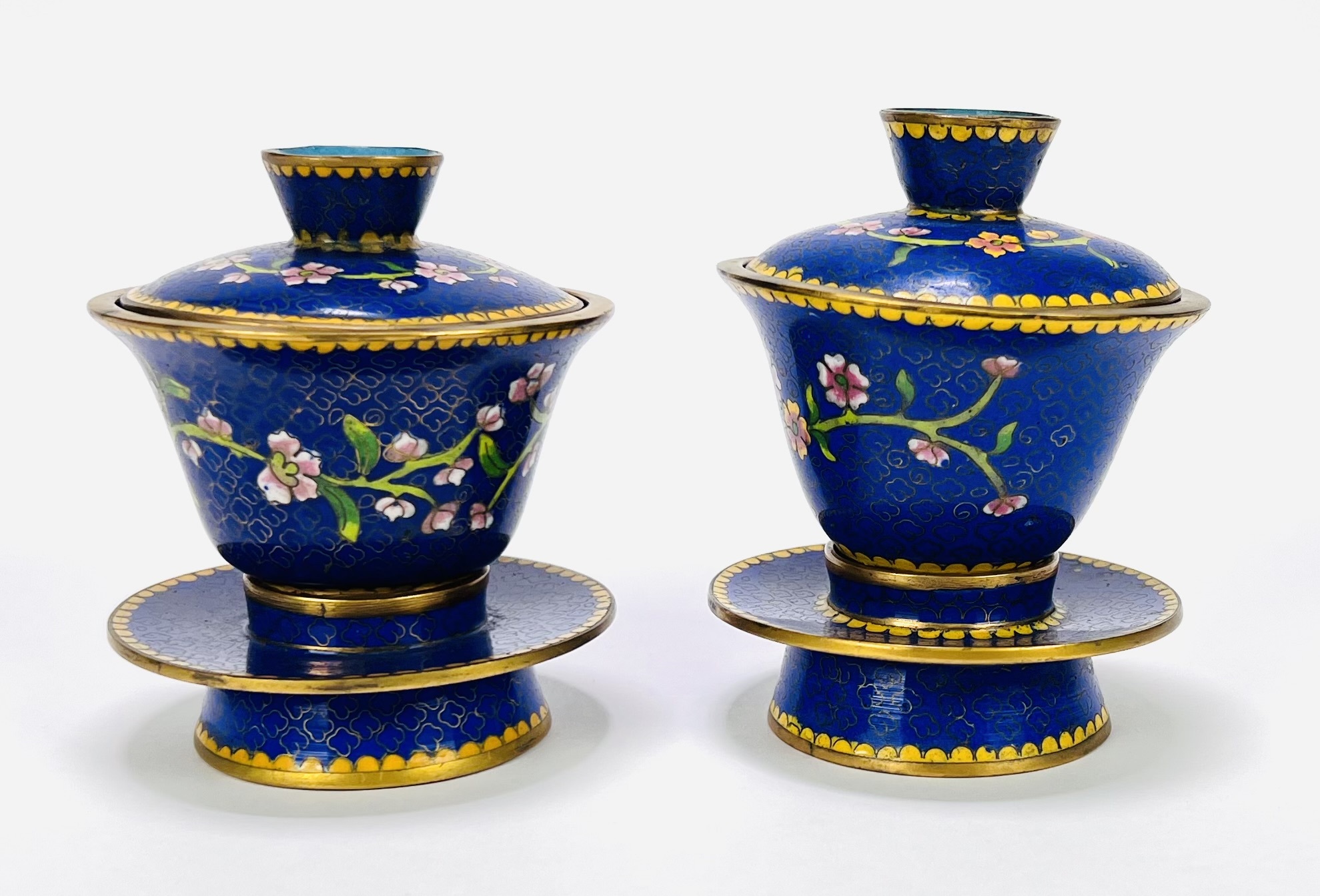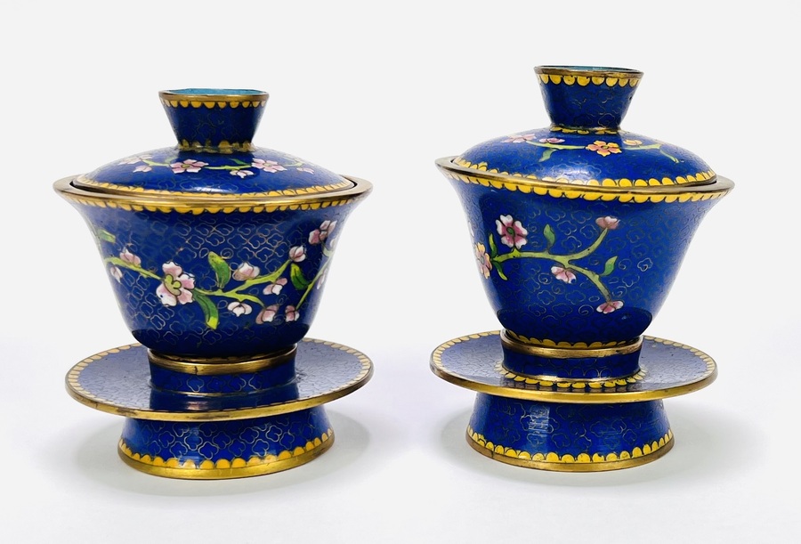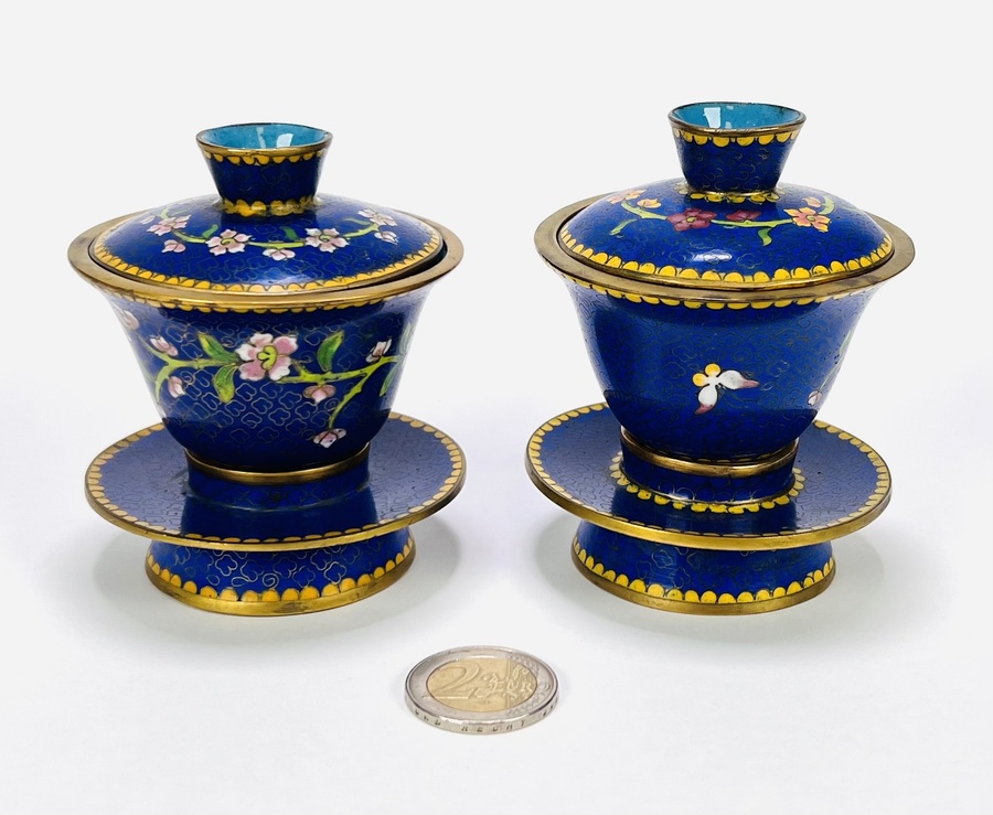 Paar cloisonné Chinese theekommen (gaiwan), circa 1950–1970. Traditioneel samengesteld uit kom, passend deksel en schotel met bloesemtakken op kobaltblauwe fond, turquoise binnenzijde en randen met gele bies. Cloisonné-techniek met opgelegde messingdraden en gepolijst emaille. Geïnteresseerd? Bezoek onze kijkdagen op 29, 30 of 31 augustus van 11:00 tot 17:00 uur! |