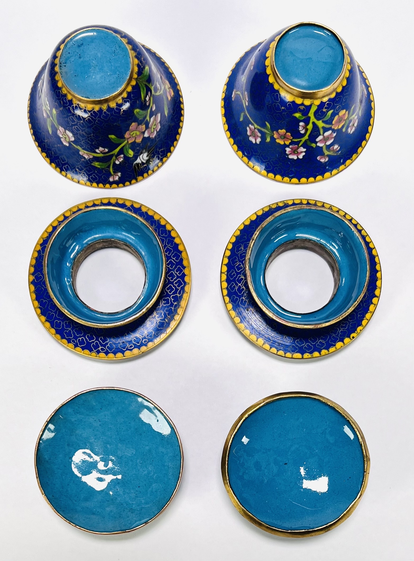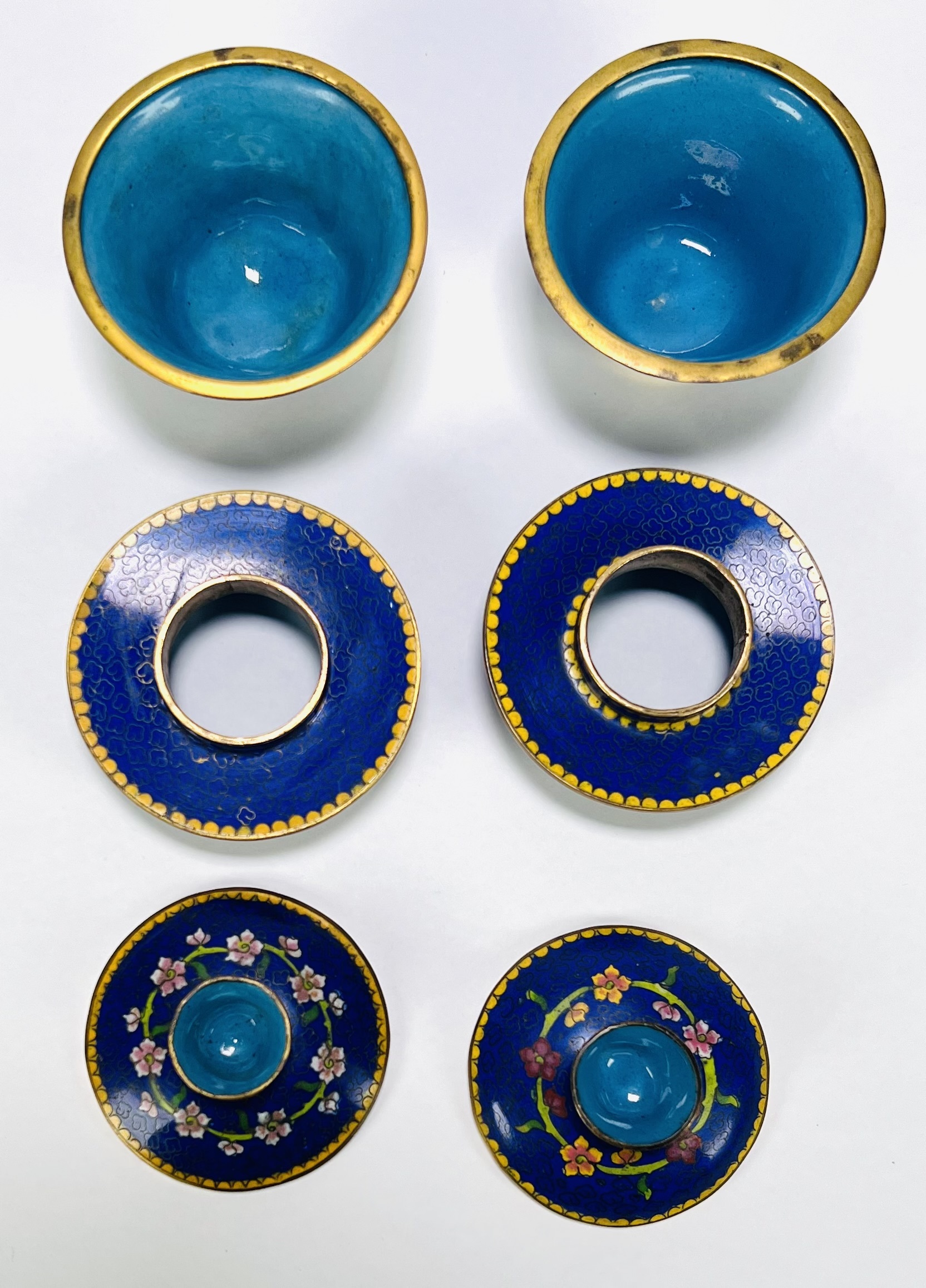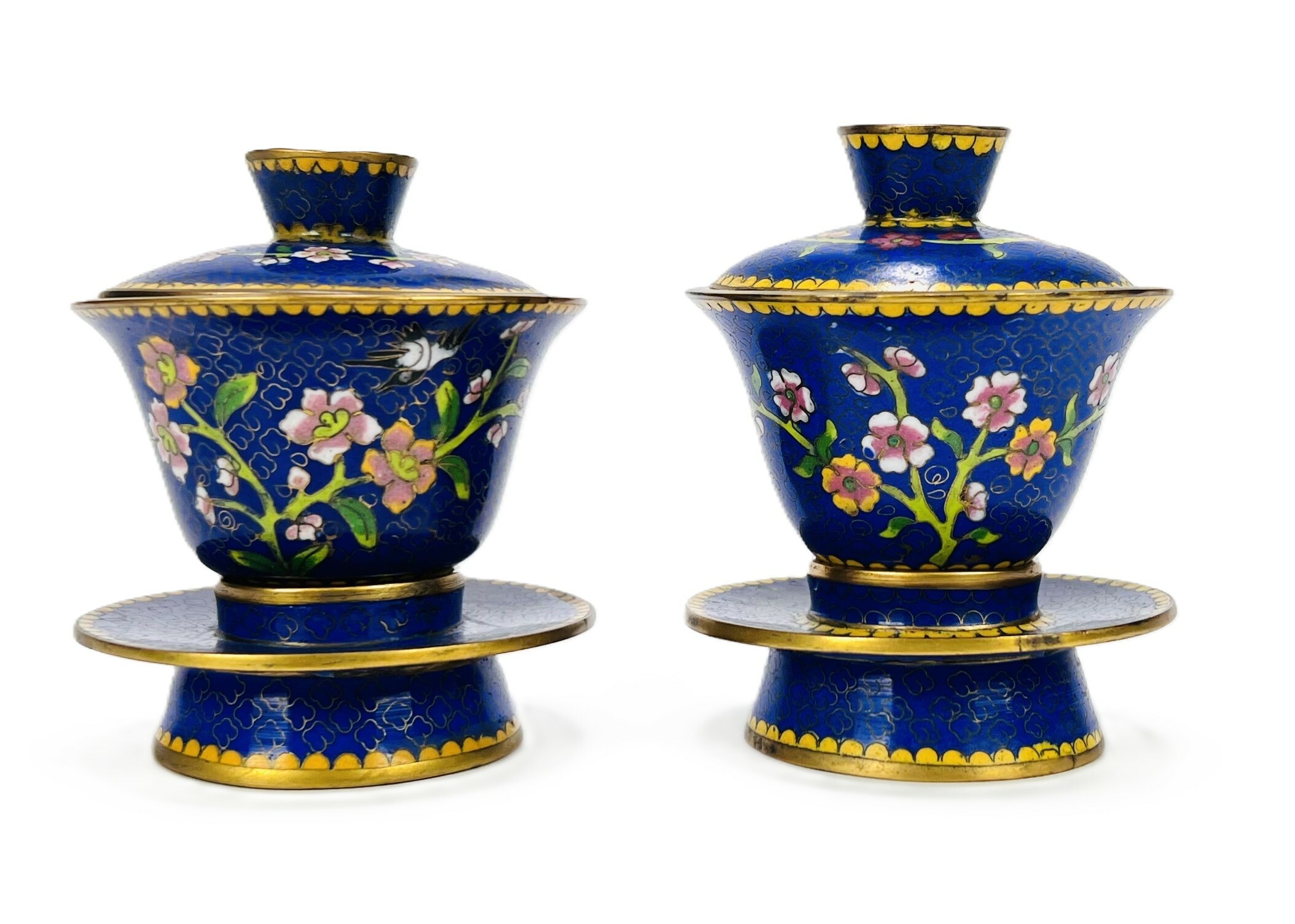 Paar cloisonné Chinese theekommen (gaiwan), circa 1950–1970. Traditioneel samengesteld uit kom, passend deksel en schotel met bloesemtakken op kobaltblauwe fond, turquoise binnenzijde en randen met gele bies. Cloisonné-techniek met opgelegde messingdraden en gepolijst emaille. Geïnteresseerd? Bezoek onze kijkdagen op 29, 30 of 31 augustus van 11:00 tot 17:00 uur! |