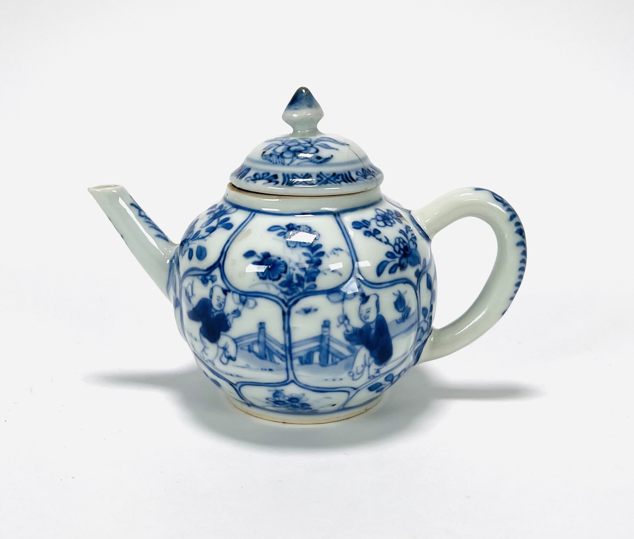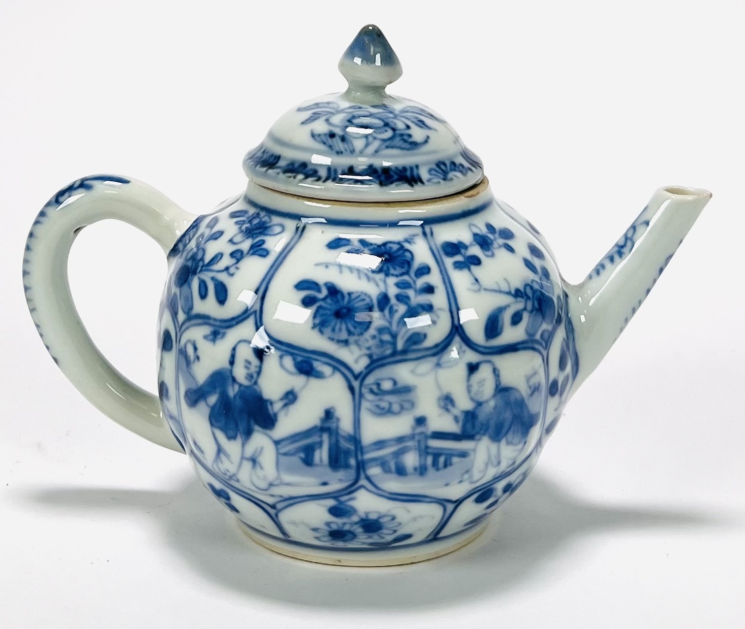 Chinees porseleinen trekpotje, Kangxi , omstreeks 1700, uitgevoerd in blauw-wit beschildering. Bolvormig model met rechte tuit, gebogen oor en deksel met spits toelopende knop. Decoratie in cartouches met florale motieven en spelende kinderen in landschap, uitgevoerd met kobaltblauw onder transparant glazuur. Paneelindeling rondom en fijn uitgewerkte details, binnenzijde geglazuurd. Zeker zijn van deelname? Plaats vanaf 22 augustus een schriftelijk bod online! |