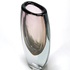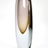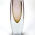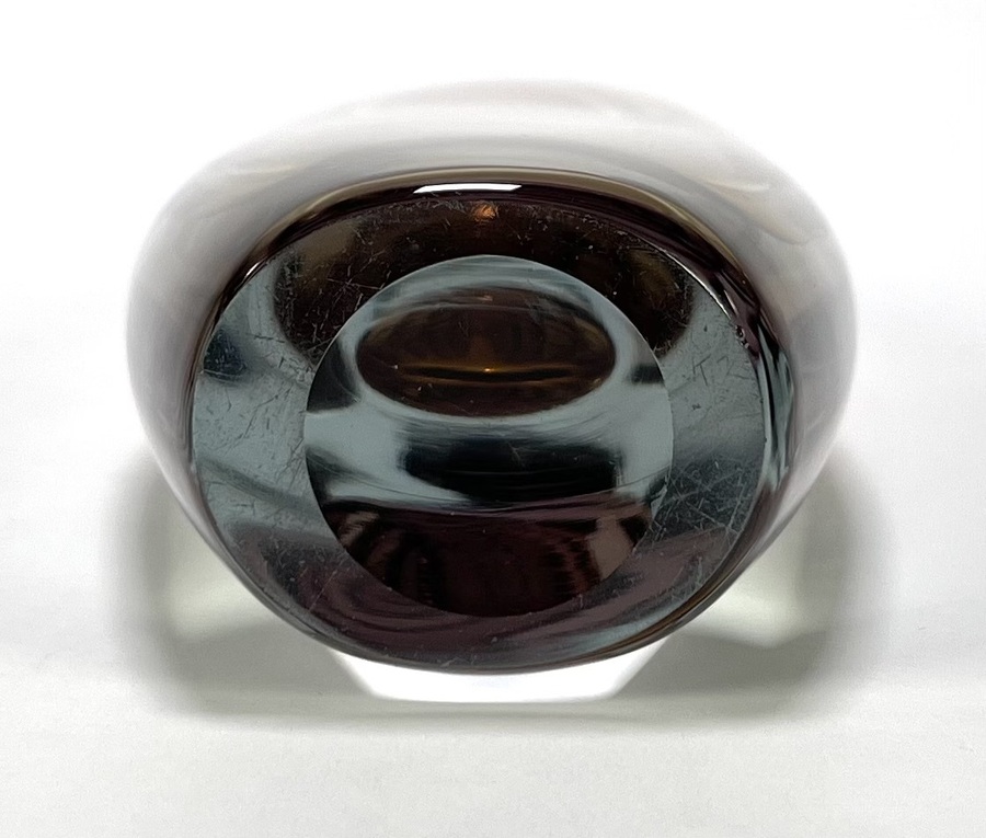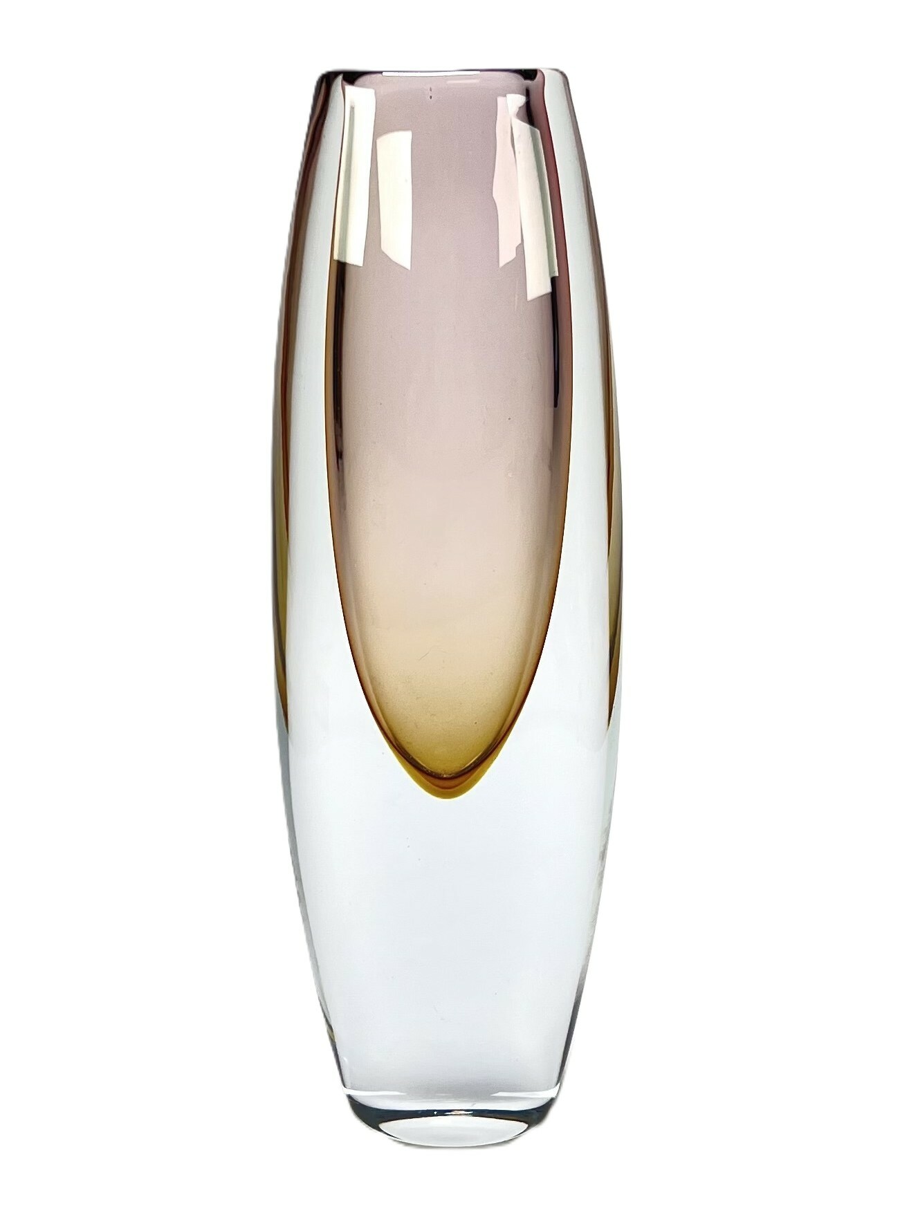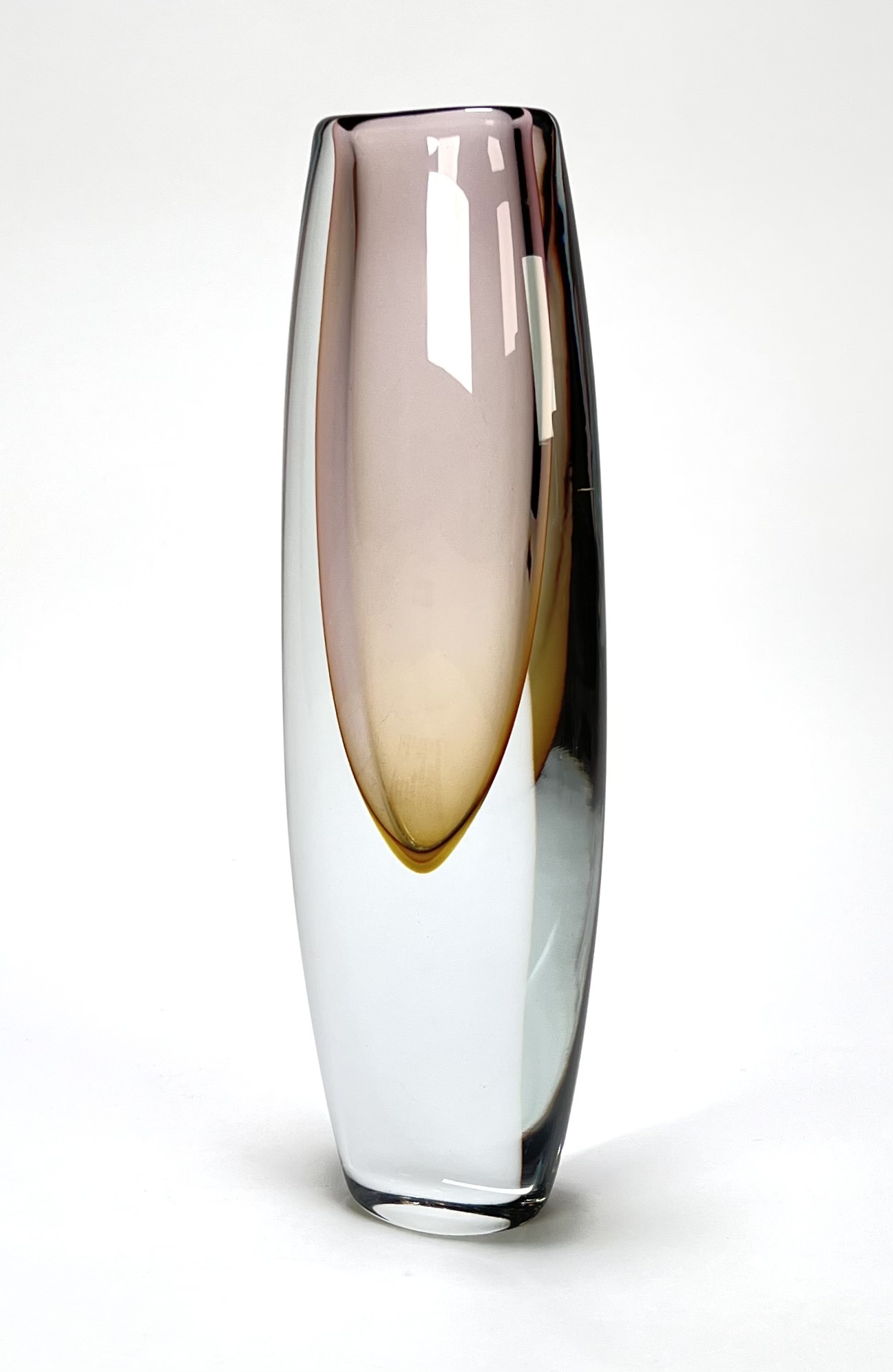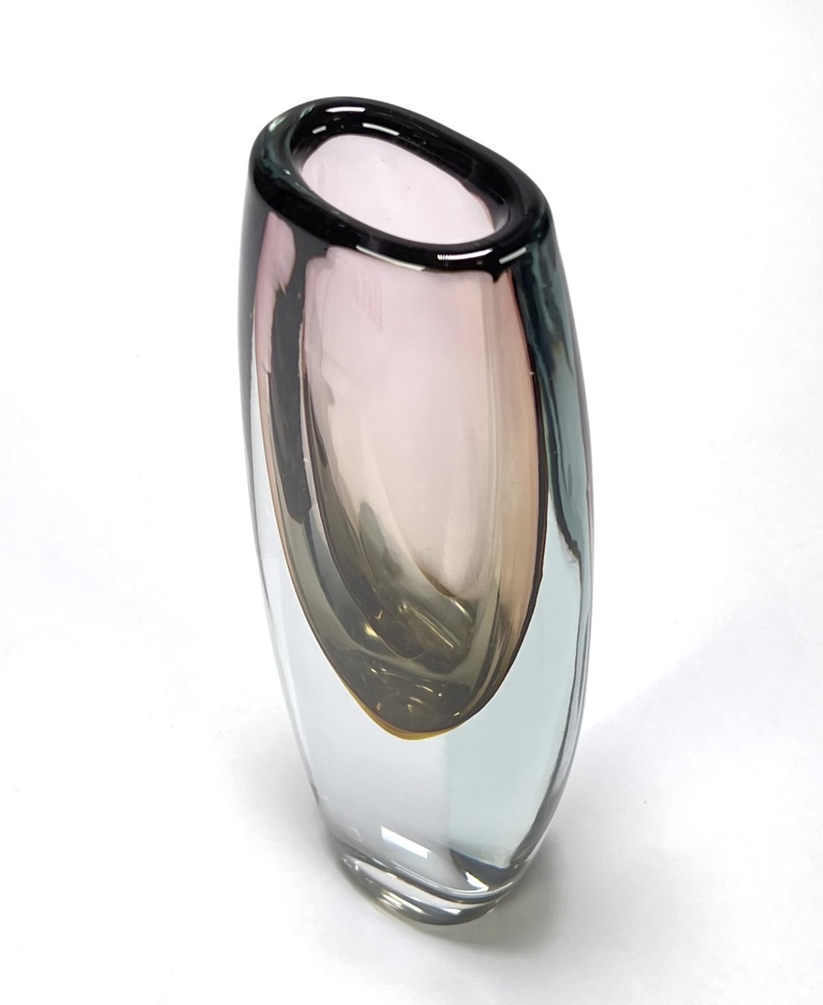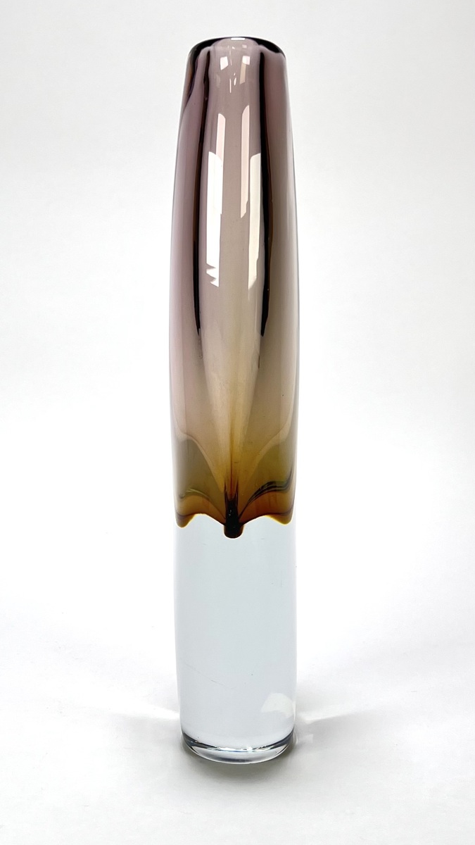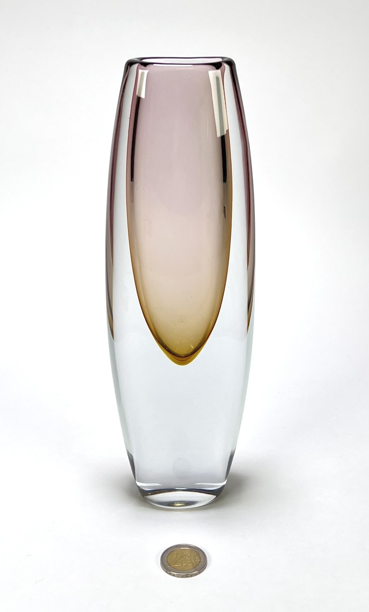 Kristallen vaas in Sommerso techniek met een amber en auberginekleurig kleurelement, gefabriceerd door Glasfabriek Strömbergshyttan, Zweden, jaren 50. |