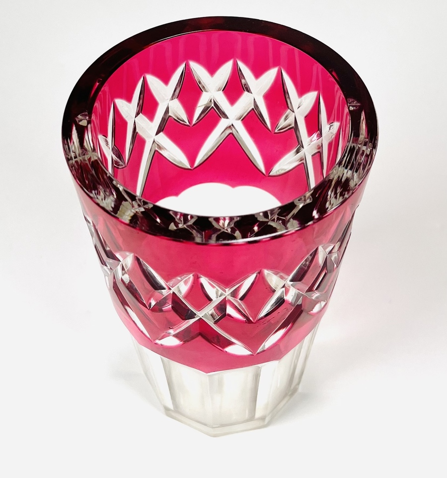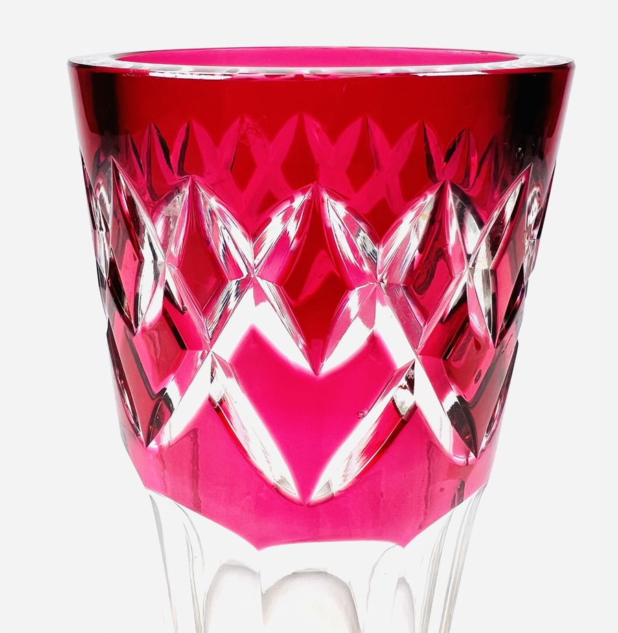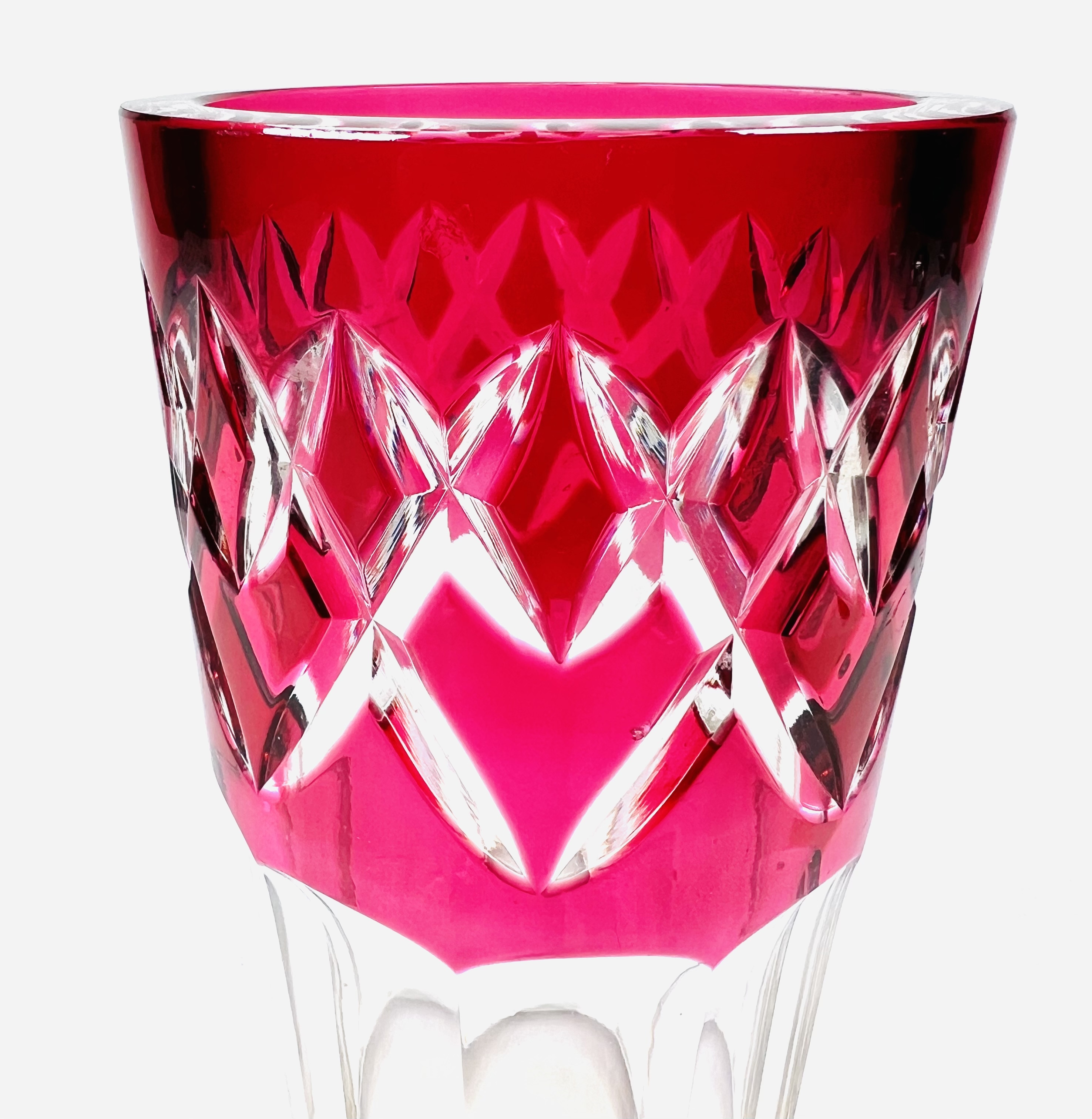 Kristallen rode überfang vaas met geslepen facetten en kruispatroon van Val Saint Lambert. Vaas is aan de onderzijde gemerkt middels gravering. Seraing, België, derde kwart 20e eeuw. |