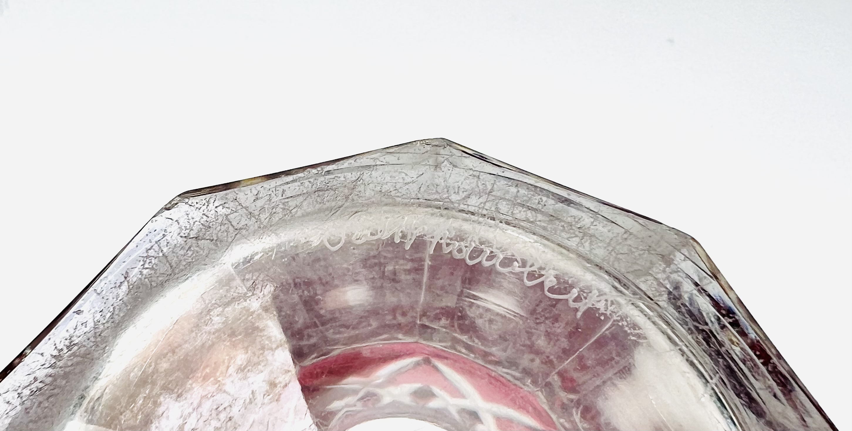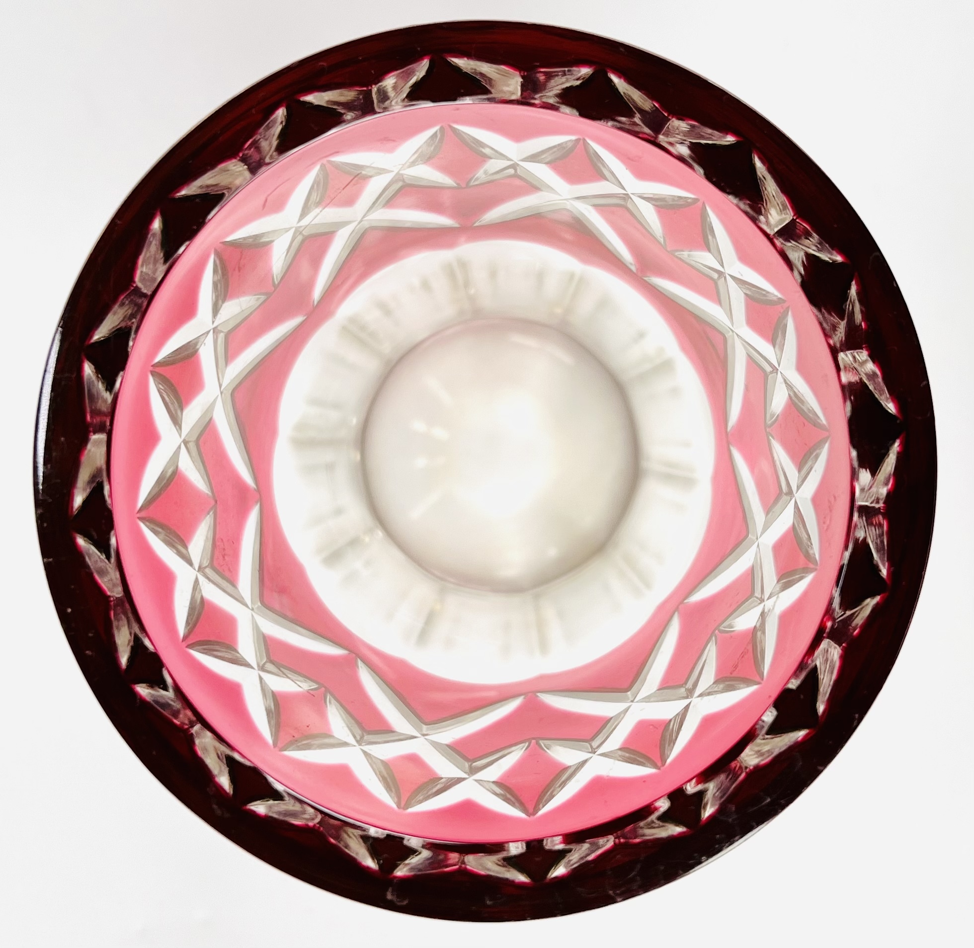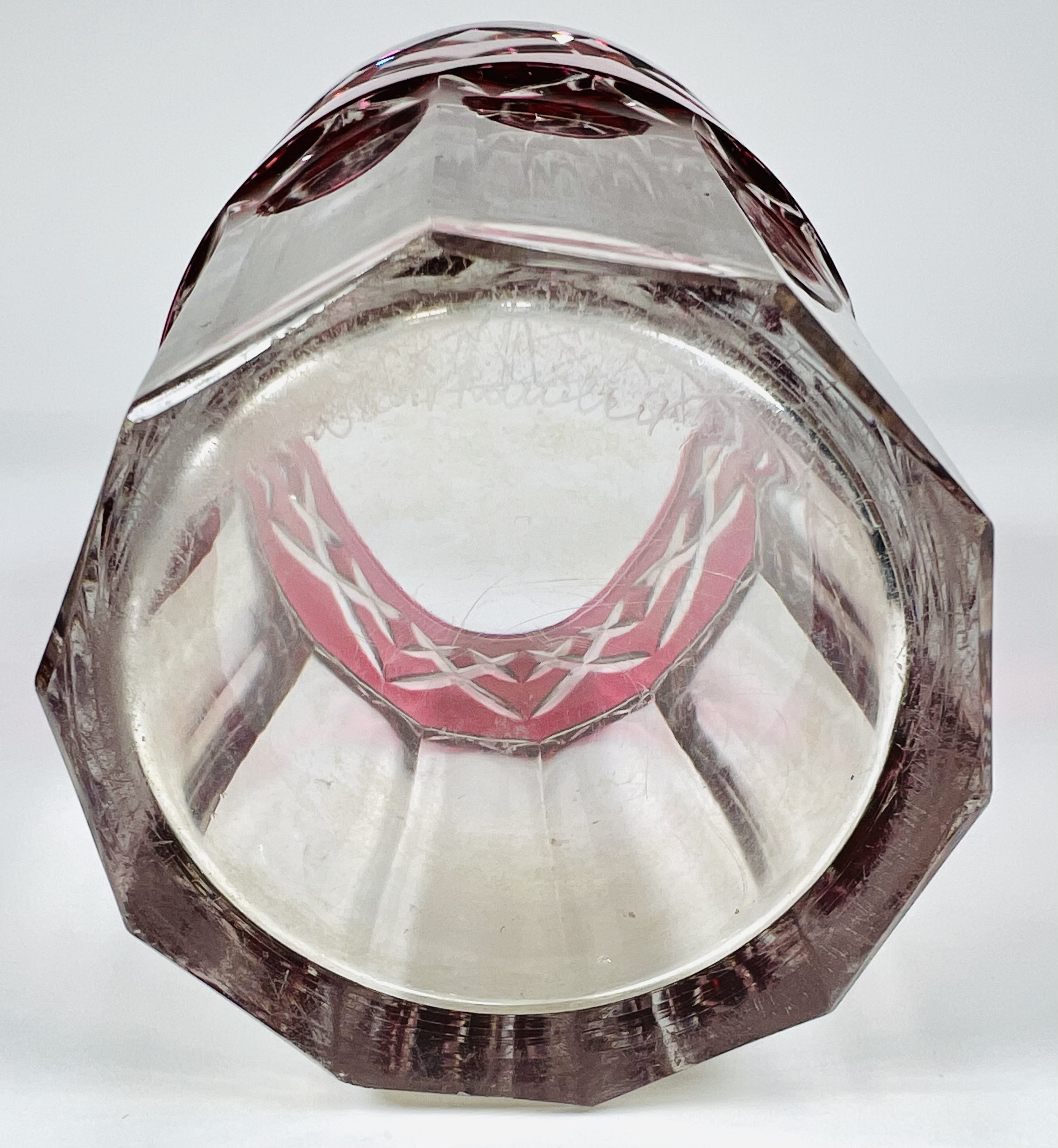 Kristallen rode überfang vaas met geslepen facetten en kruispatroon van Val Saint Lambert. Vaas is aan de onderzijde gemerkt middels gravering. Seraing, België, derde kwart 20e eeuw. |