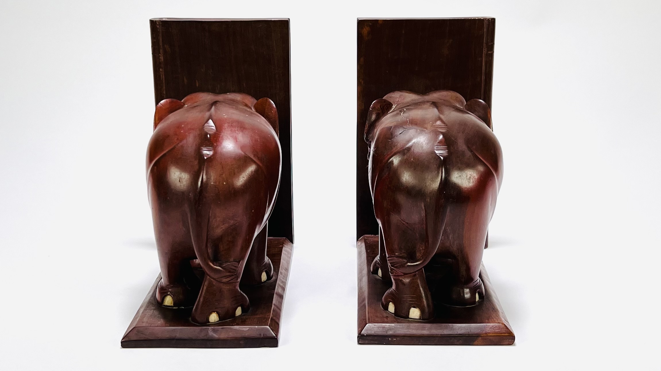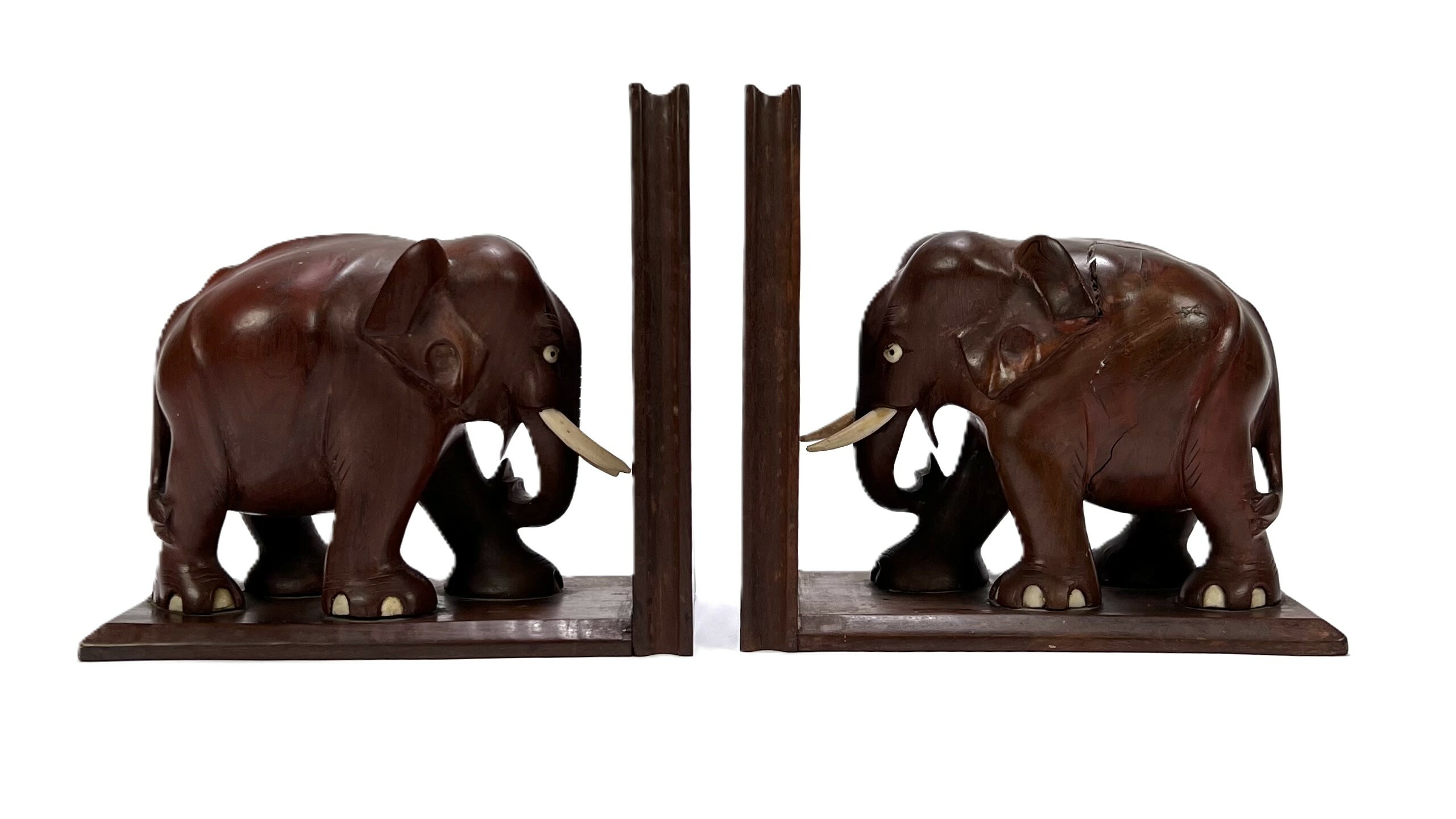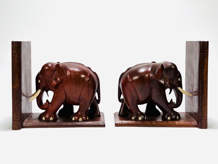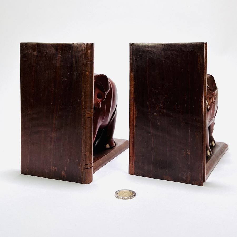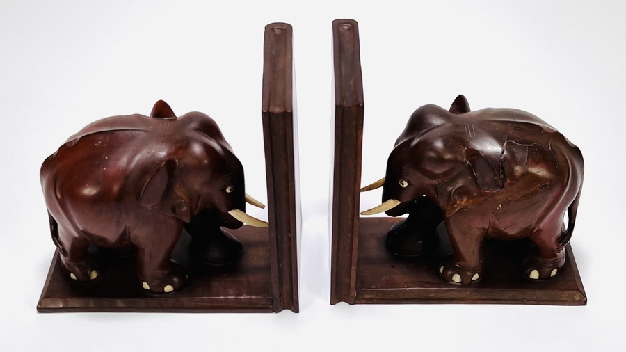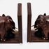 Gestoken hardhouten boekensteun met olifanten, midden 20e eeuw. |