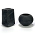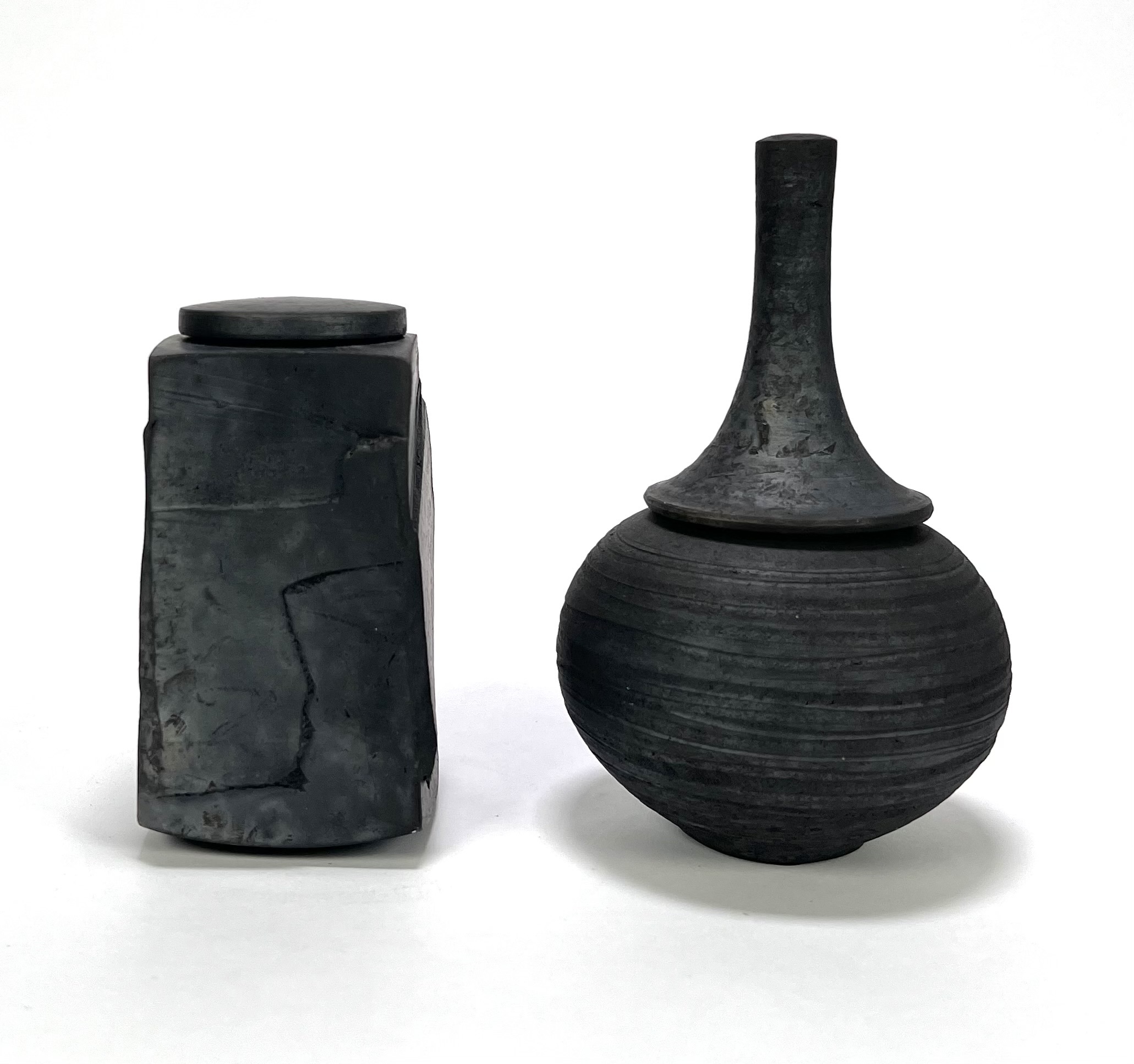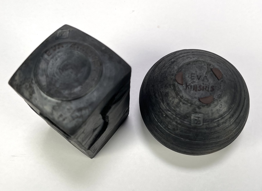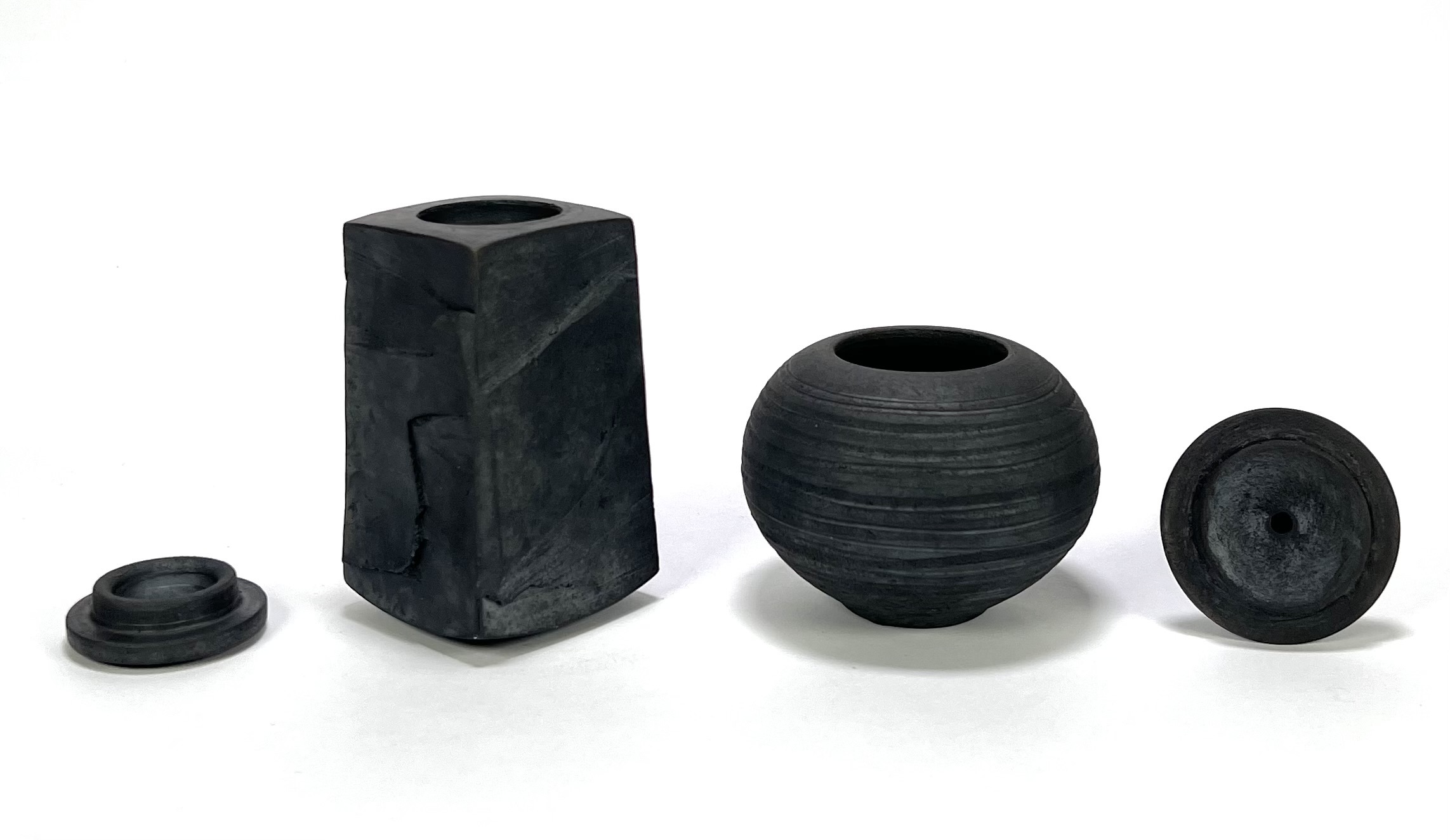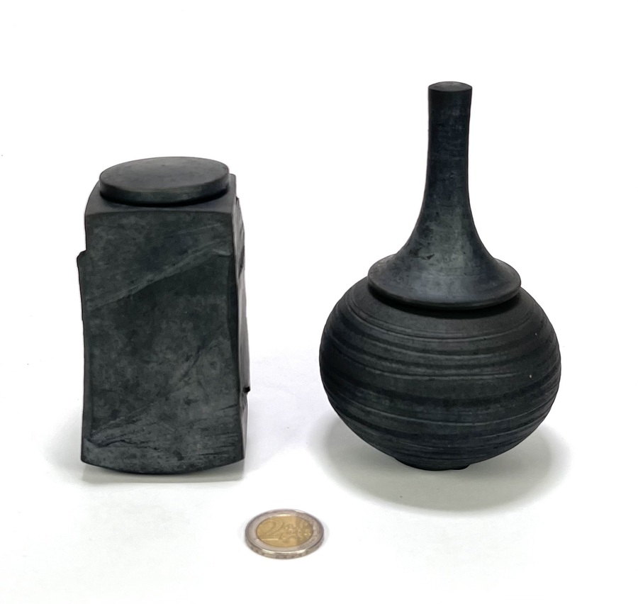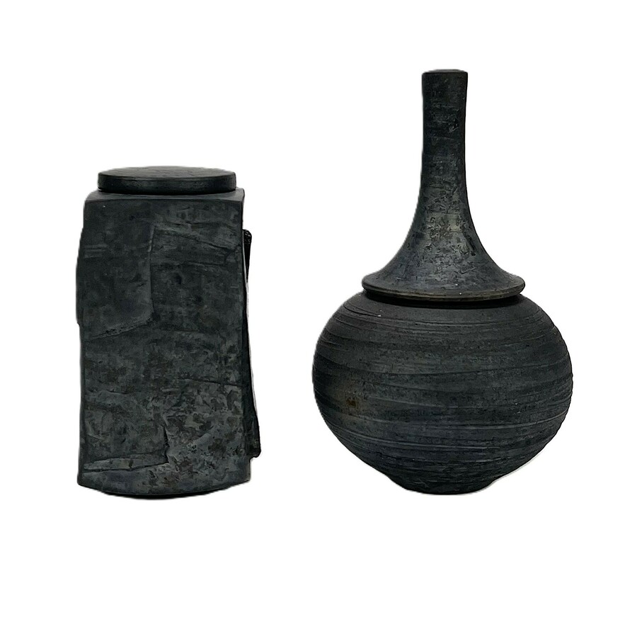 Twee matzwarte keramieken dekselpotjes in Raku techniek door Eva Kinzius. Aan de onderzijde gemerkt met logo. Duitsland, begin 20e eeuw. |