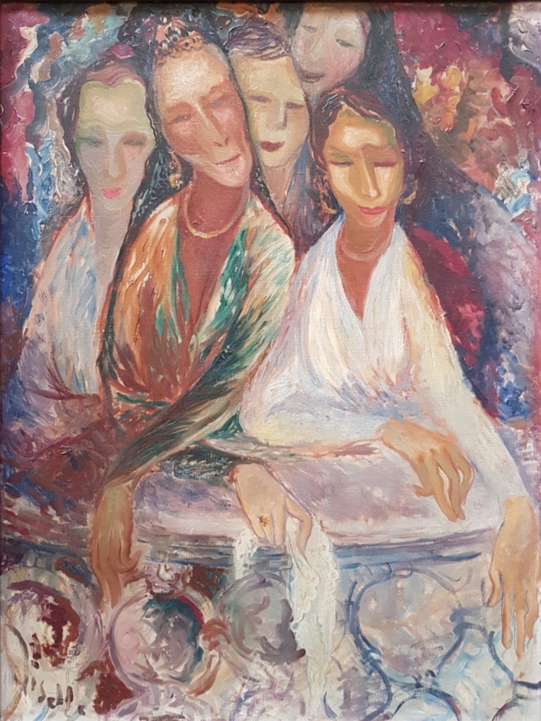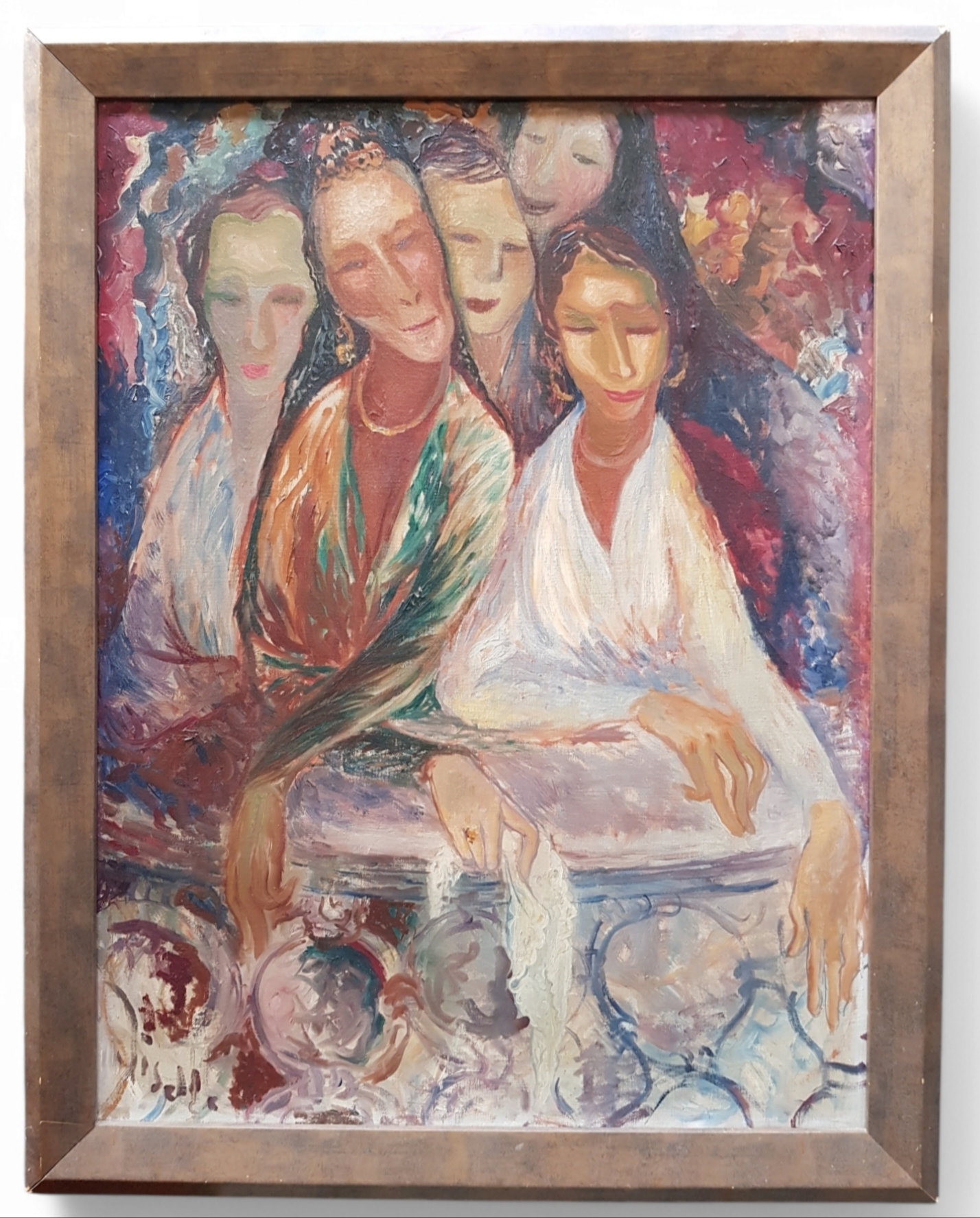 Schilderij van dames op balkon door Giselle Kuster (Venlo, 1911 - Heerlen, 1972). Olieverfschilderij op doek, linksonder gesigneerd, midden 20ste eeuw. |