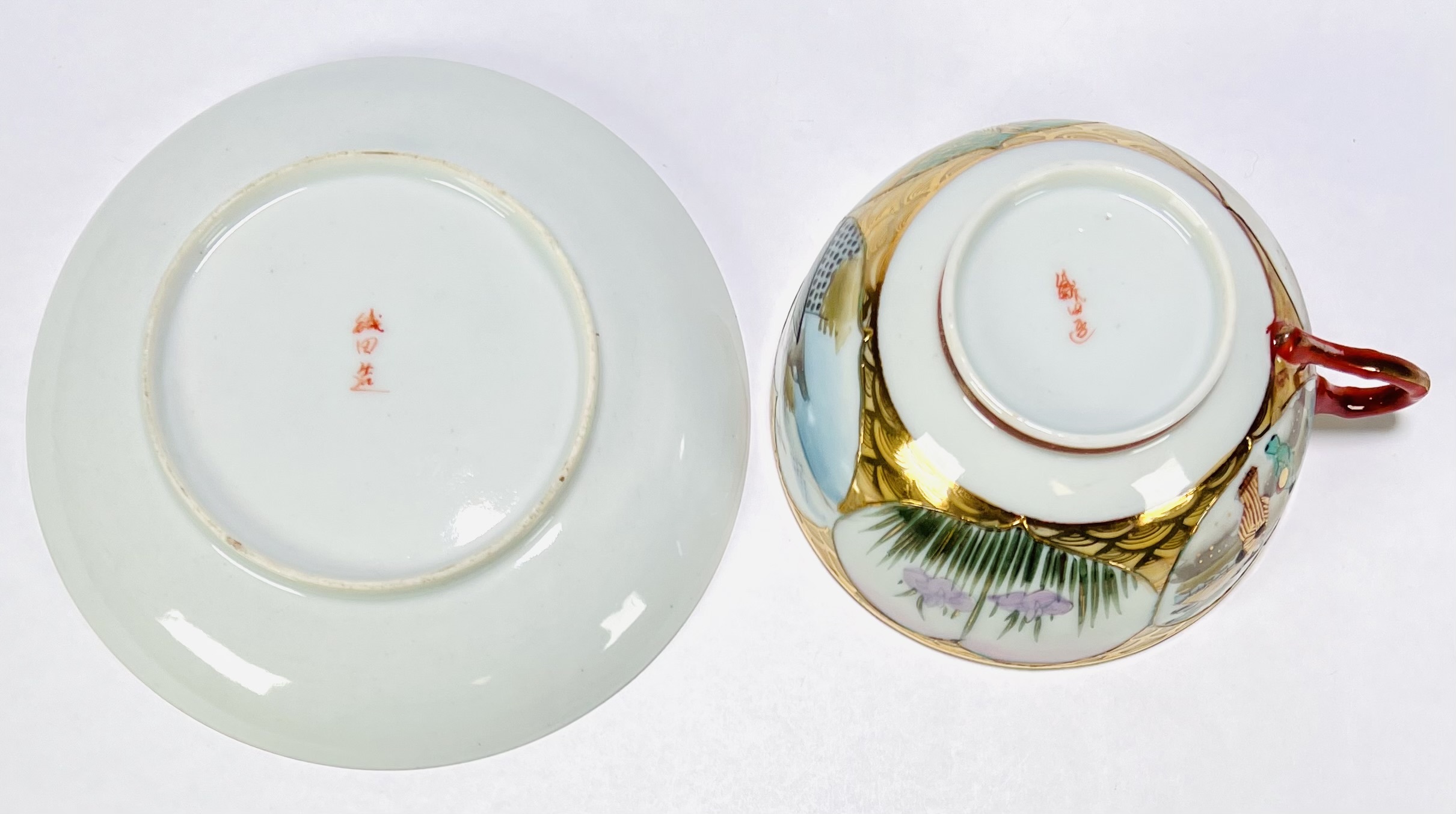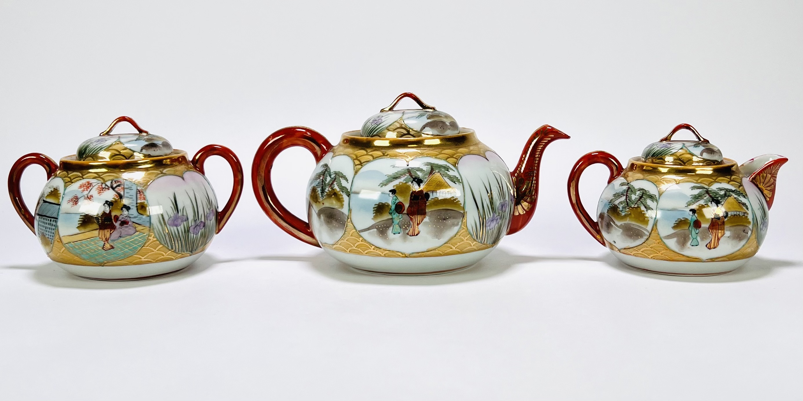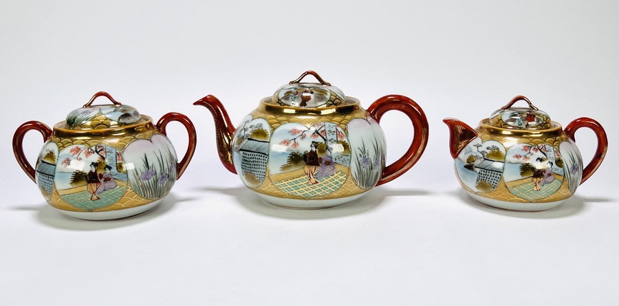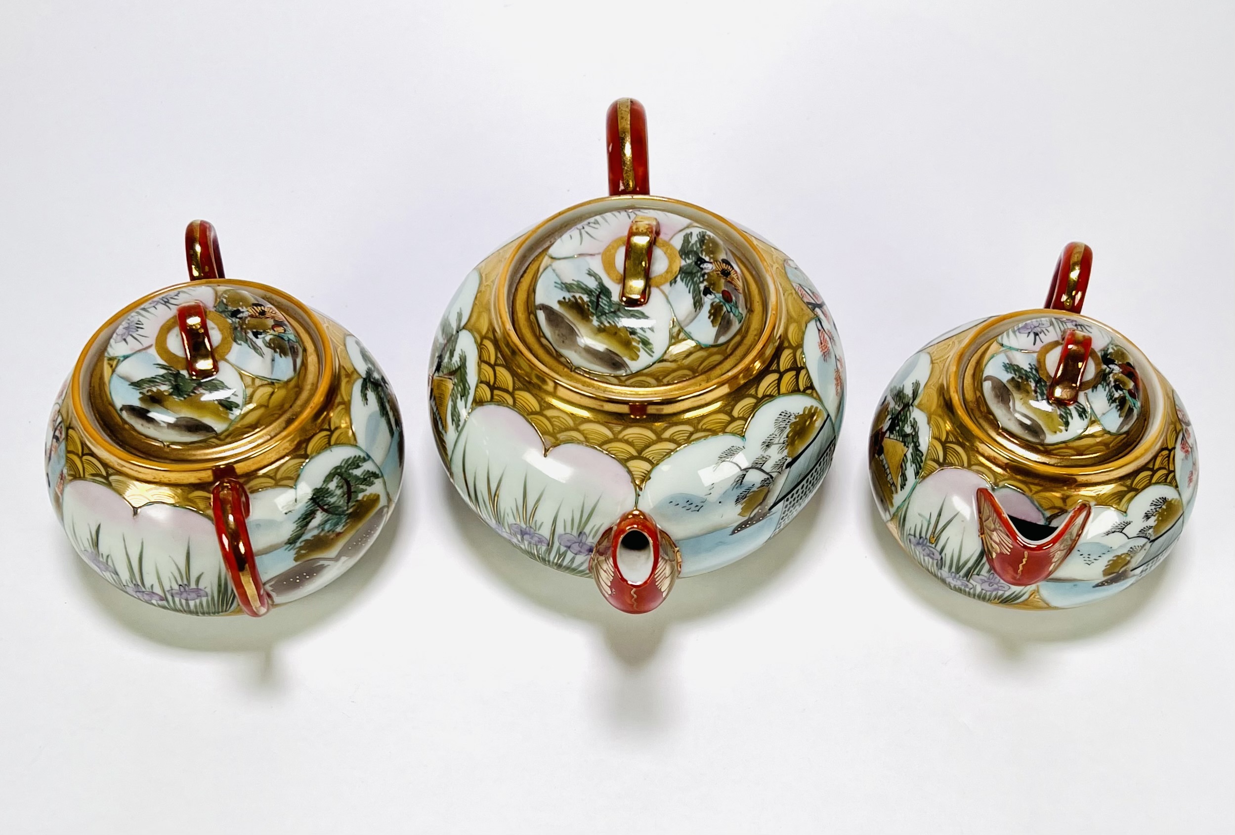 Japans Kutani porseleinen handbeschilderd theeservies bestaande uit theepot, suiker- en melkstel, zes schotels, vijf theekopjes en dienblad. Aan de onderzijde gemerkt met Japanse karakters, begin 20e eeuw. |