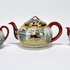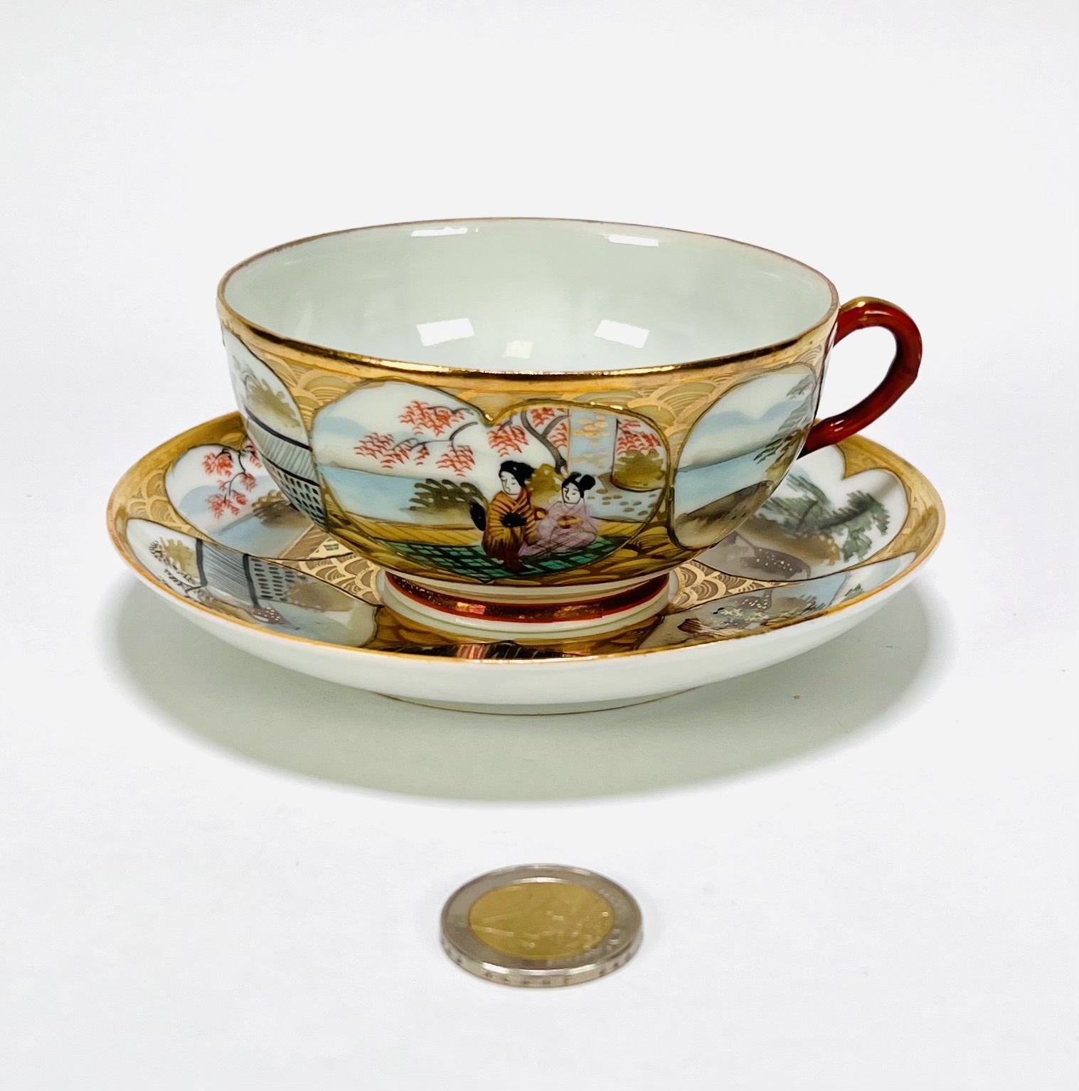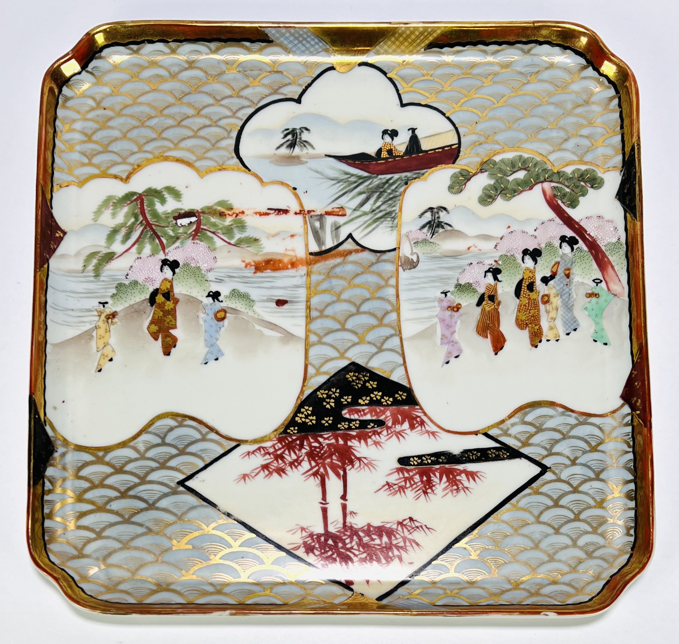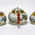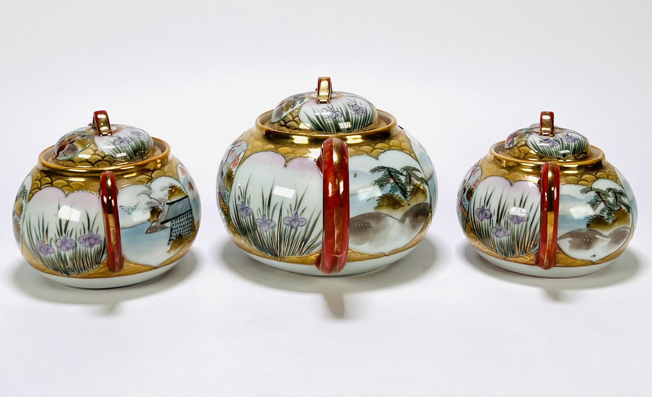 Japans Kutani porseleinen handbeschilderd theeservies bestaande uit theepot, suiker- en melkstel, zes schotels, vijf theekopjes en dienblad. Aan de onderzijde gemerkt met Japanse karakters, begin 20e eeuw. |
