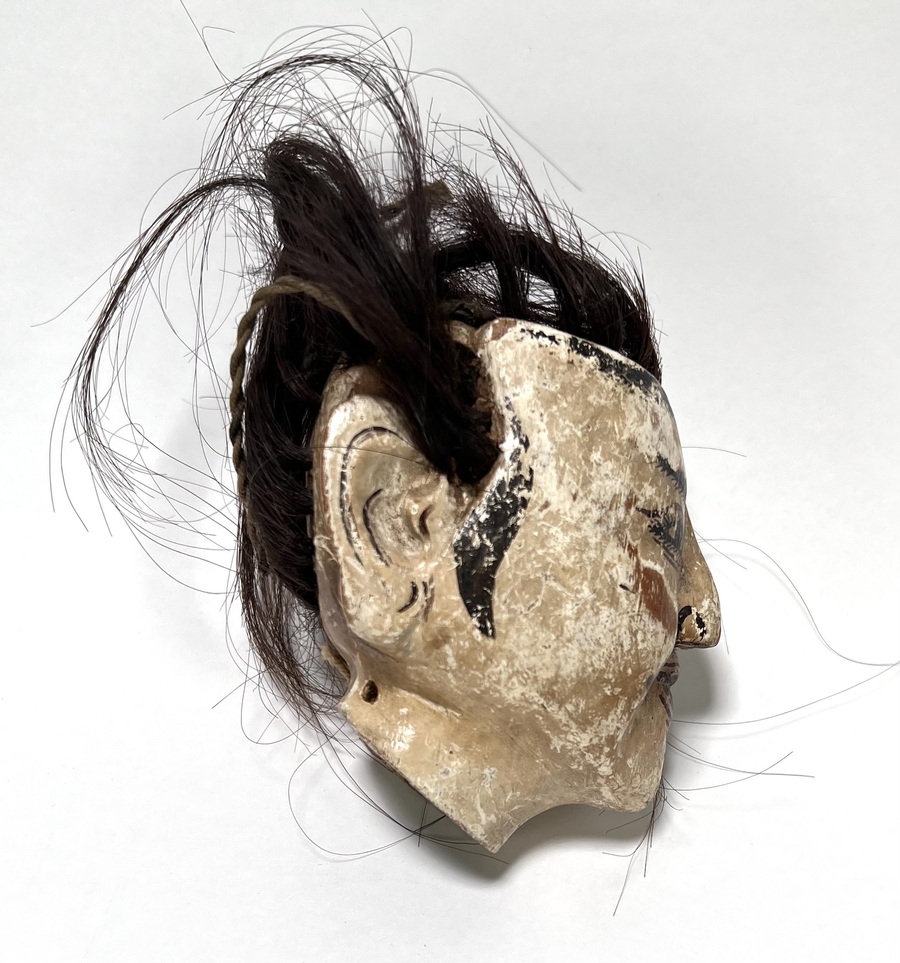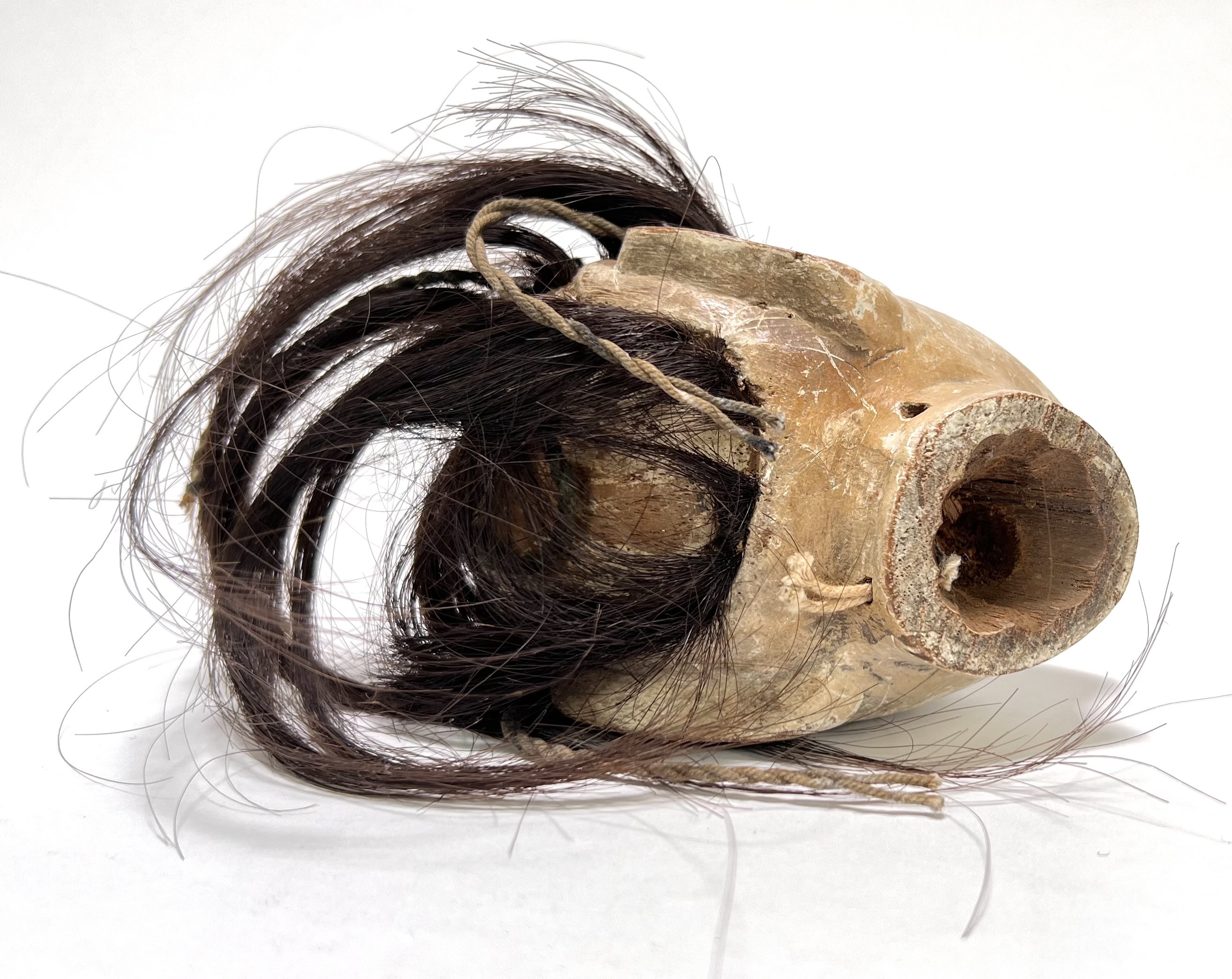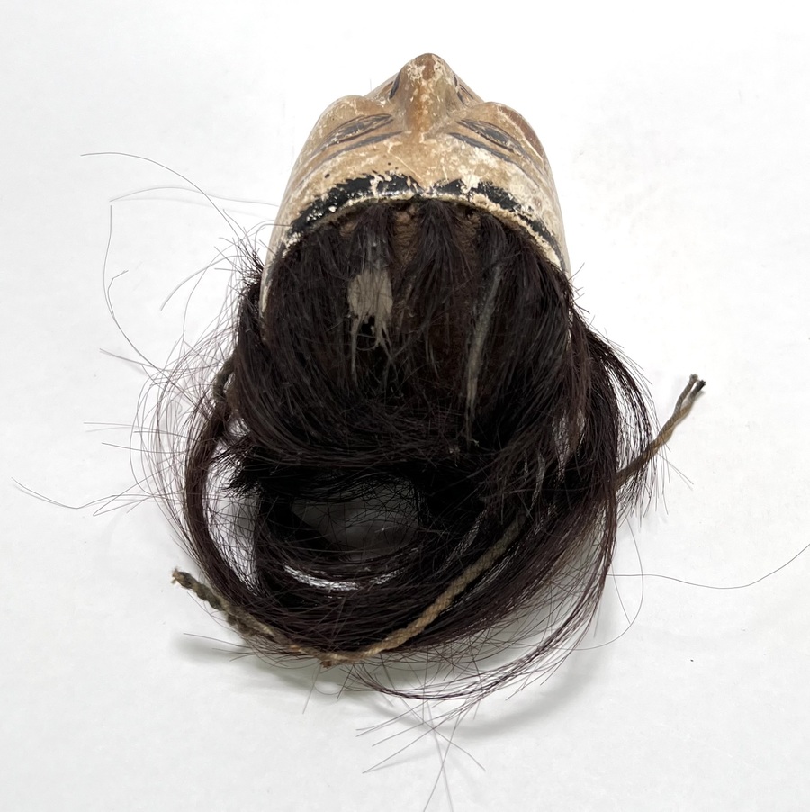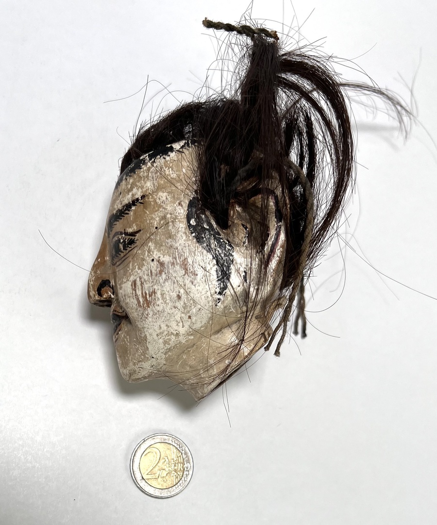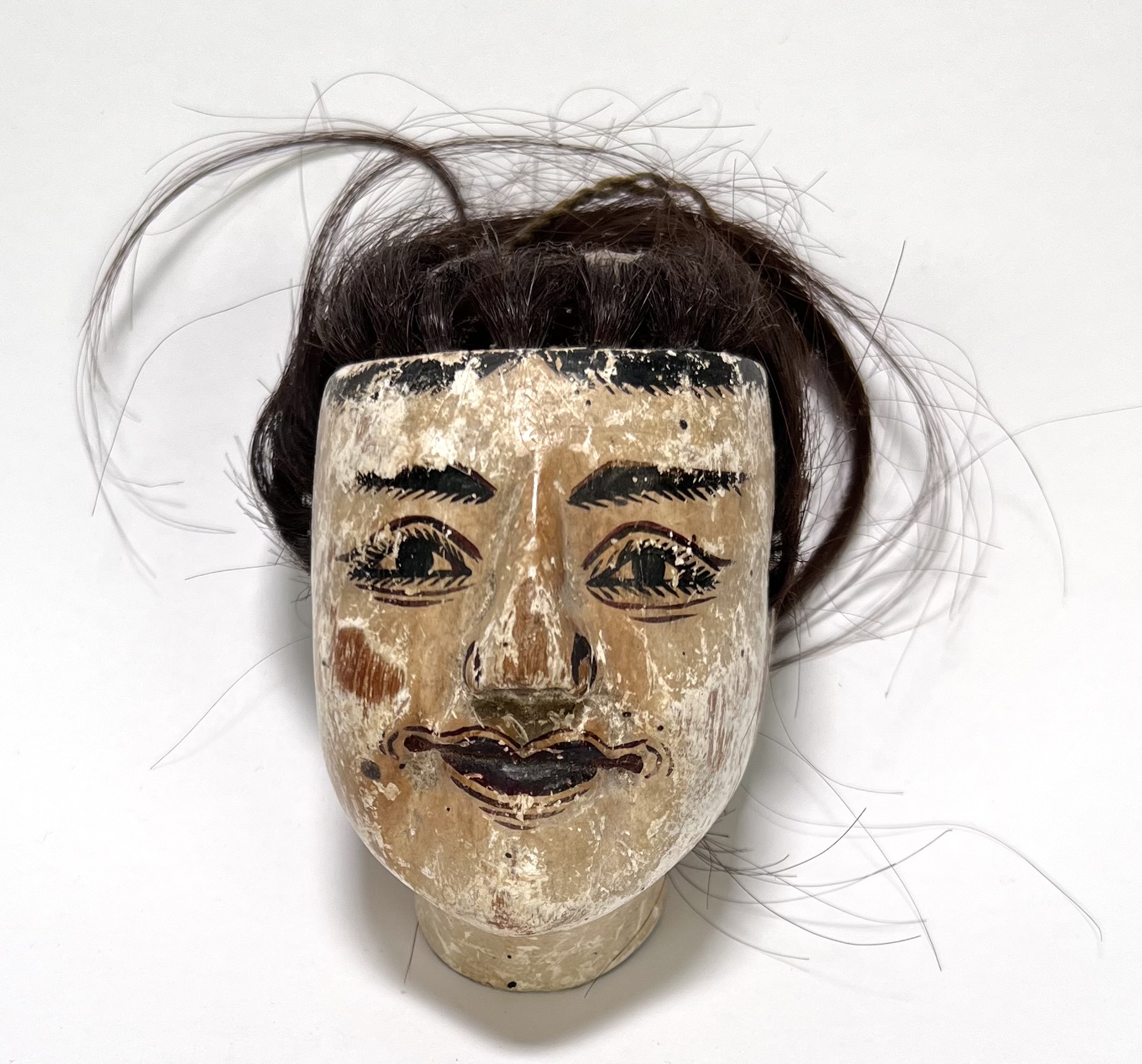 Houten Birmees handbeschilderd hoofdje met mensenhaar. Eind 19e eeuw. |