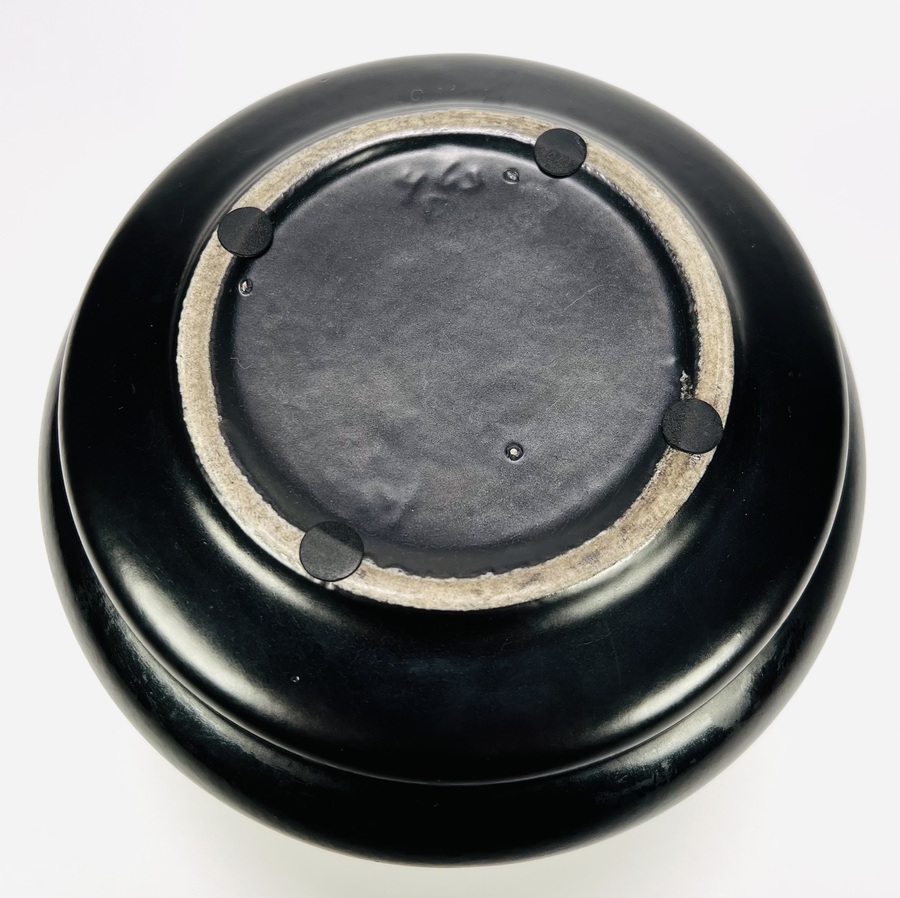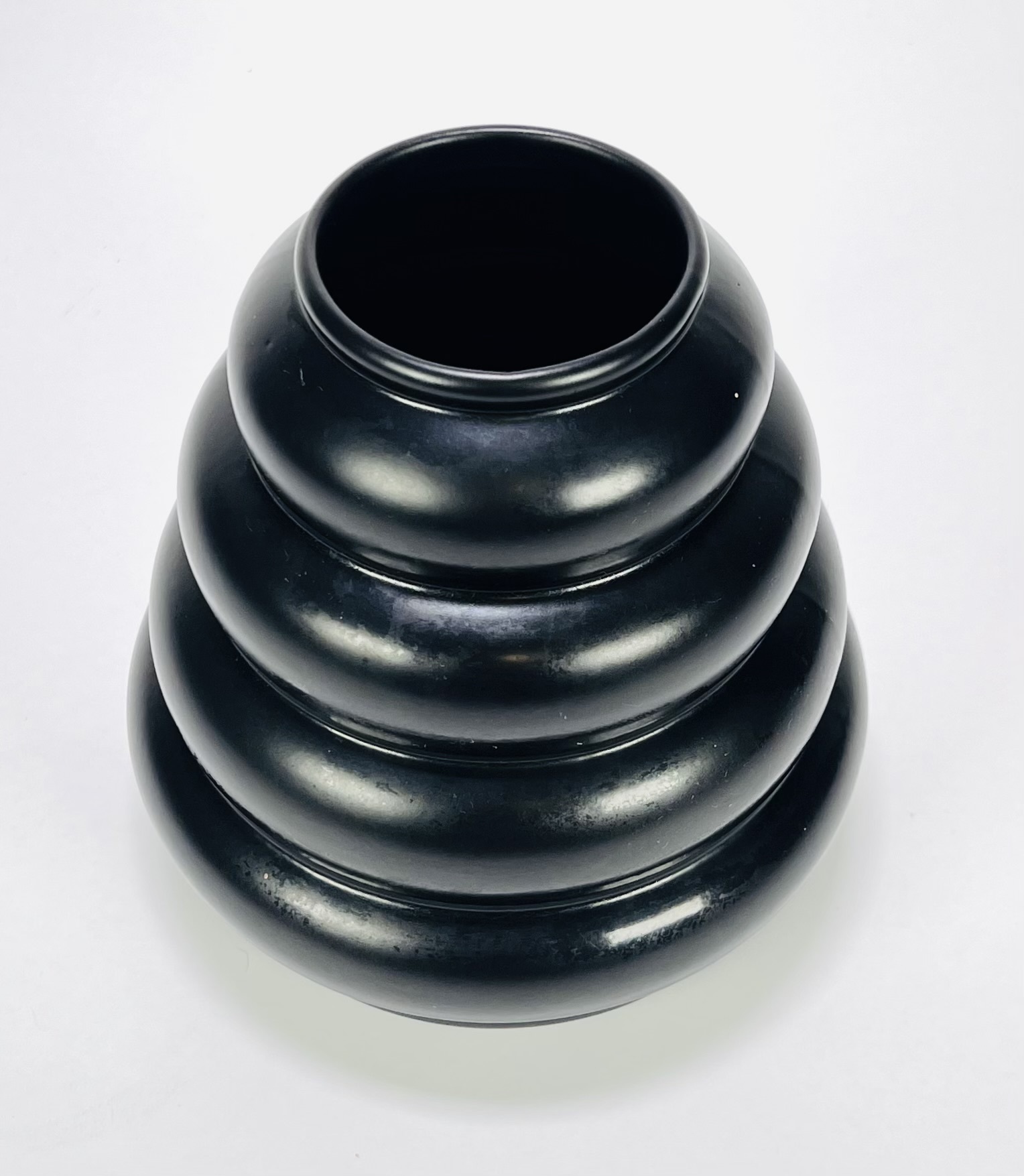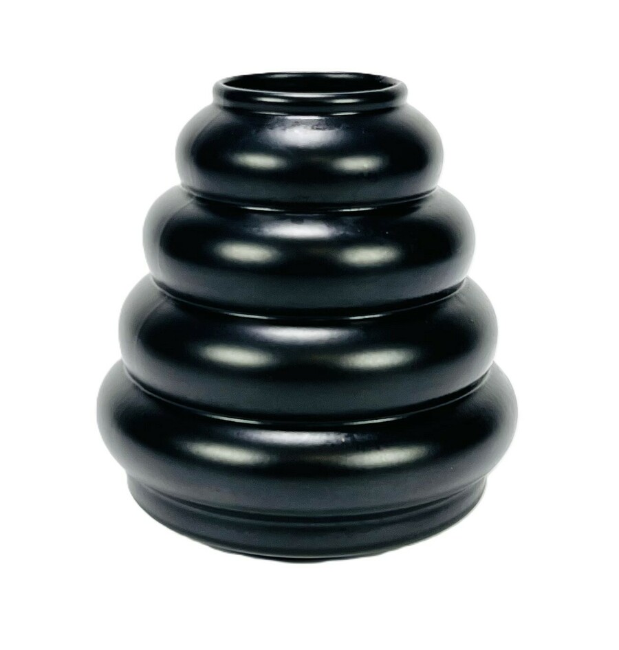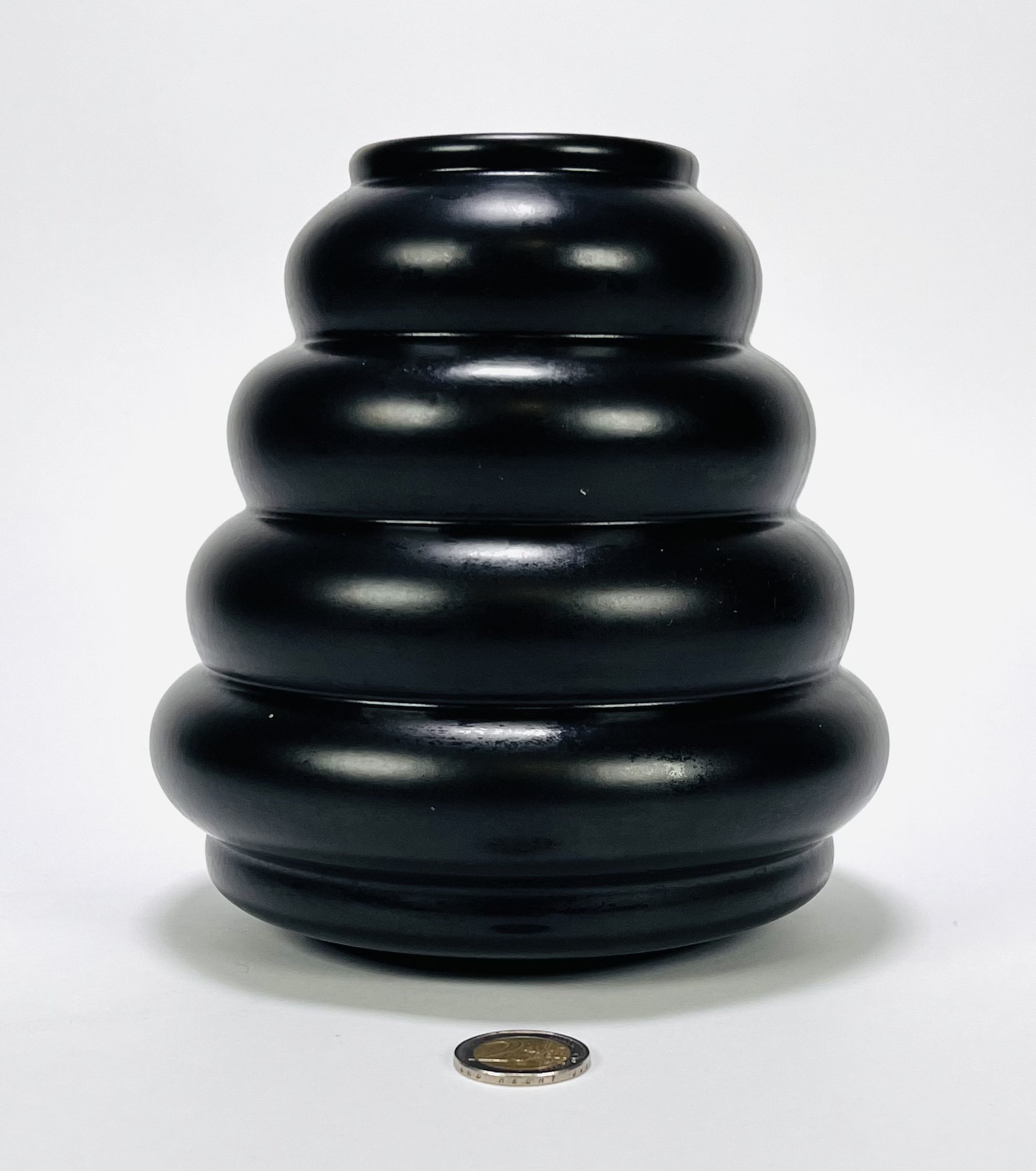 Zwarte horizontaal geribde Art Deco vaas door Potterie De Driehoek, Huizen. Aan de onderzijde vermelding van modelnummer 463. Jaren 30/40 |