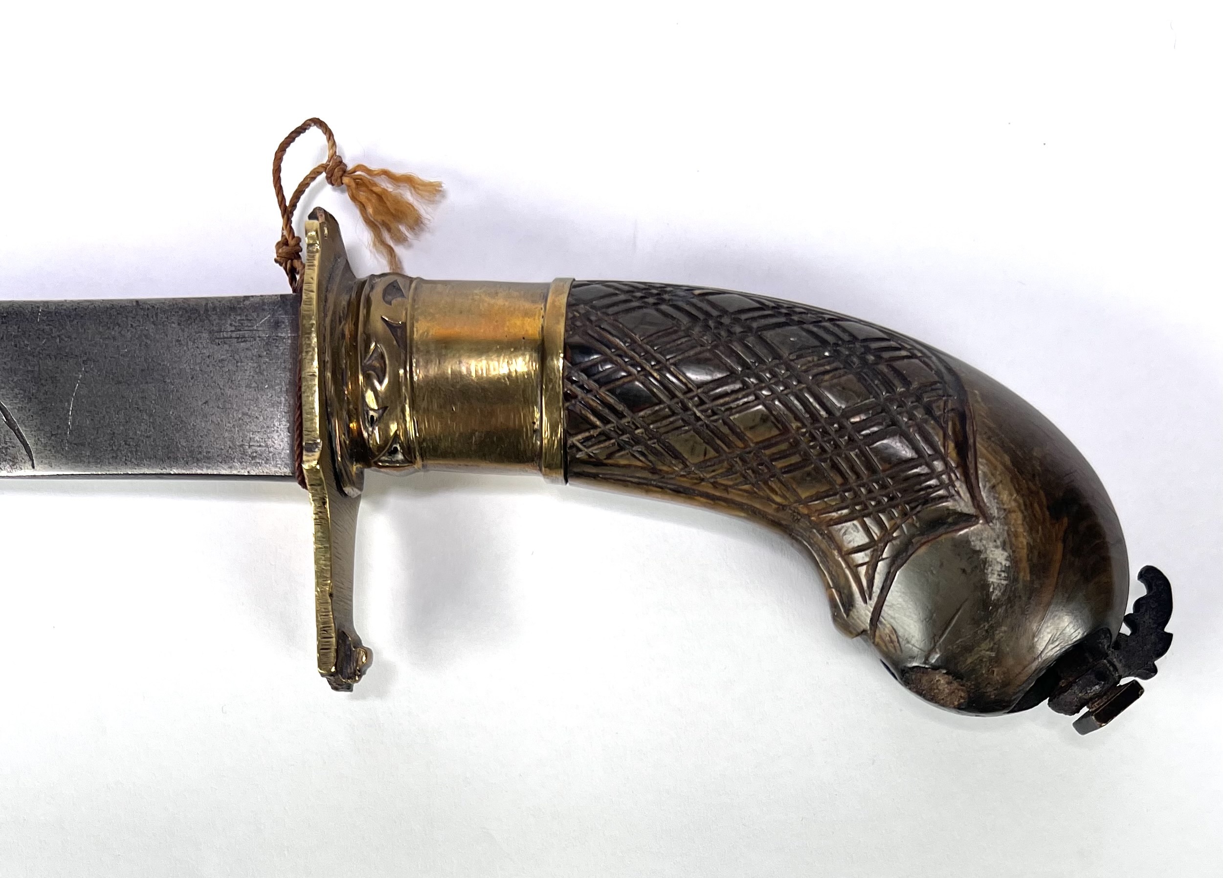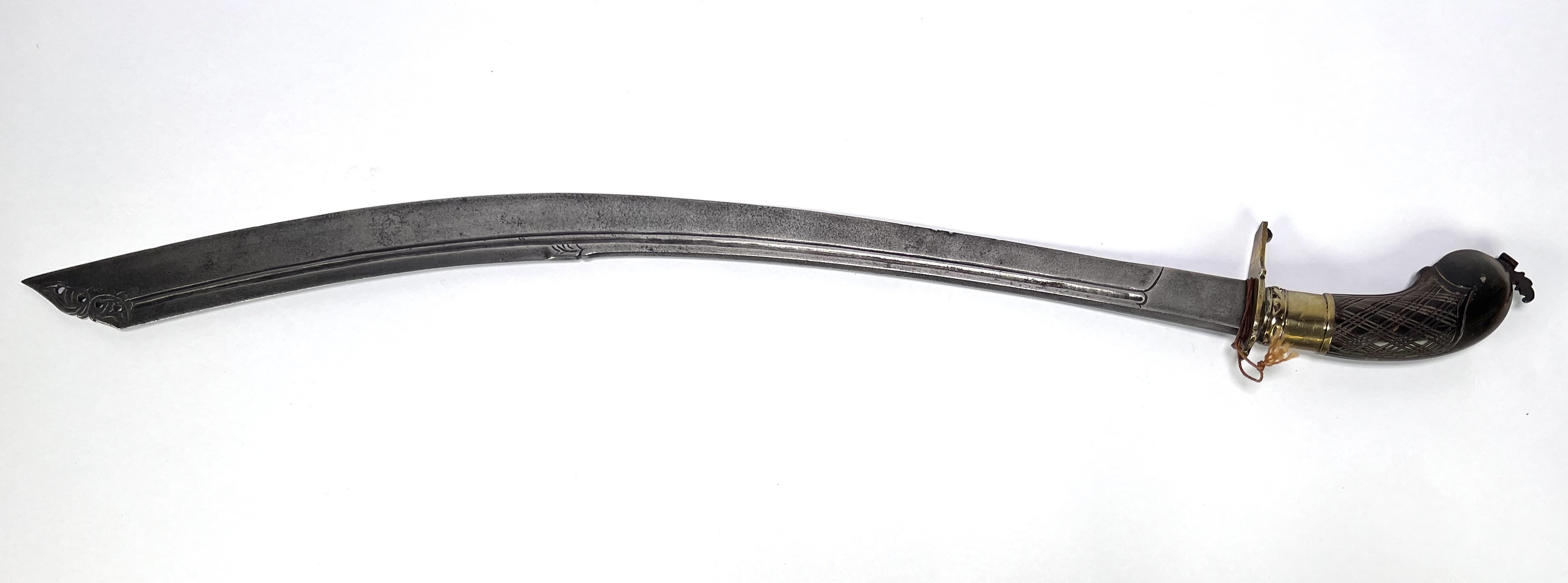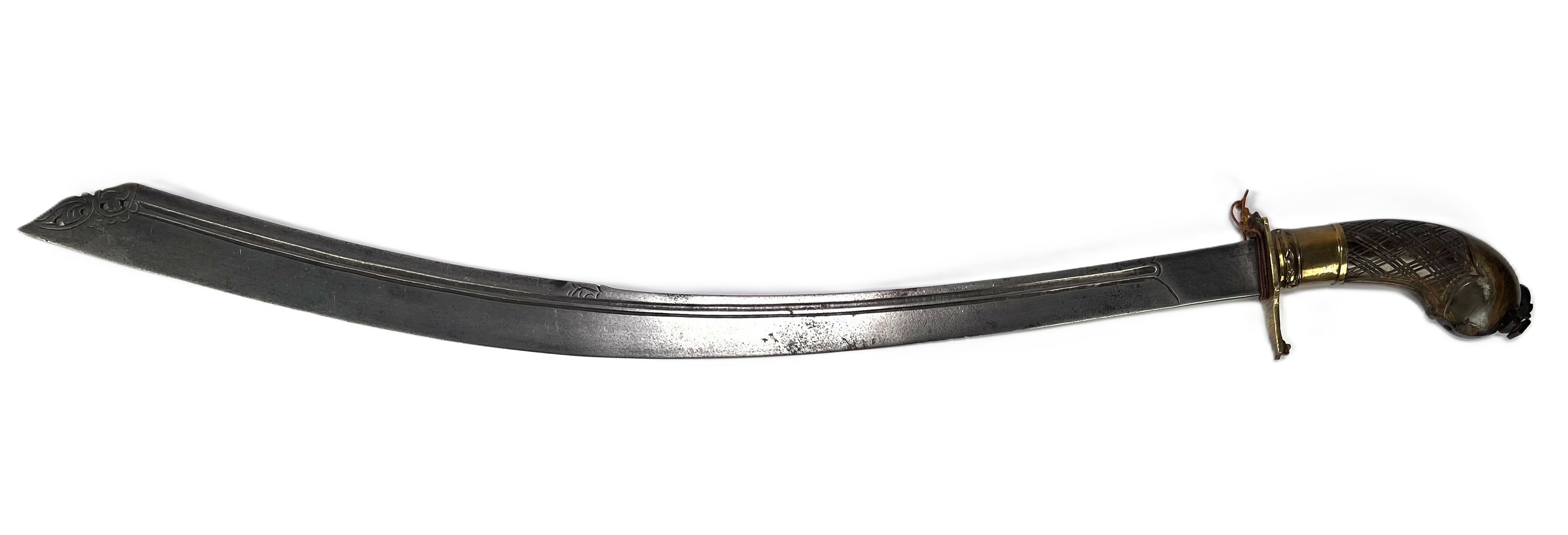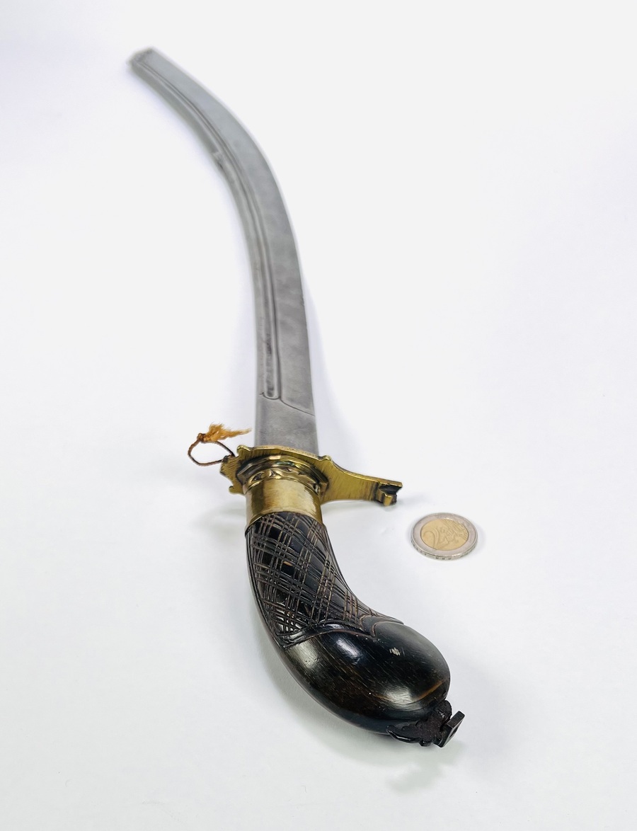 Zwaard, een zogenaamde Belada belabang, bewerkt met houten pistoolgreep en fraai uitgewerkte kling. Oorsprong Indonesië of Maleisië, 19e eeuw. |