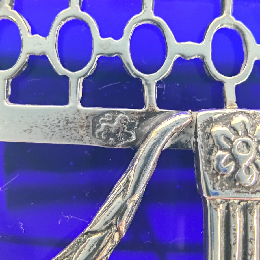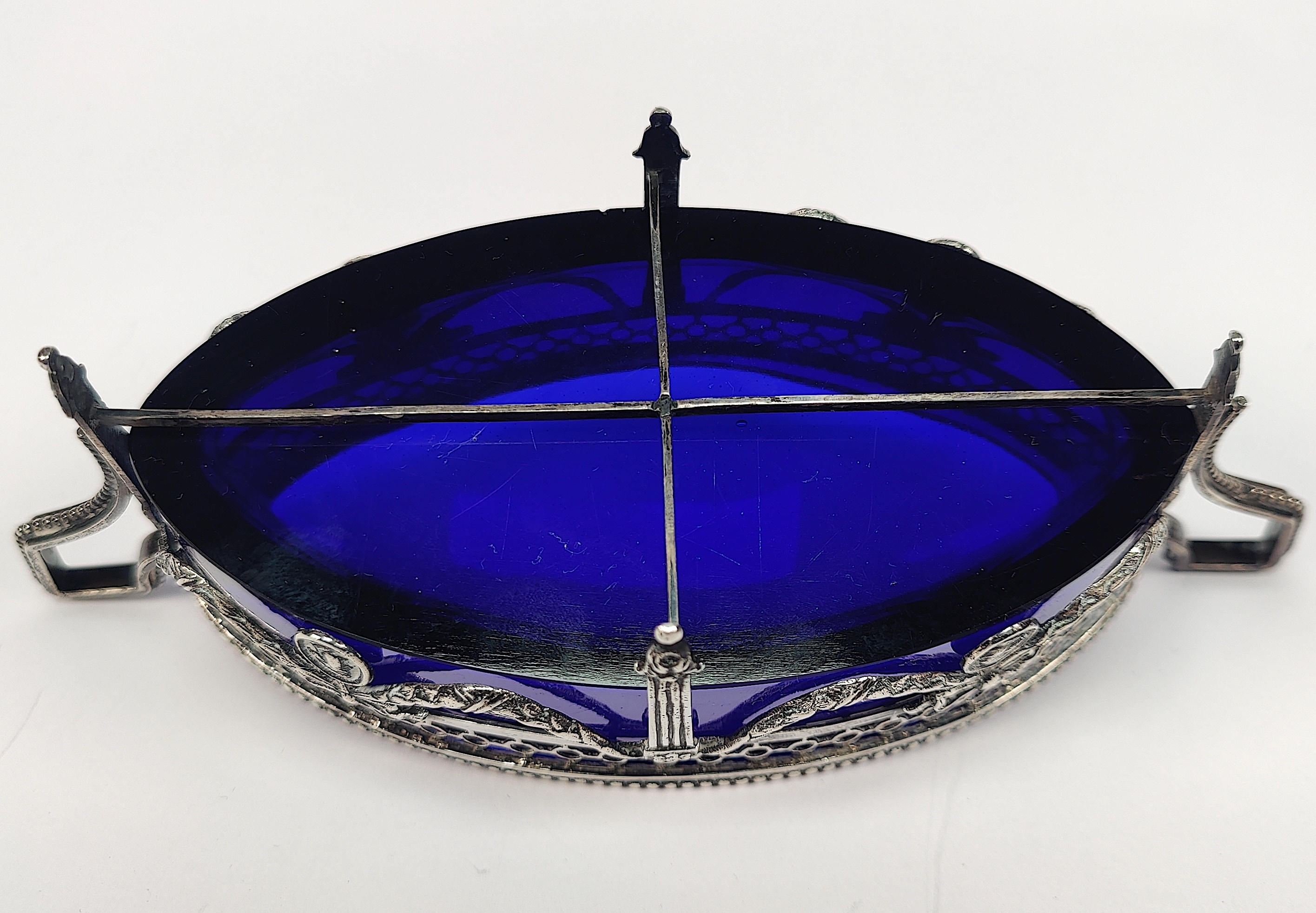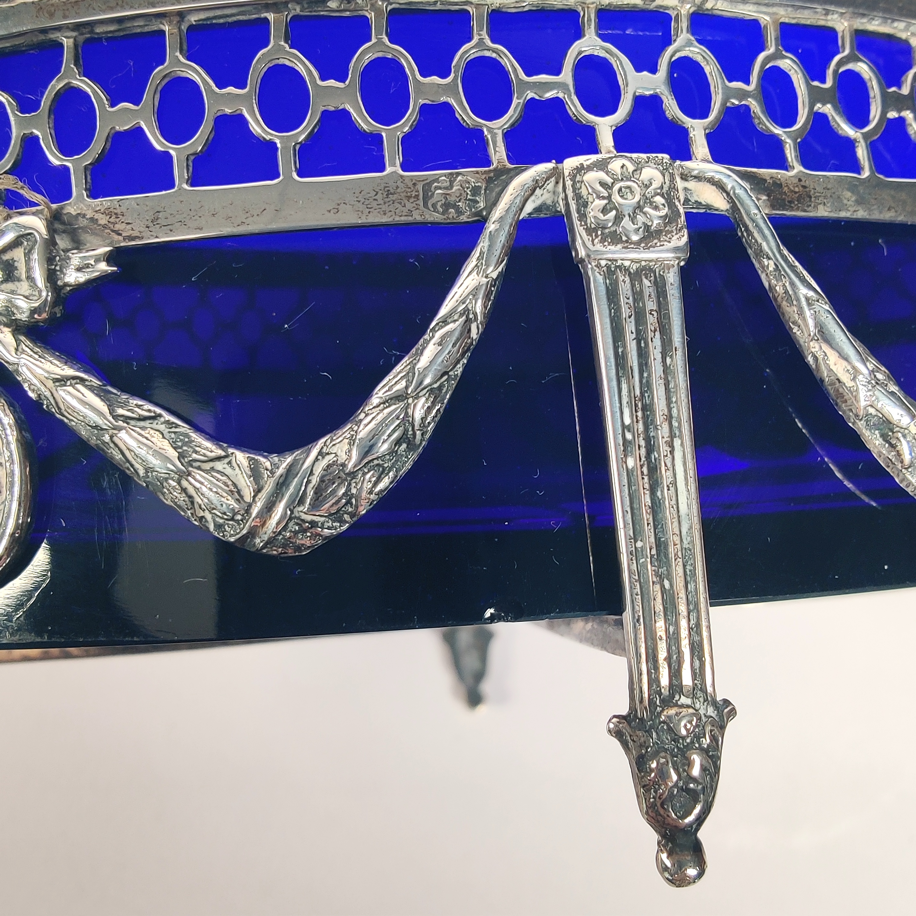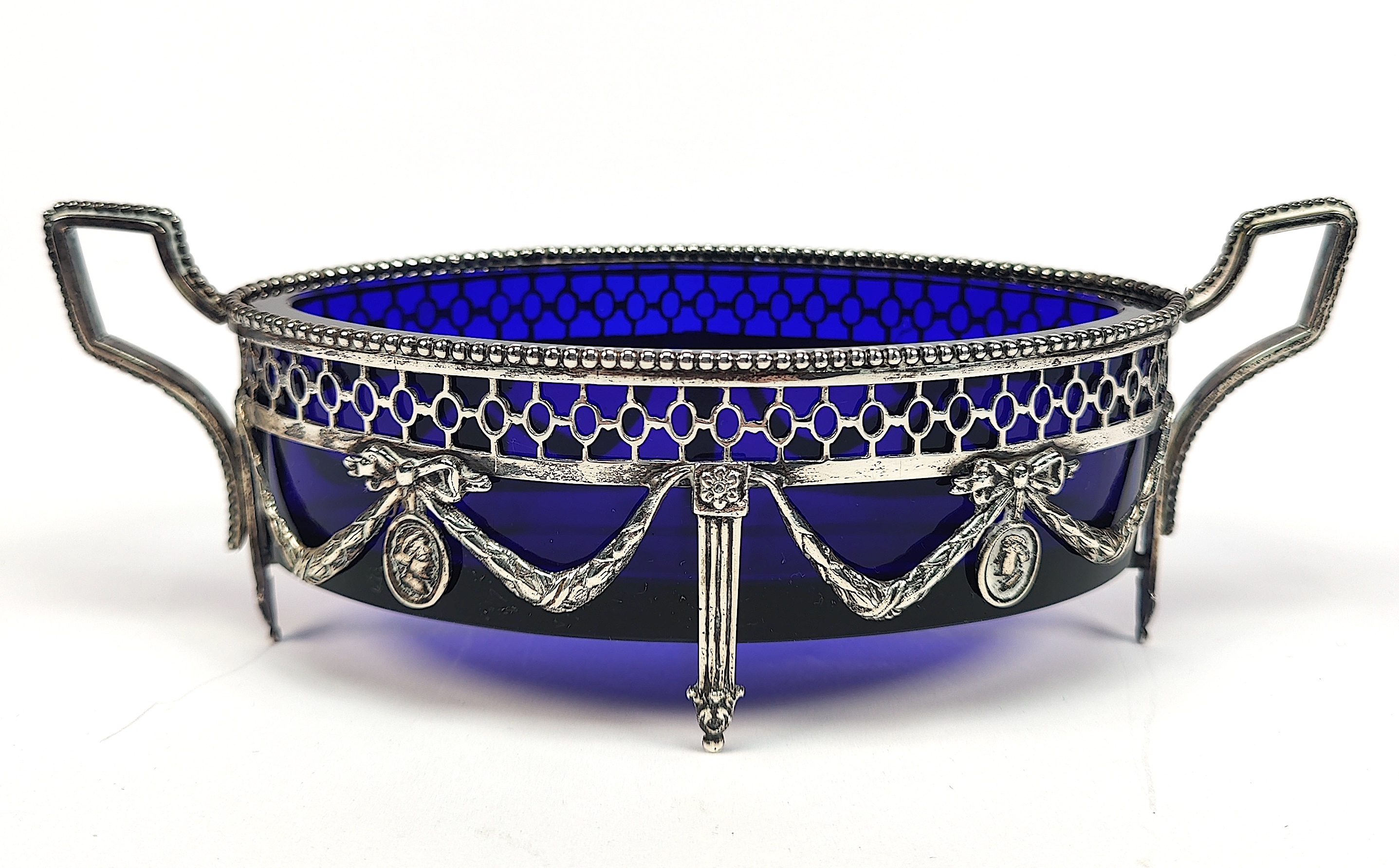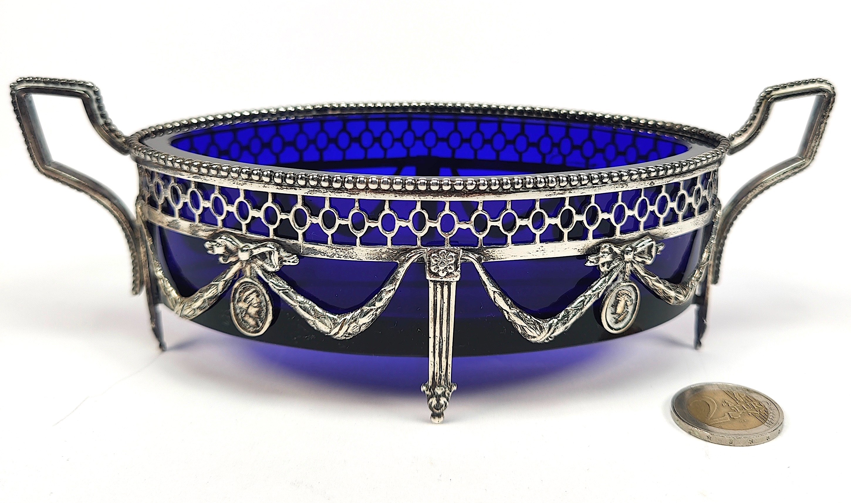 Zilveren ovalen jardinière in Lodewijk XVI-stijl met geslepen blauwe glazen binnenbak. Gekeurd lopende leeuw 2, begin 20e eeuw. |