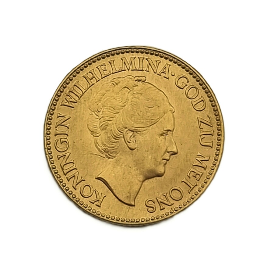 Gouden tientje met het portret van Wilhelmina op oudere leeftijd met opgestoken haar uit 1933. Bevat 900/1000 goud en gemerkt met muntmeesterteken zeepaard. Rondom de munt is de tekst "KONINGIN WILHELMINA, GOD ZIJ MET ONS" geschreven en op de weerszijde is het gekroond Nederlands wapenschild afgebeeld.