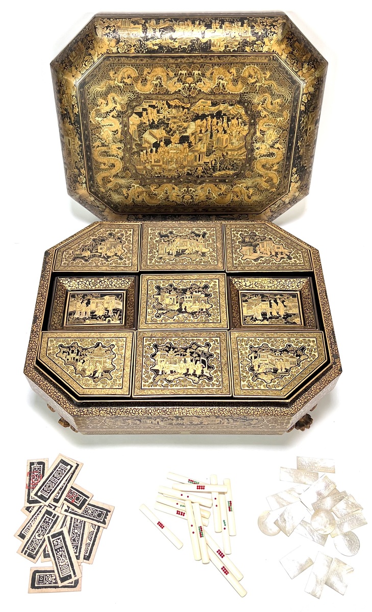 Chinese exportlak mahjong doos, achthoekig van vorm, vervaardigd in Canton, China, circa 1880. De doos is uitgevoerd in zwart gelakt hout met schilderingen en rust op klauwpoten. Het interieur bevat zeven losse gelakte dozen met speelstukken en decoratieve bakjes. De decoratie toont vergulde scènes met figuren in paviljoen- en tuinomgevingen, typerend voor de Canton exportlaktraditie.