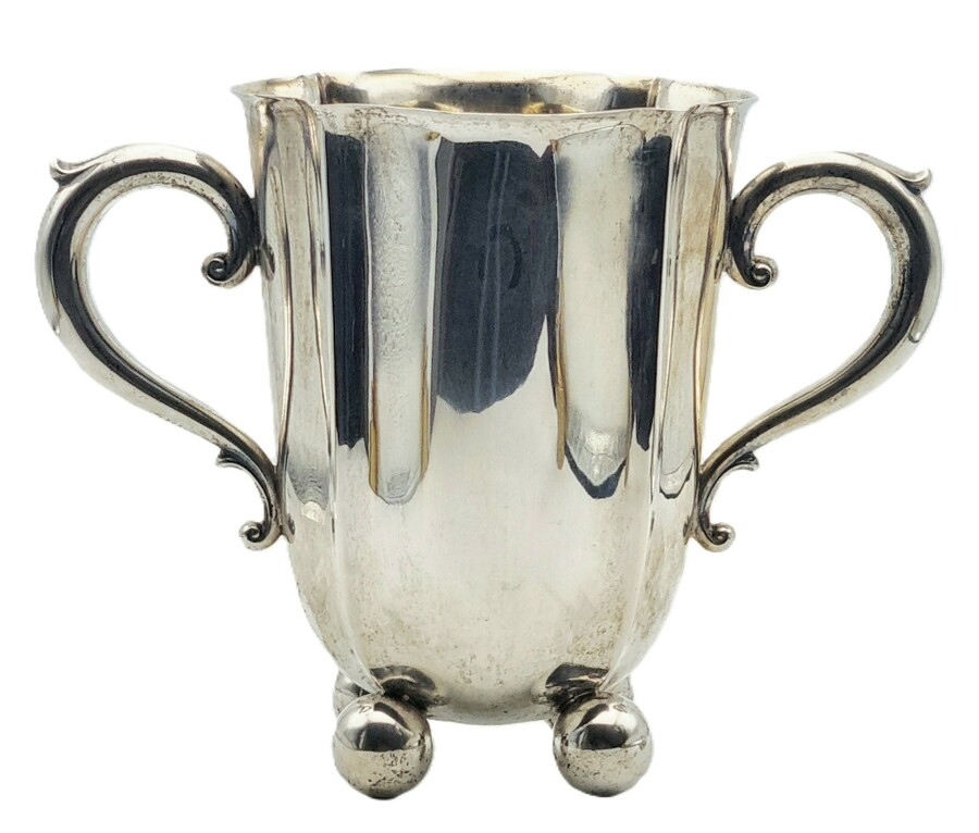 Zilveren champagnekoeler van Thiesenhusen, begin 20e eeuw, gehalte 800/1000, gemerkt onderzijde met “Thiesenhusen”, “800” en diverse keurmerken. Uitgevoerd met lobvormige wandindeling, twee sierlijke C-vormige krulhandgrepen en vier balvormige pootjes. Vormgeving combineert laat 19e-eeuwse neobarokinvloeden met strakke verticale lijnen.
