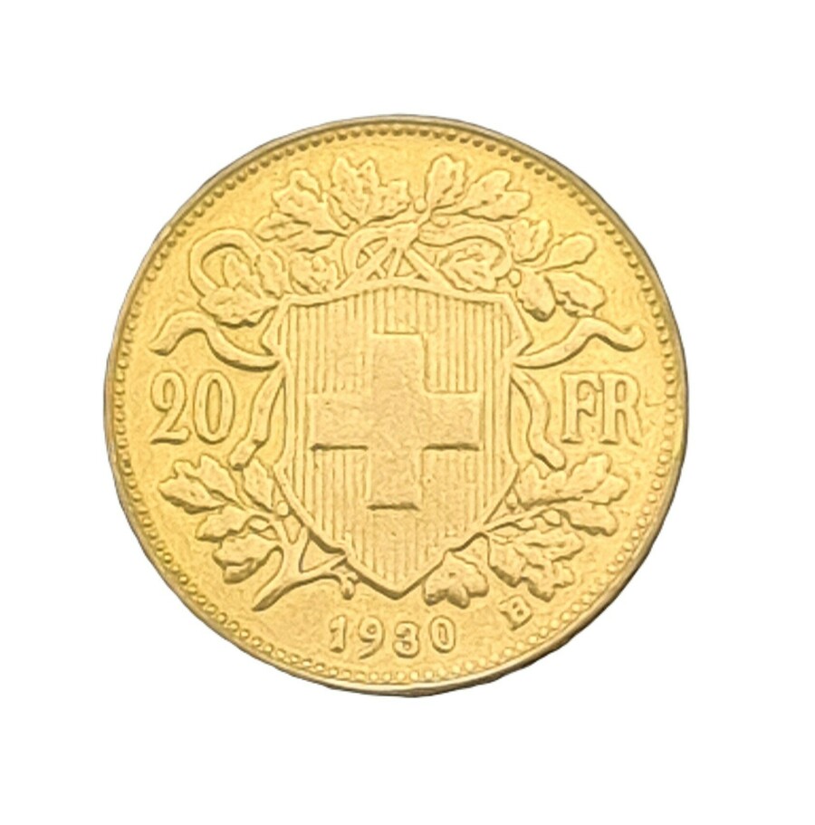 Gouden 20 Zwitserse frank, 1930, Zwitserland; geslagen door de Zwitserse Munt te Bern (muntteken B). Voorzijde met buste van Helvetia links en berglandschap; keerzijde met Zwitsers wapen tussen eikenloof, waardeaanduiding 20 FR en jaartal 1930 onderaan. Materiaal goud (900/1000), slagtechniek met verhoogd reliëf en parelrand. Klassiek nationaal ontwerp, ook bekend als Vreneli-type.