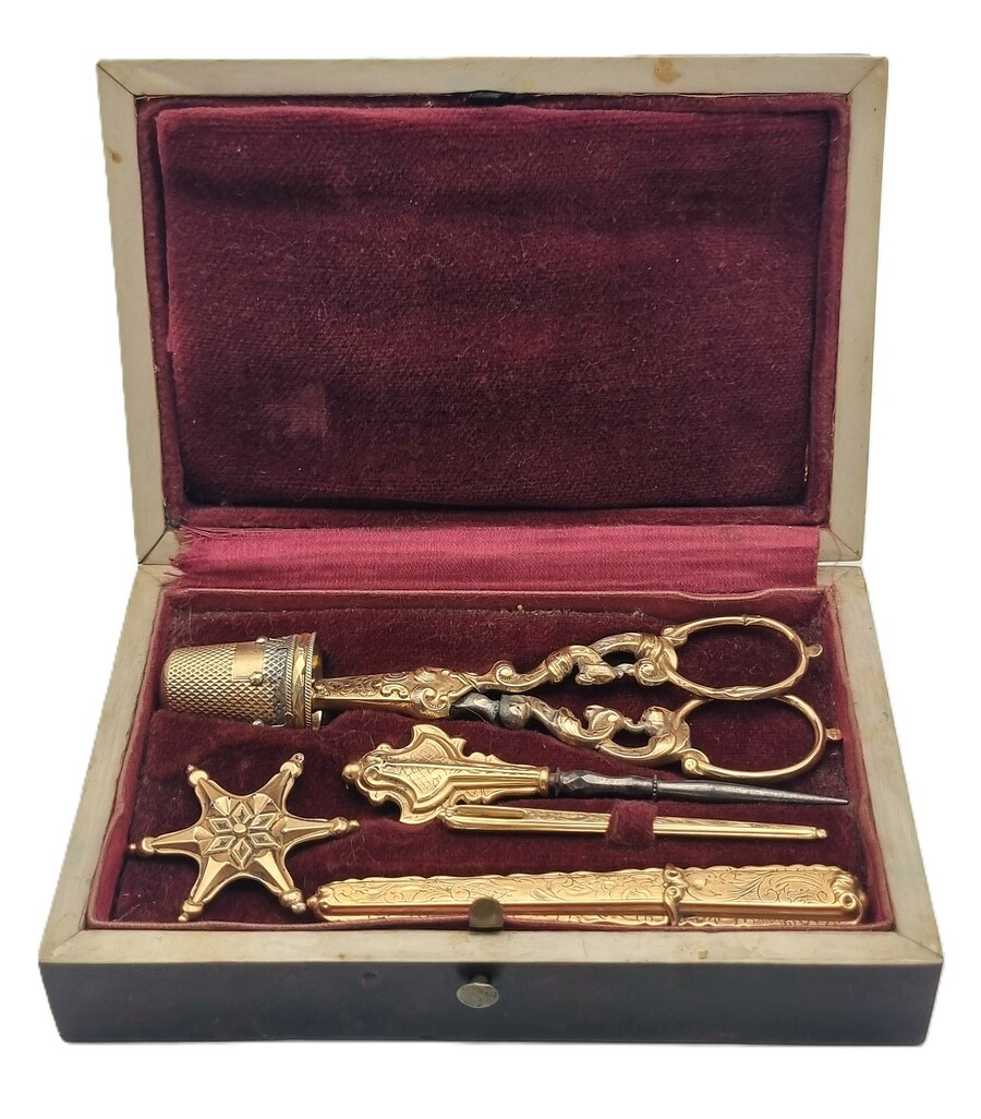 Empire naaigerei, midden 19e eeuw, uitgevoerd in 14 karaat goud, bestaande uit zes onderdelen waaronder schaar, vingerhoed en draadtrekker. De stukken tonen gegraveerde florale motieven en rocaille ornamentiek. Geplaatst in een tortoise doosje met rood fluwelen interieur. Getoetst 14 karaat en vervaardigd met fijn graveerwerk en handmatige afwerking, een representatief voorbeeld van 19e‑eeuwse luxe huishoudelijke gebruiksvoorwerpen.