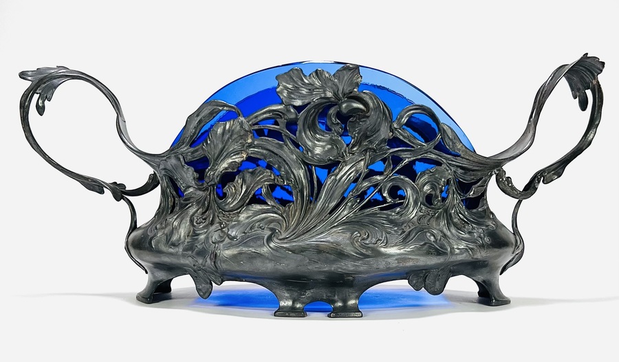 Jardinière uit de Art Nouveau periode, circa 1900. Tinnen opengewerkte montuur met florale iris-motieven en twee handgrepen; uitneembare kobaltblauwe glazen binnenbak. Gegoten met gepatineerd oppervlak. Ovaal model met sierlijk opengewerkt front, asymmetrische voetplint en golvende lijnen rondom. Met vier korte poten en opstaande randen die de inzetbak omsluiten.