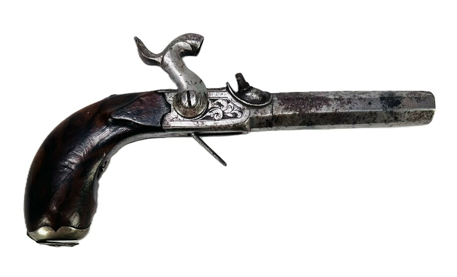 Klein percussie zakpistool in 19e-eeuwse Biedermeierstijl, circa 1840–1860, met walnoothouten greep en gegoten metalen kolfkap. Gesmeed percussieslot met vouwtrekker, achtkante loop en gegraveerde kast. Gesigneerd met Luiks merk ‘ELG’ in ovaal bij de kamer. Decoratieve kolfkap met zwijnenkop en jachtattributen, plus scharnierend dopvak; ontworpen voor persoonlijke verdediging. Compacte afmetingen, geprofileerde greep, Europese vervaardiging, typisch voor Luikse productie.