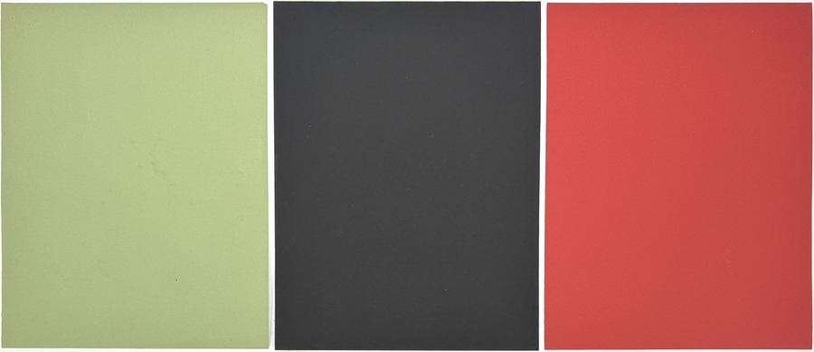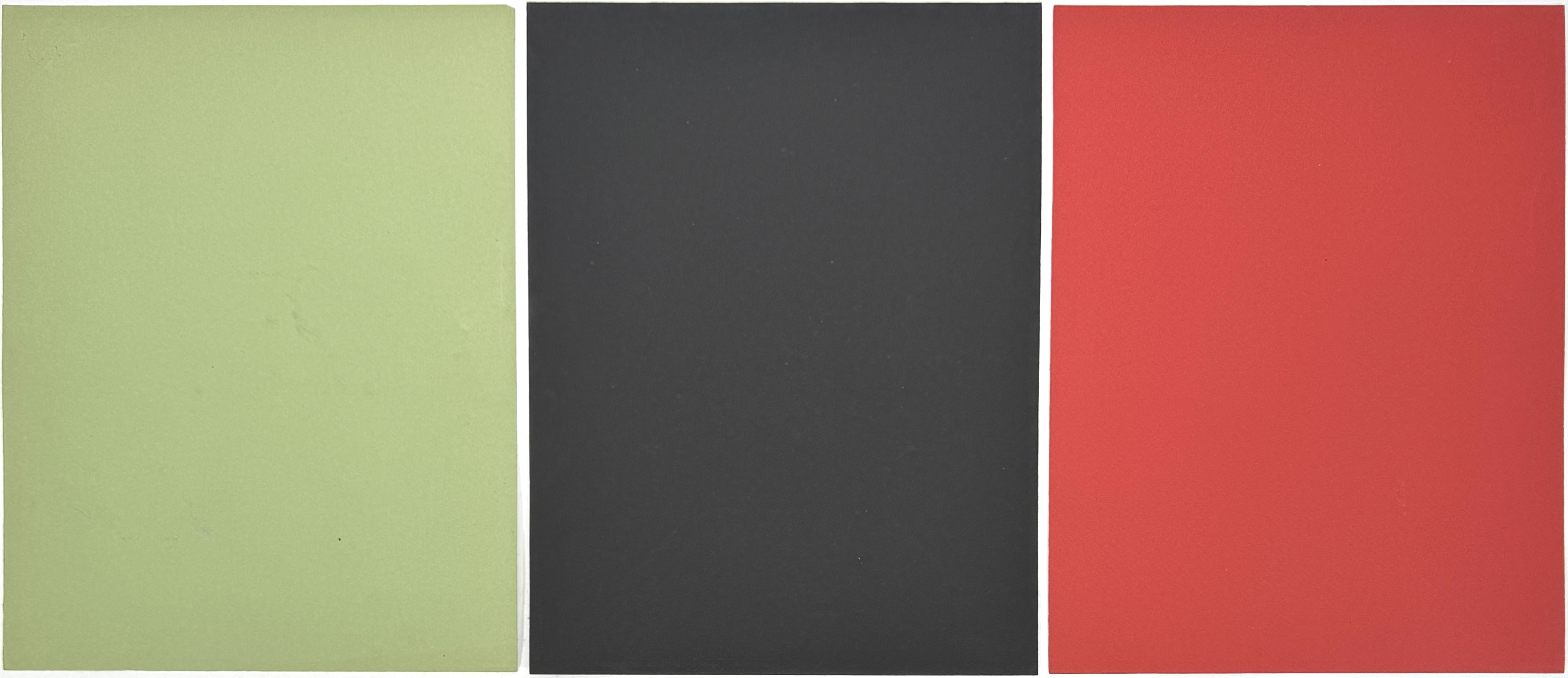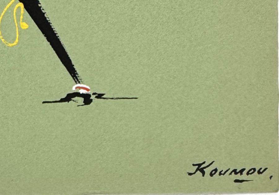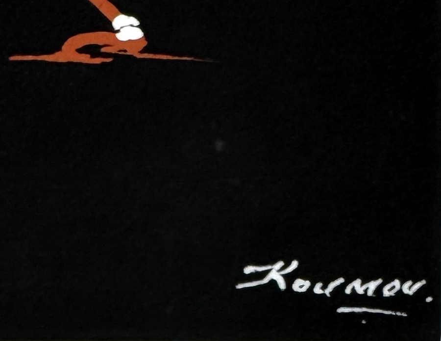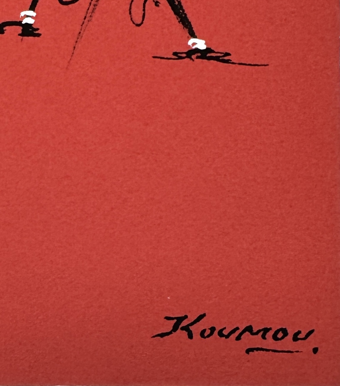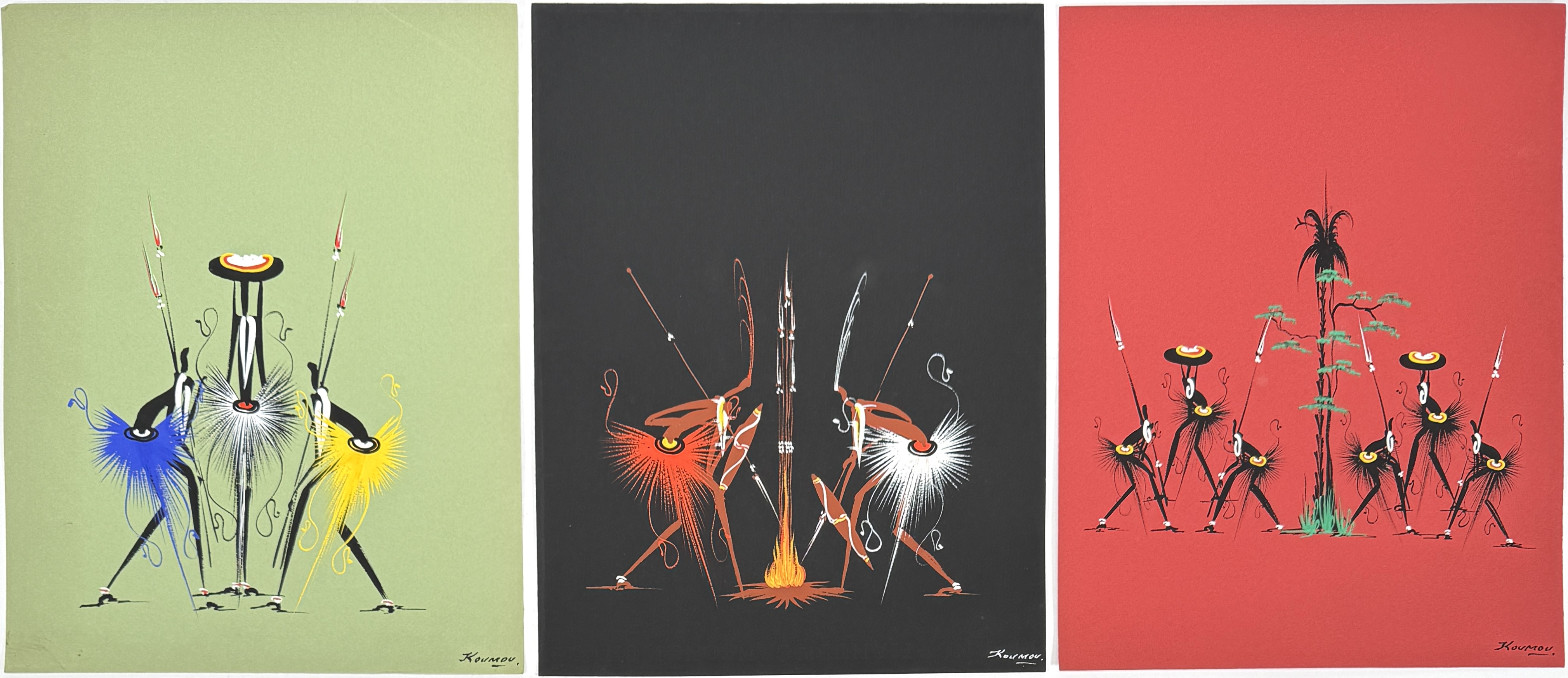 Drie tekeningen van Koumou uit circa 1955–1965 uitgevoerd op groen, zwart en rood gekleurd karton. Voorstellingen van gestileerde Afrikaanse krijgers met speren en schilden, in symmetrische opstelling en met felgekleurde accenten. Alle drie rechtsonder gesigneerd “Koumou”. Eerst de tekeningen zien voordat je biedt? Bezoek onze kijkdagen op 29, 30 en 31 augustus van 11:00 tot 17:00 uur! |