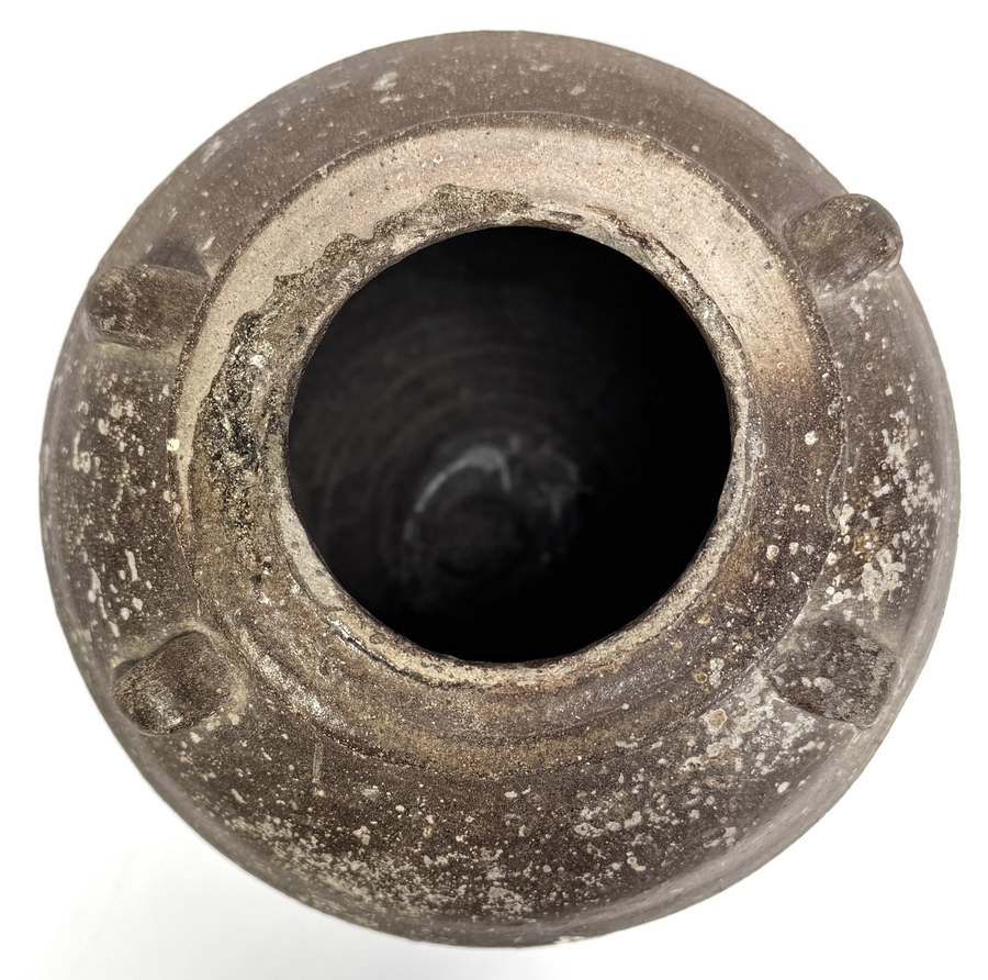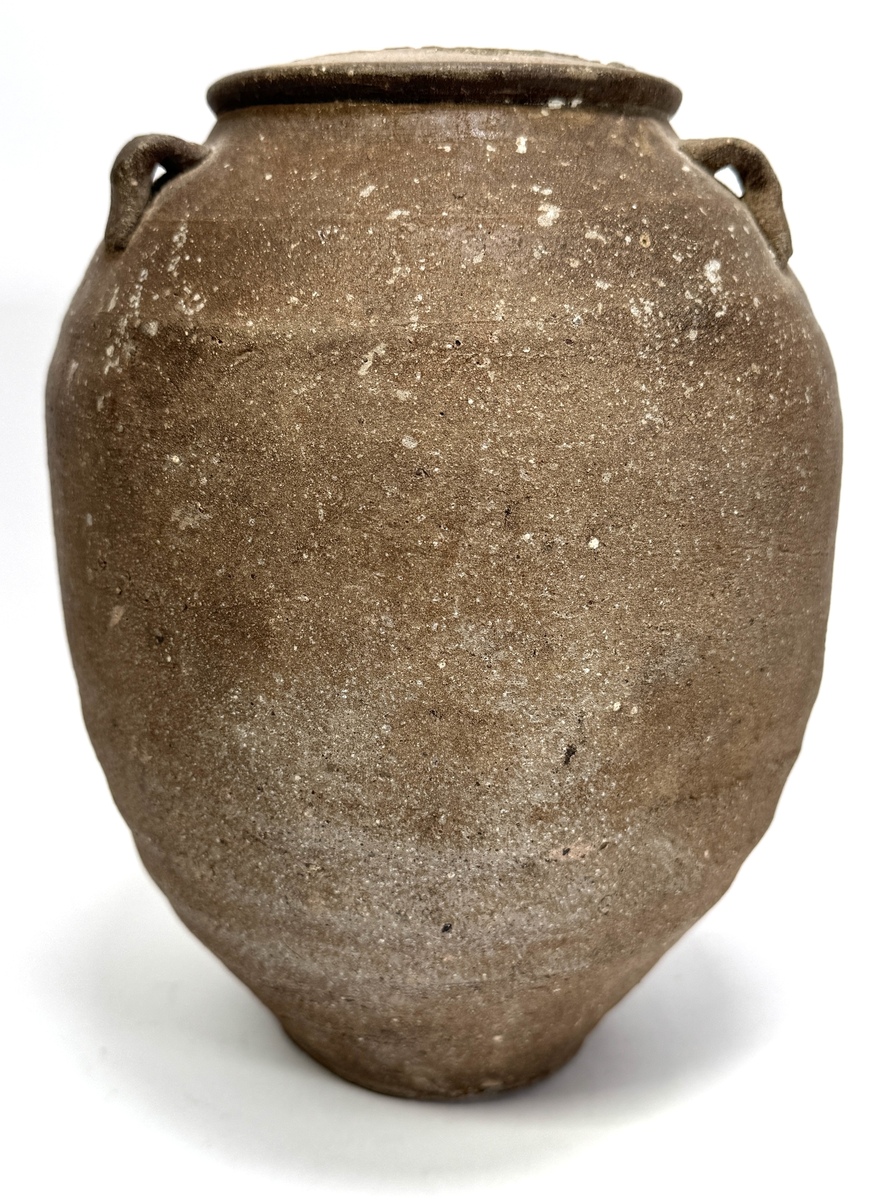 Steengoed pot met zoutglazuur, 19e eeuw, handgedraaid en uitgevoerd in rustieke functionele stijl. De pot heeft een bolvormig lichaam, smalle mond met verdikte rand en twee kleine aangezette handvatlussen op de schouder. Het oppervlak is ongelijkmatig bruin met witte aanslag en sporen van ouderdom. Ontdek dit object en voeg het toe aan uw collectie! |