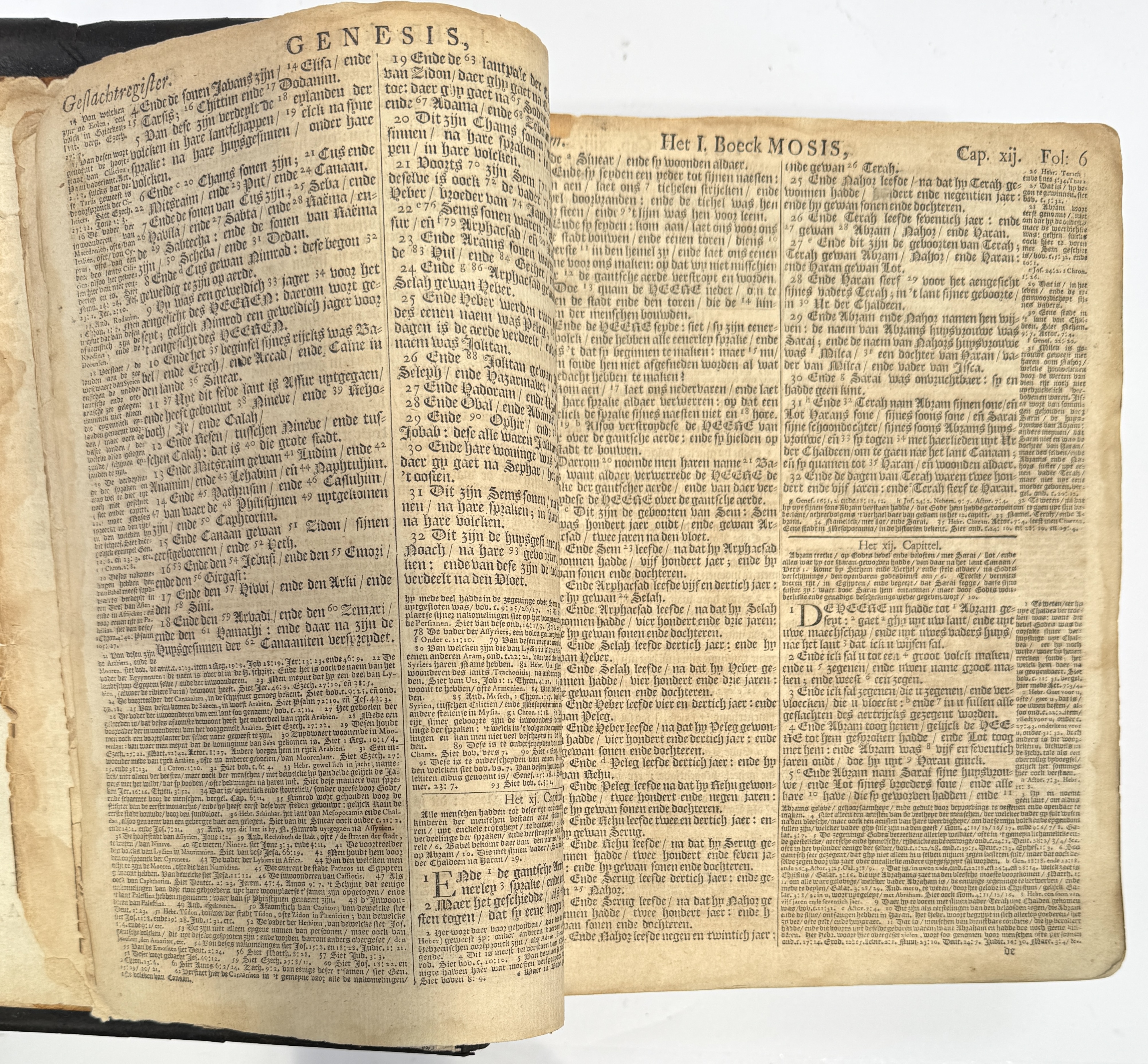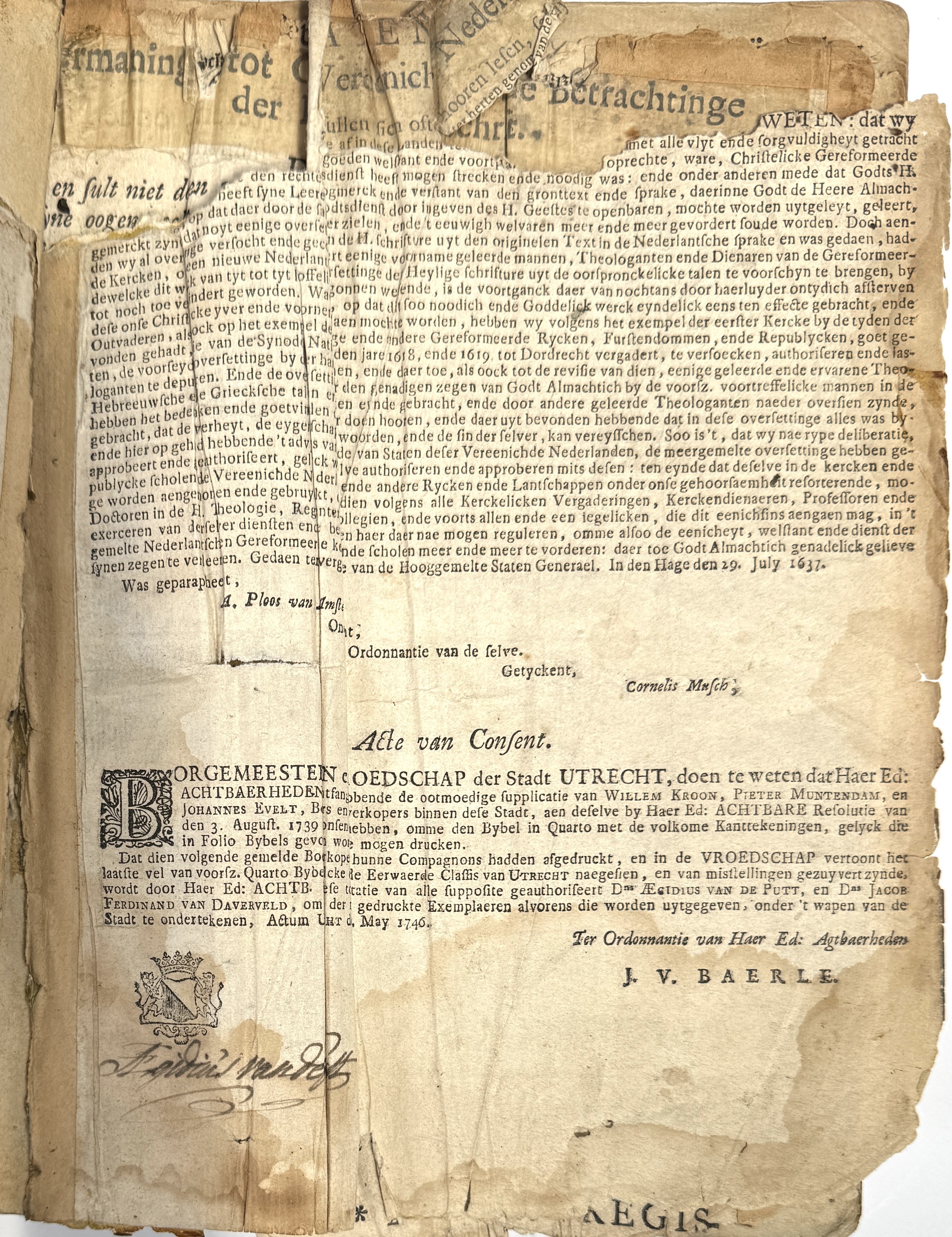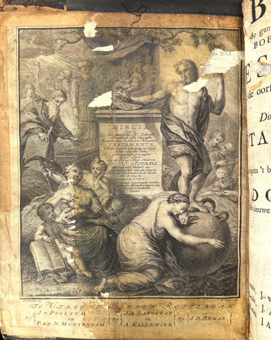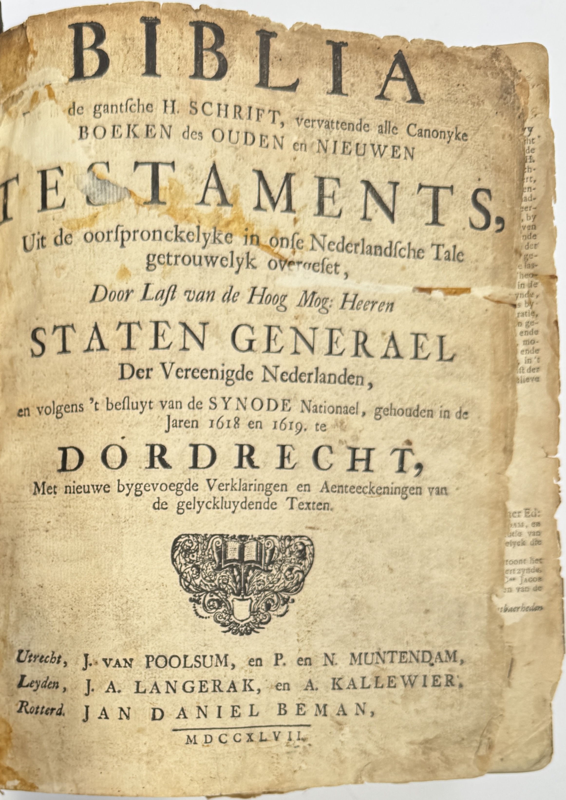 Statenbijbel, gedrukt in 1747 door o.a. J. van Poolsum, P, N. Muntendam en Jan Daniel Beman. In leer gebonden met koperen sloten, rijk geïllustreerd met gravures en uitgebreide kanttekeningen. Met “Acte van Consent” uit Utrecht 1740. Direct deelnemen? Plaats vanaf 22 augustus alvast een bod via onze website! |