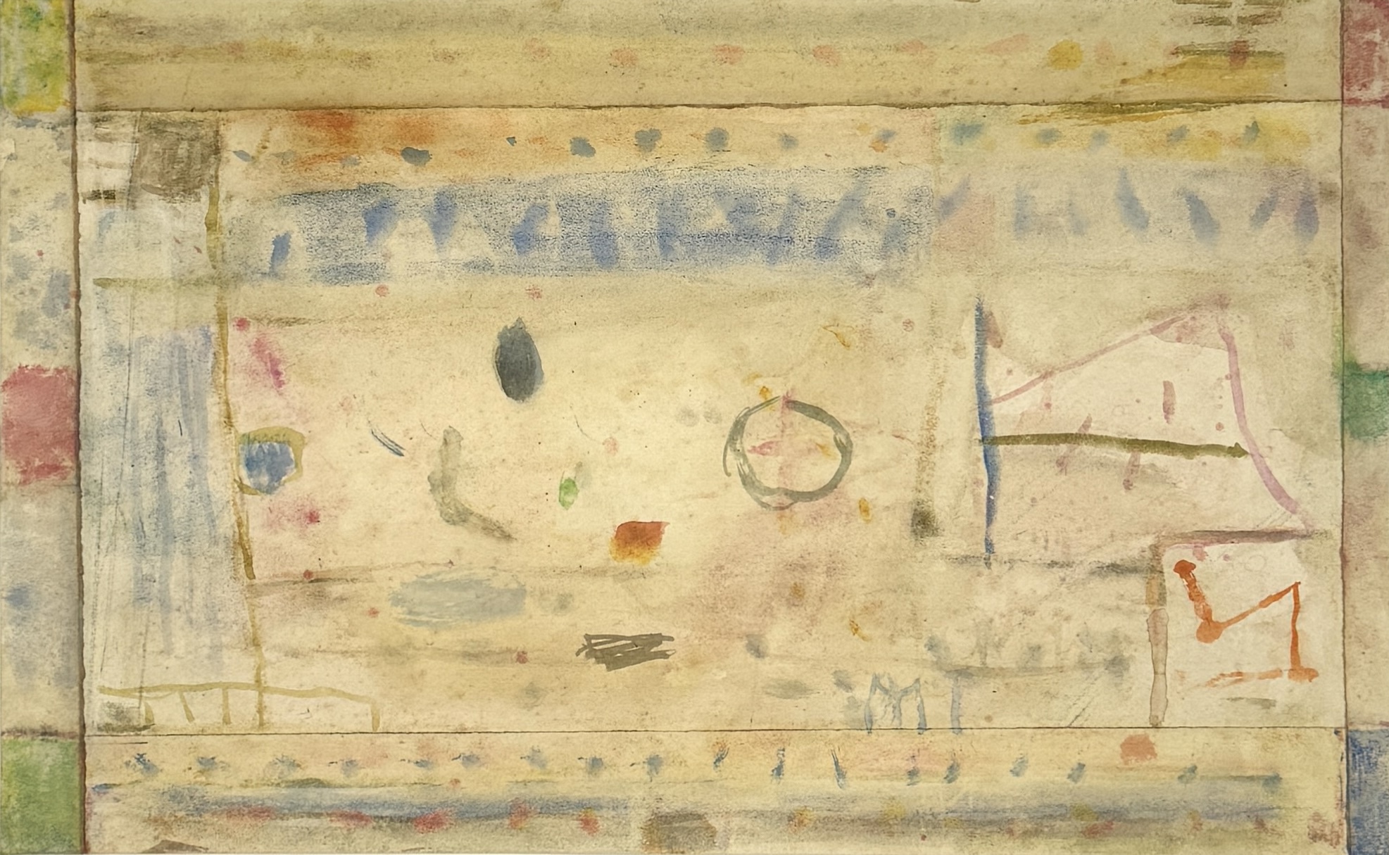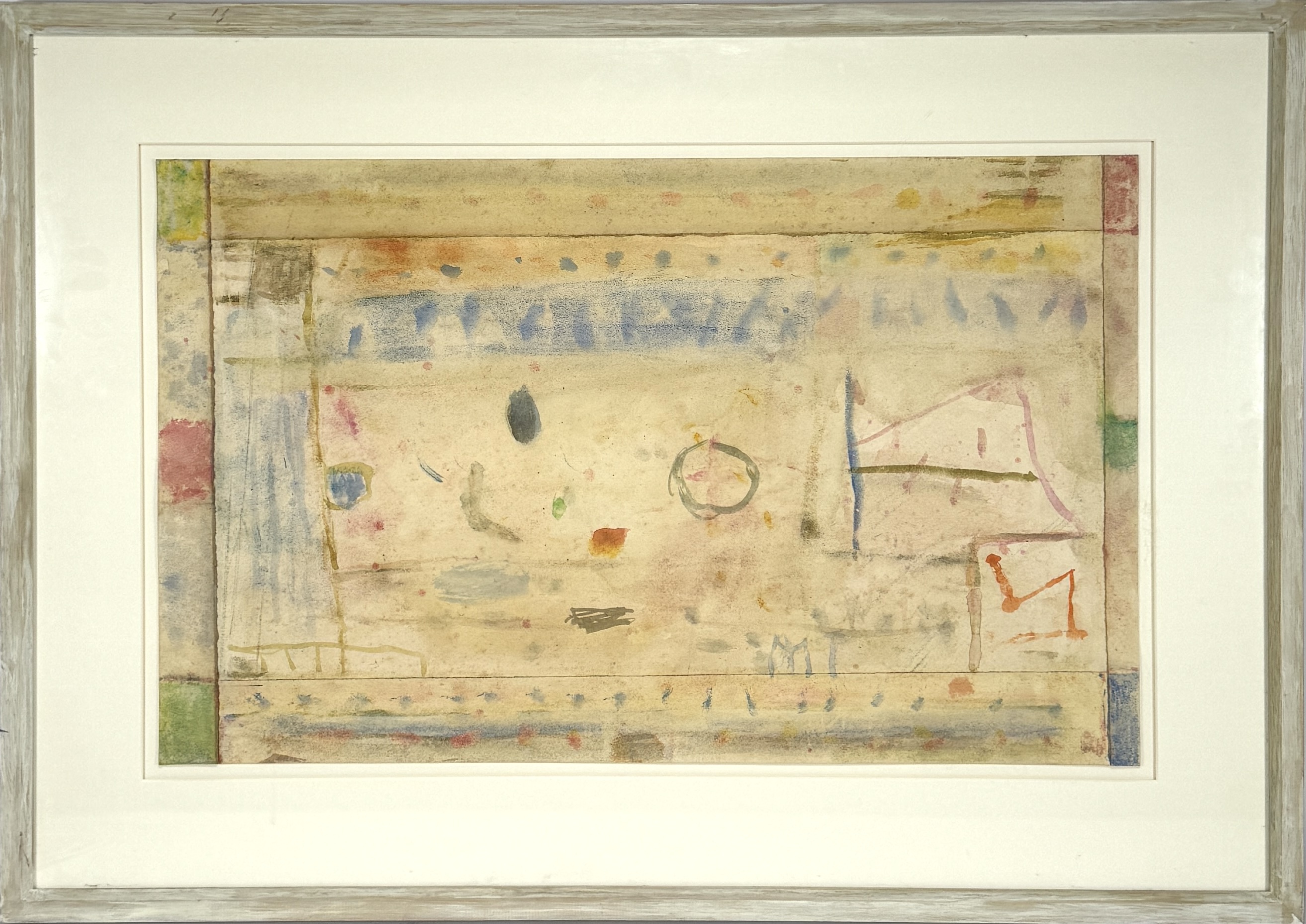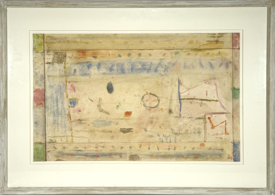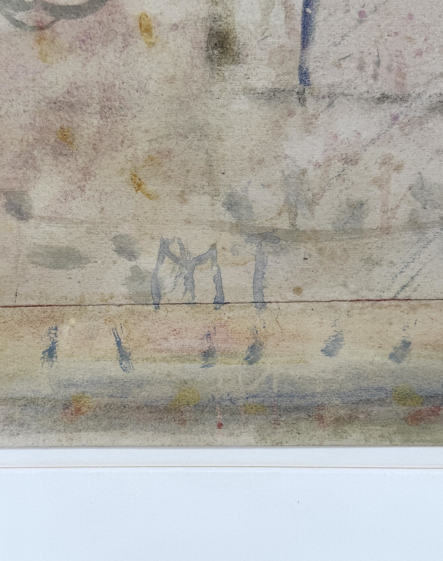 Aquarel op papier van Martin Tissing (1936–2018), getiteld "Sterrenveld", januari 2009. Uitgevoerd in lyrisch-abstracte stijl met transparante verfvlakken en subtiele lijnen in zachte, dromerige tinten. Achterzijde handgeschreven informatie door de kunstenaar. Rechtsonder gesigneerd met monogram "MT".